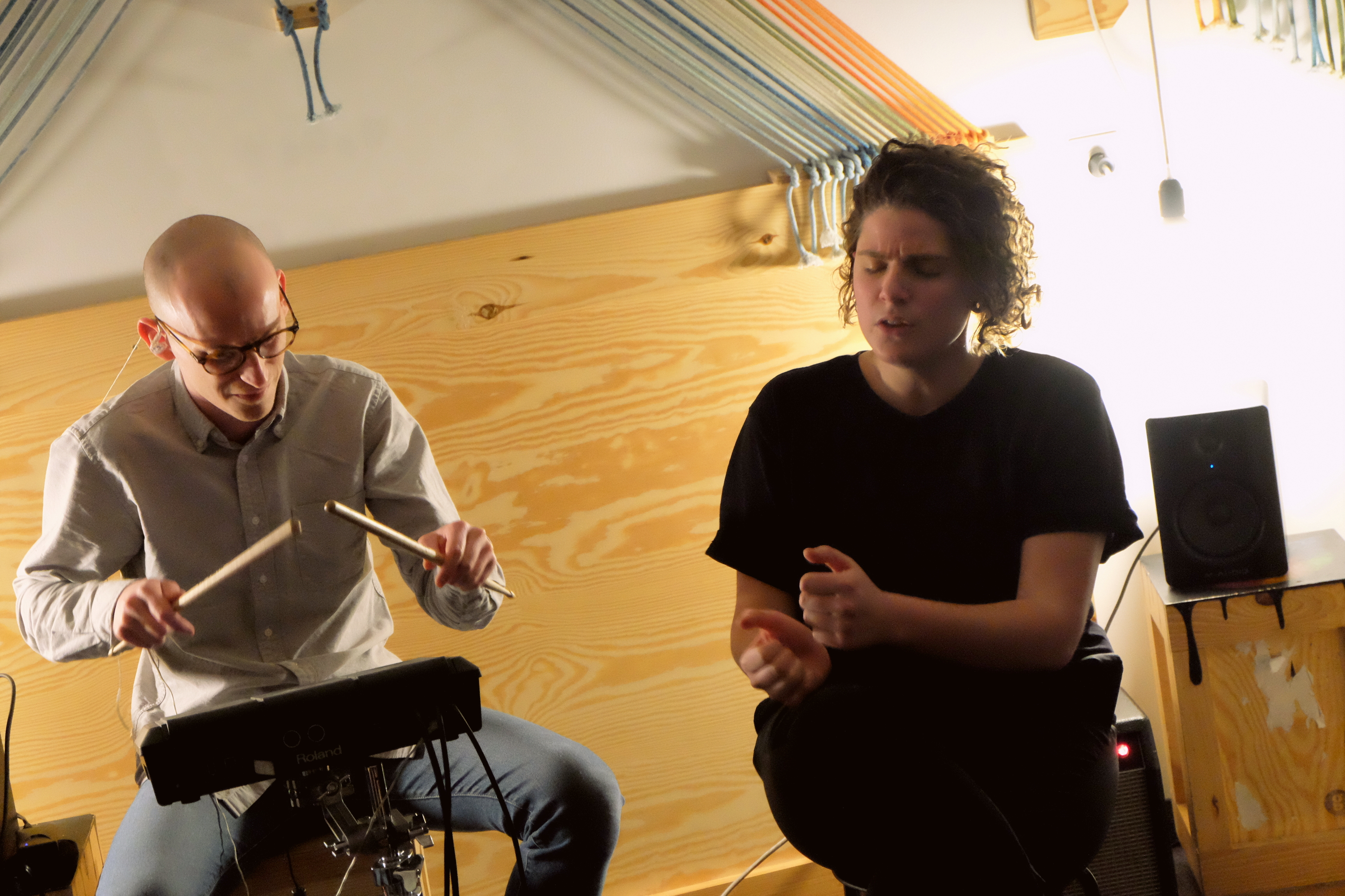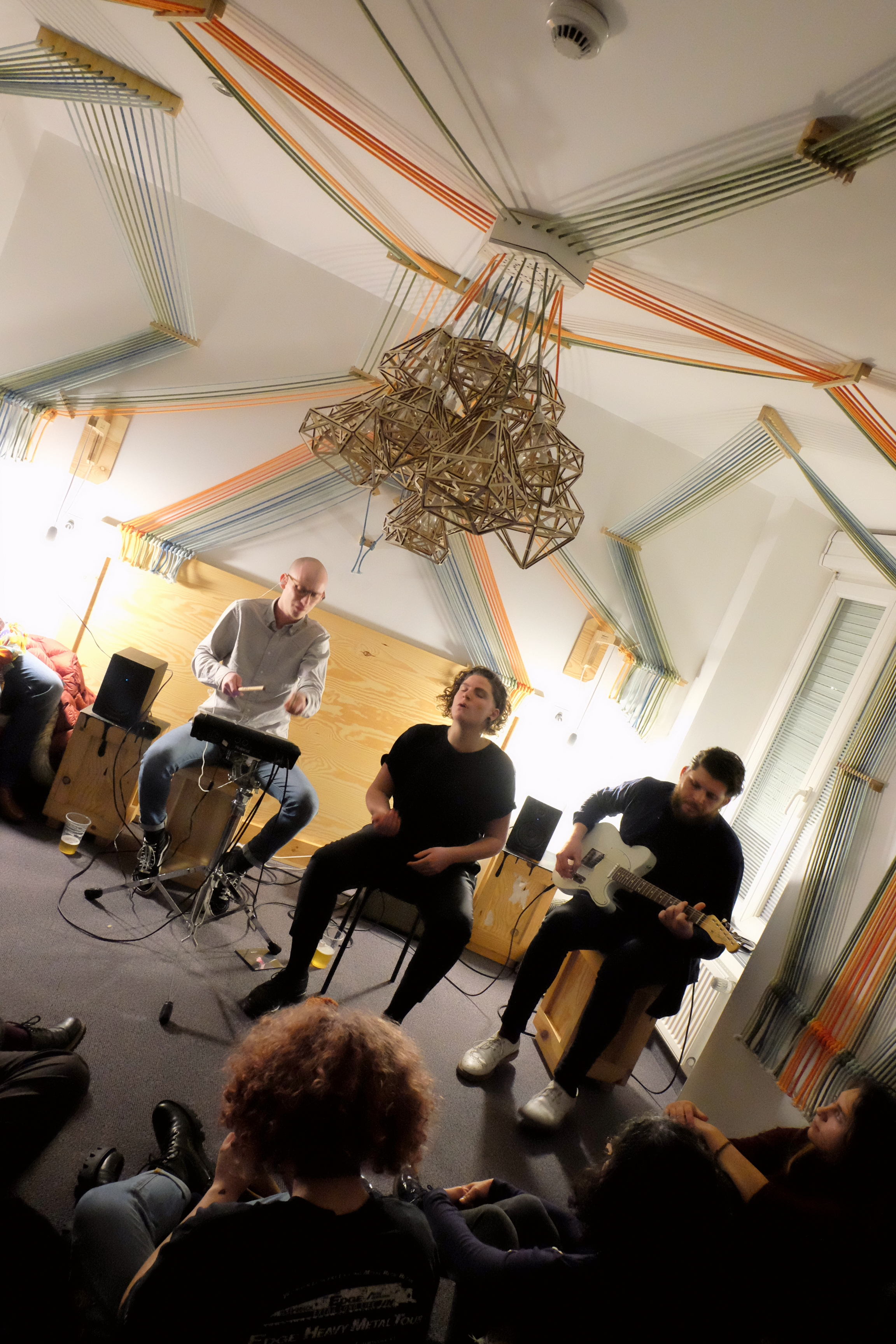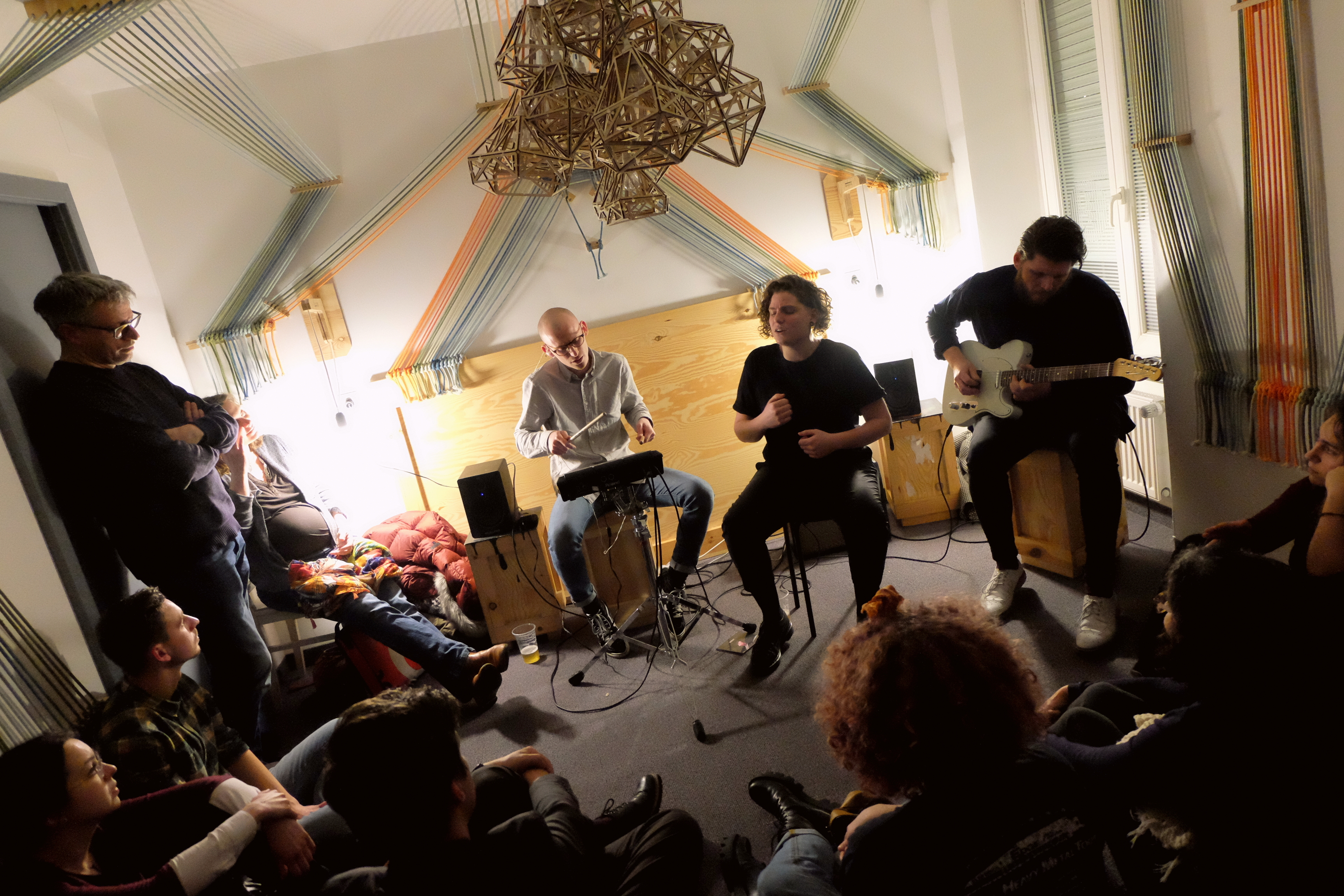 Clairement la chambre la plus ouf des 3. Les cordes tirées sur les murs et le plafond, et le merveilleux lustre en bois donne un aspect tellement graphique à la pièce… Ça colle bien à la pop française de Claire Faravarjoo. Tu l’as peut-être découverte il y a 2 ans dans The Voice. Ou peut-être avec le prix Ricard S.A Live, dont elle est l’une des 10 finalistes de cette année. Moi, je l’avais vue pour la première fois avec son groupe à la fête de la musique 2017. À ce moment-là, je m’étais dit que sa musique, cette pop teintée d’électronique, paroles en français et rythmes dansants, était pile dans la tendance. Je n’ai pas changé d’avis ce soir. Mais je vais avouer que j’ai préféré la voir comme ça, sans micro, avec ses 2 musiciens en toute simplicité, plutôt que dans un contexte où elle pousse sa voix un peu plus. Elle finira par faire se lever tout le public pour une mini-teuf sur K.O.