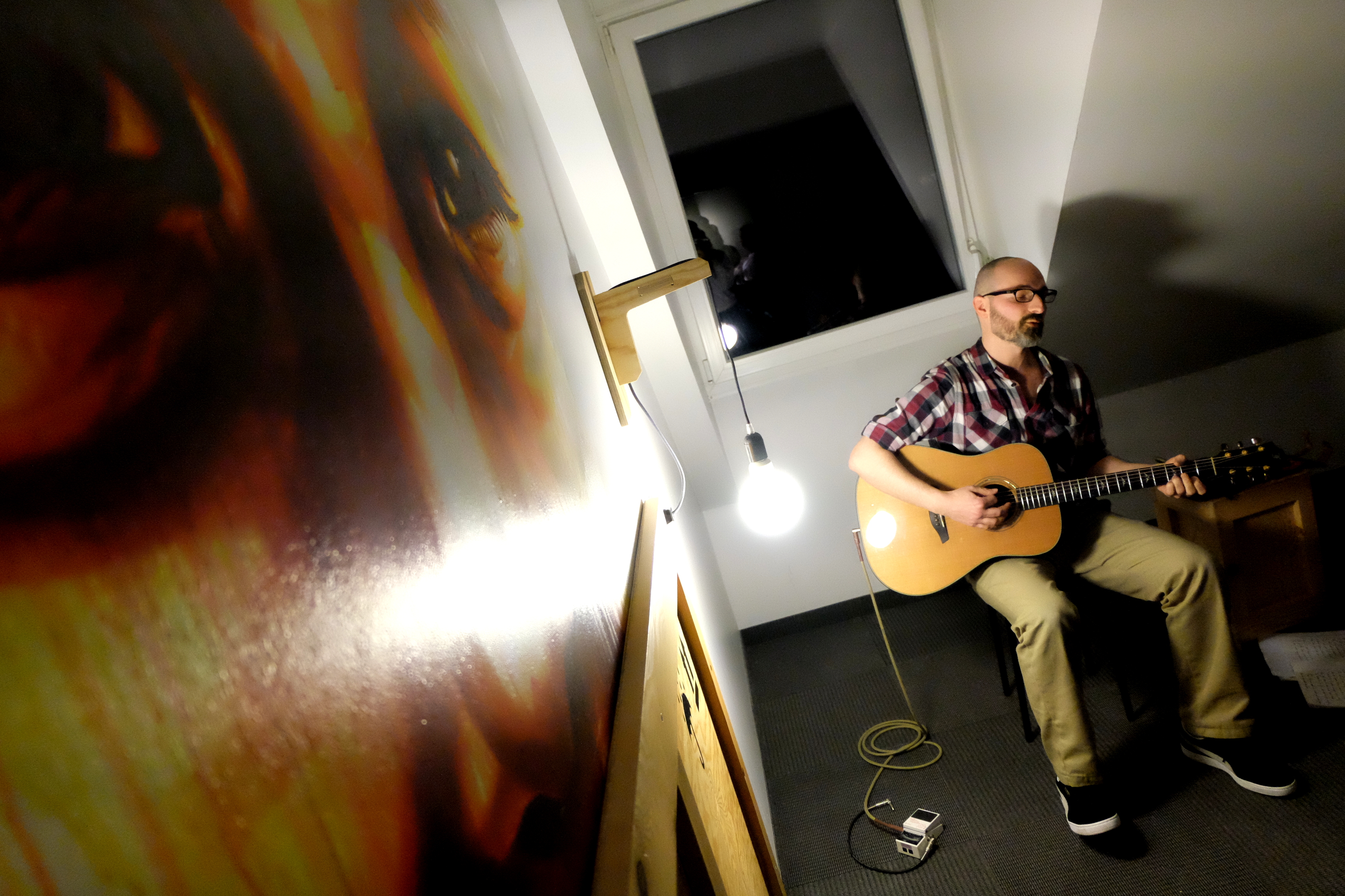 On enchaîne deux étages plus haut sous les yeux peints du street artiste DAN 23. Thomas Schoeffler Jr joue un peu “nu” ce soir. Guitare sèche, harmonica et c’est tout. Pas de stomp box pour le one man band qui allume tous ces sets à coups de pieds bien placés d’habitude. Conséquence : petite setlist remaniée pour l’occasion, avec “que” des chansons tristes et sombres. Mais beaucoup d’humour au milieu, toujours. Moi ça me va très bien. Pour l’occasion, on entend même des petites pépites anciennes. Alors forcément, ça envoie moins qu’à l’accoutumée, mais la douceur d’une reprise de Bob Dylan, ça n’a pas de prix (“Nothing ‘cept You”). Thomas Schoeffler Jr. ne résiste tout de même pas à faire une petite chanson plus rock, avec “Sauerkraut”. Et c’est sur ce rythme un peu plus soutenu qu’on terminera la soirée, comme une invitation à venir voir tout ce beau monde dans d’autres lieux, d’autres conditions, pour poursuivre l’aventure.