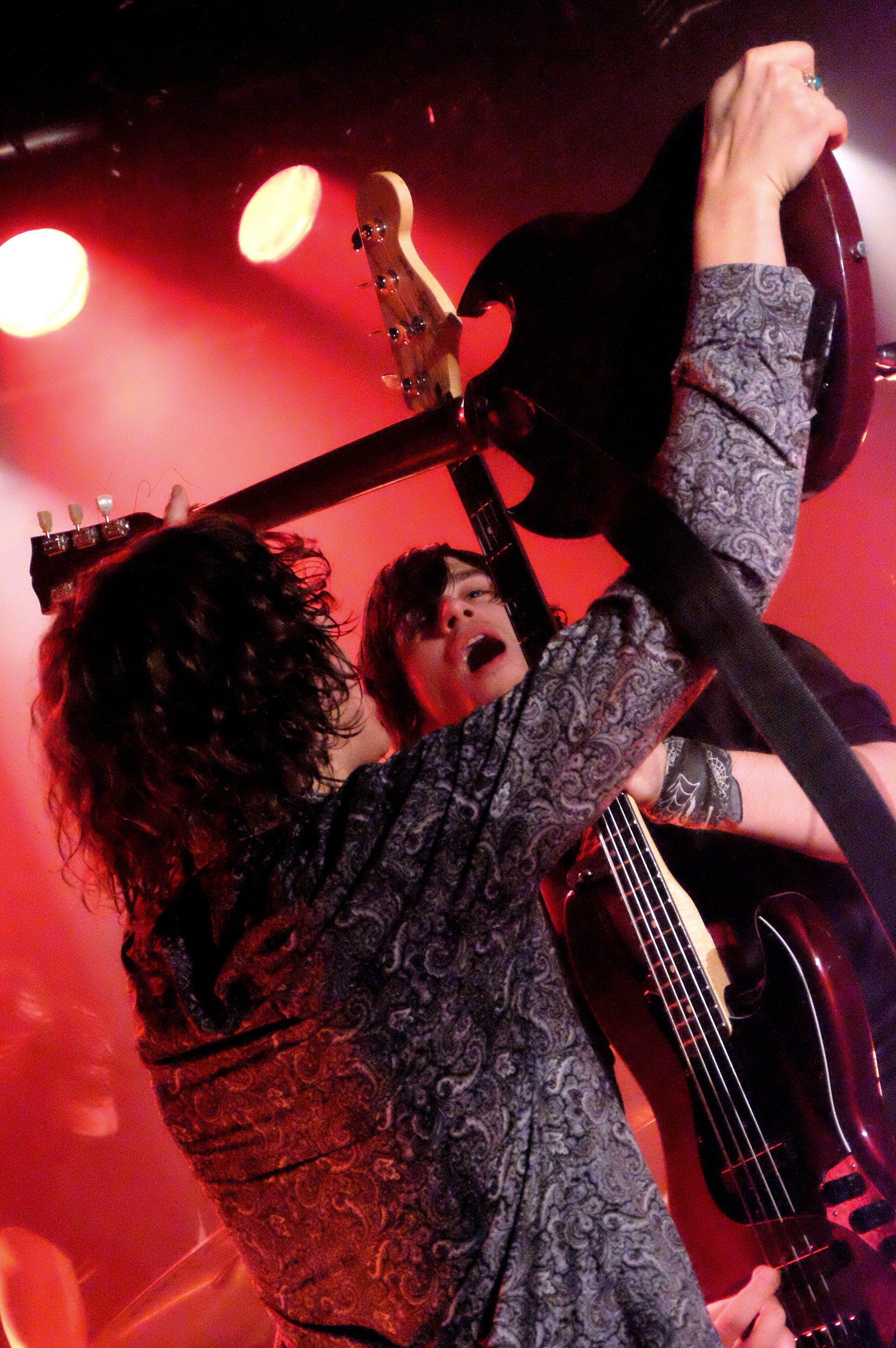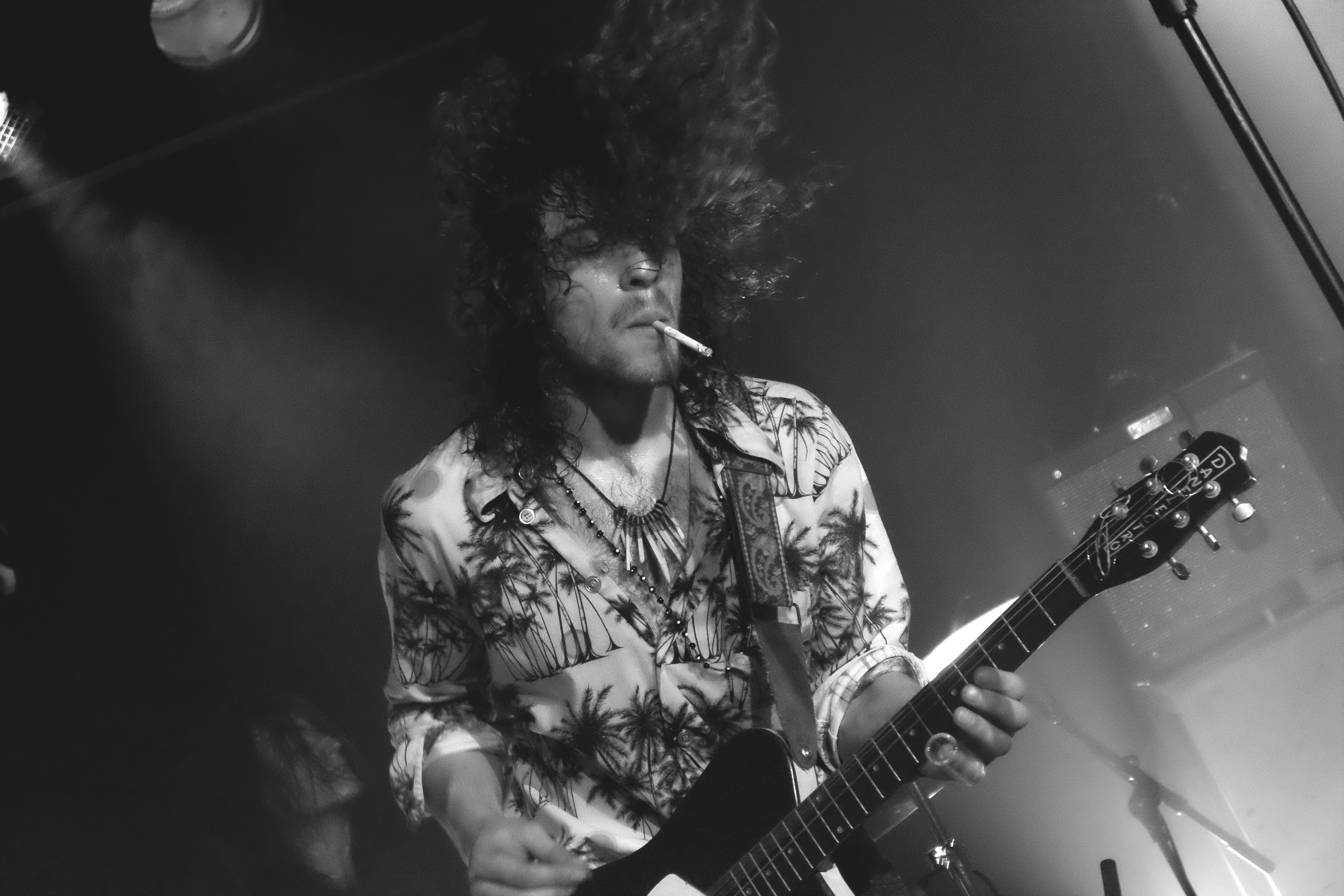 La soirée était d’ailleurs obligatoirement bonne, puisque c’était le duo Bad Juice qui ouvrait au Noumatrouff. Plutôt 60’s que 70’s, leur rock à eux est tout aussi efficace, mais diablement différent de tout ce qui peut se faire en France actuellement. Le blues, le hillbilly et des paroles souvent en français font de ce rock-là une recette imparable teintée de l’impertinence d’une scène punk française. Et on ne peut jamais décrocher ses yeux de la Gretsch parfaite de Thomas ou empêcher son pied de battre la mesure donnée par David. Seul bémol de leur set : cette foutue fumée qui a toujours eu le don de me gêner. J’ai jamais compris l’intérêt des techos à inonder une scène de fumée. Un jour, il faudra m’expliquer.