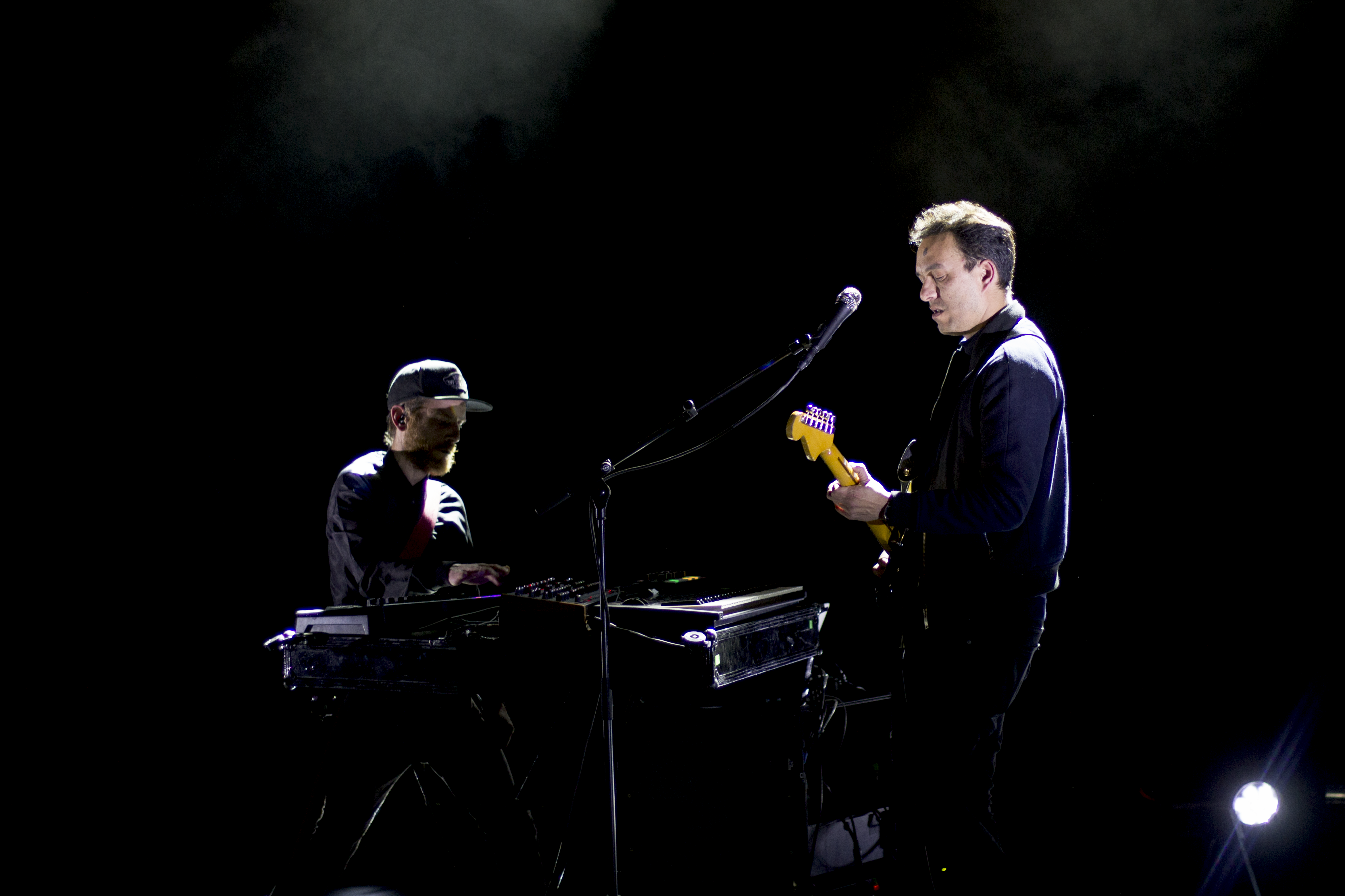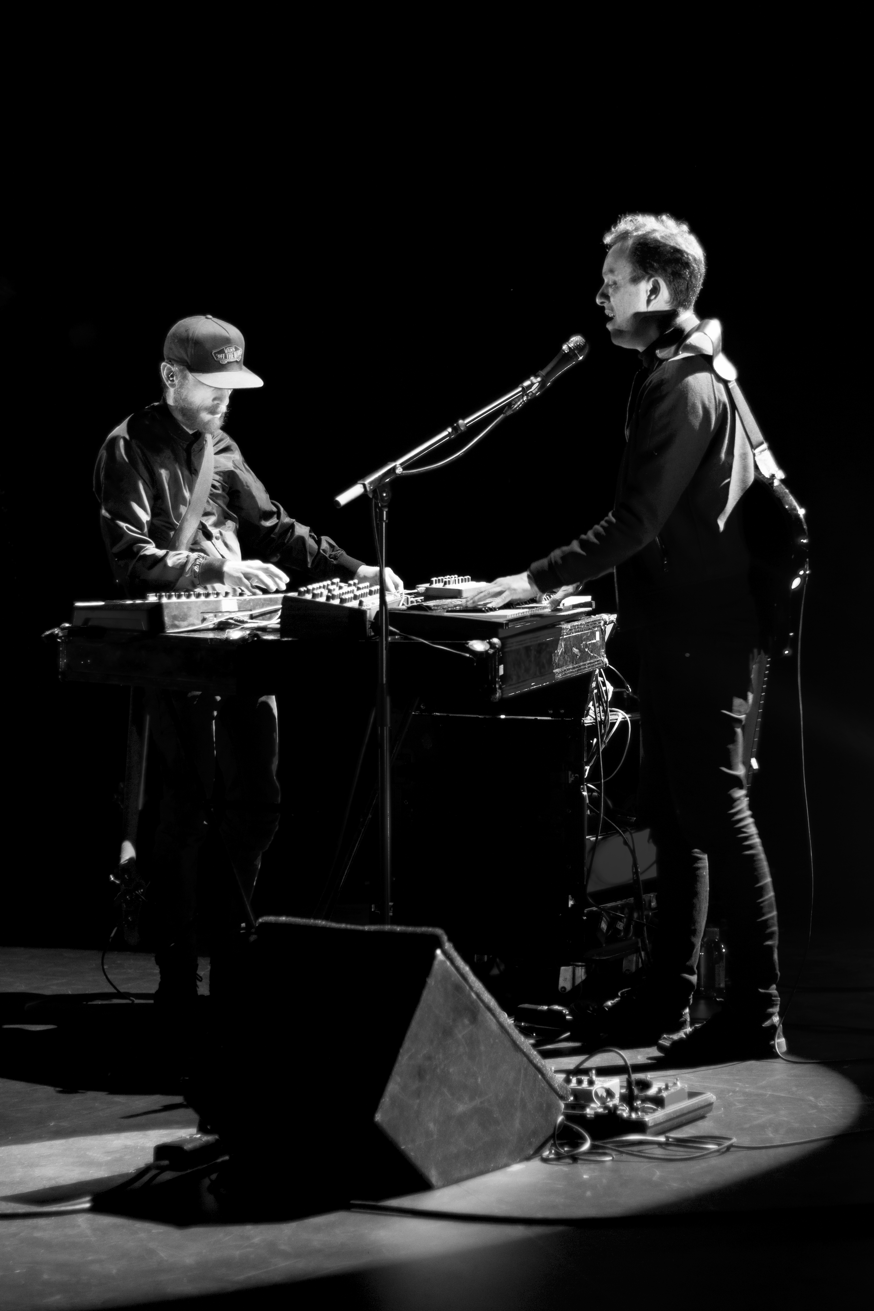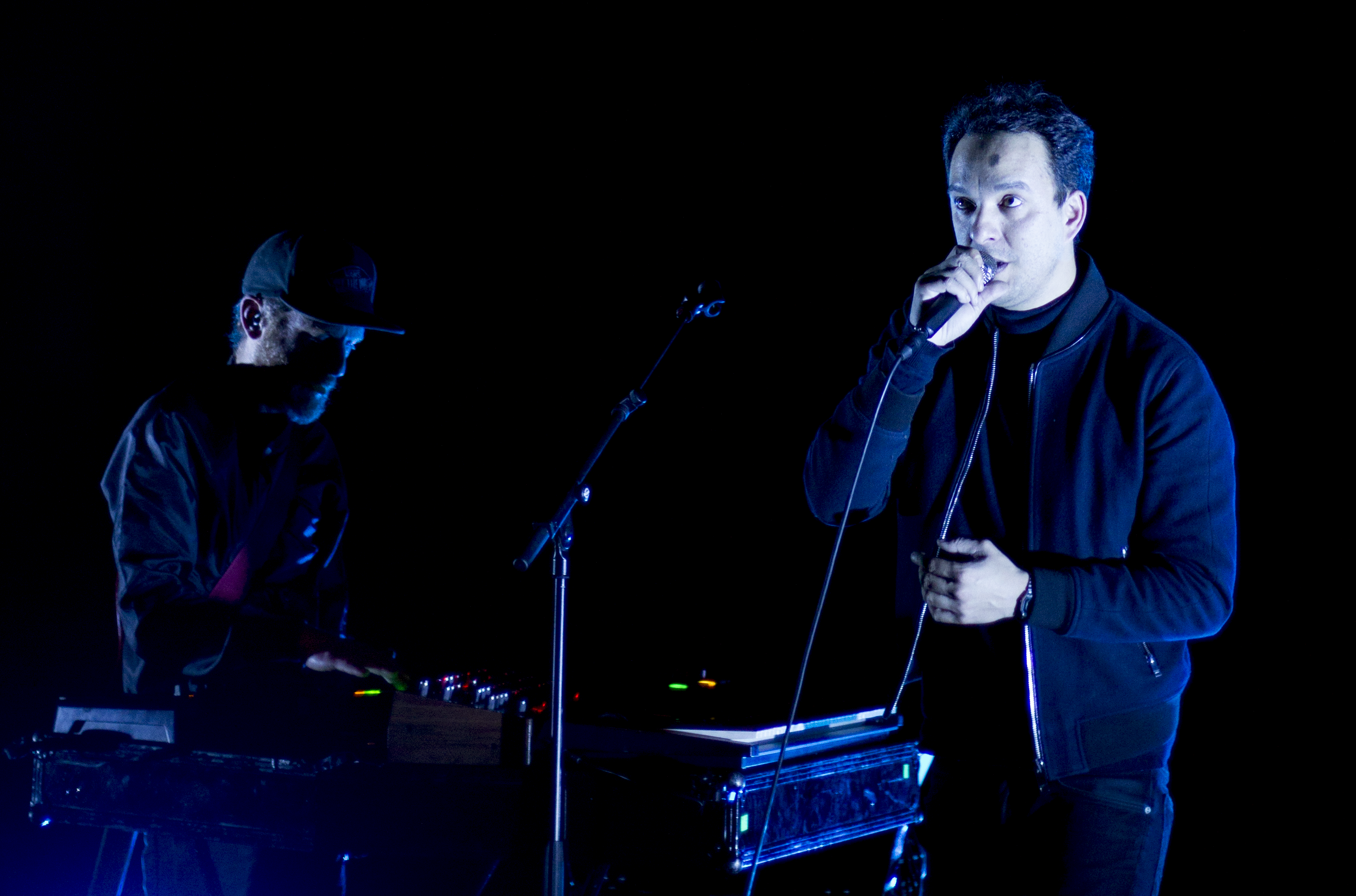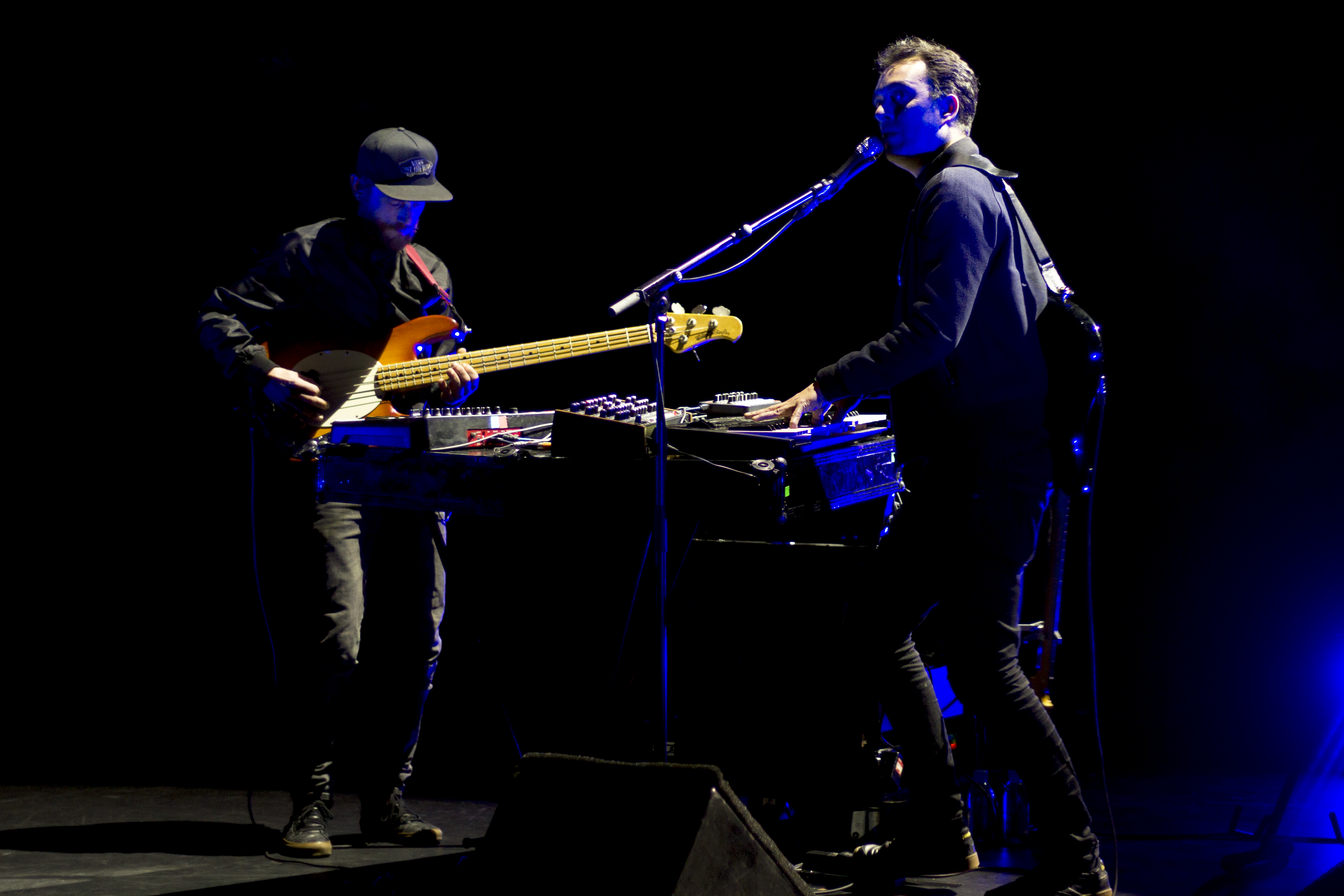 C’est avec “Peur de rien” que Malik Djoudi monte sur scène et clore la soirée. Accompagné de son fidèle bassiste, il a dans son dos une guitare électrique et devant eux, des pads et claviers, pour lancer pistes, rythmes et samples. On sent que le set est travaillé. Les lumières spectaculaires donnent aux titres grandeur et intensité. Sur “Cinéma”, c’est un effet stroboscope, sur d’autres une lumière sombre rouge et parfois des colonnes de lumière blanche se croisent éclairant dans la pénombre leurs visages concentrés. À l’écoute, le public n’est pas en reste. La voix aiguë de Malik Djoudi est douce et pénétrante. On l’aime particulièrement sur “Sous garantie”. Elle se fait aussi percutante et rythmique, notamment sur “The American”. Les deux garçons parviennent à faire hocher les têtes du public attentif.