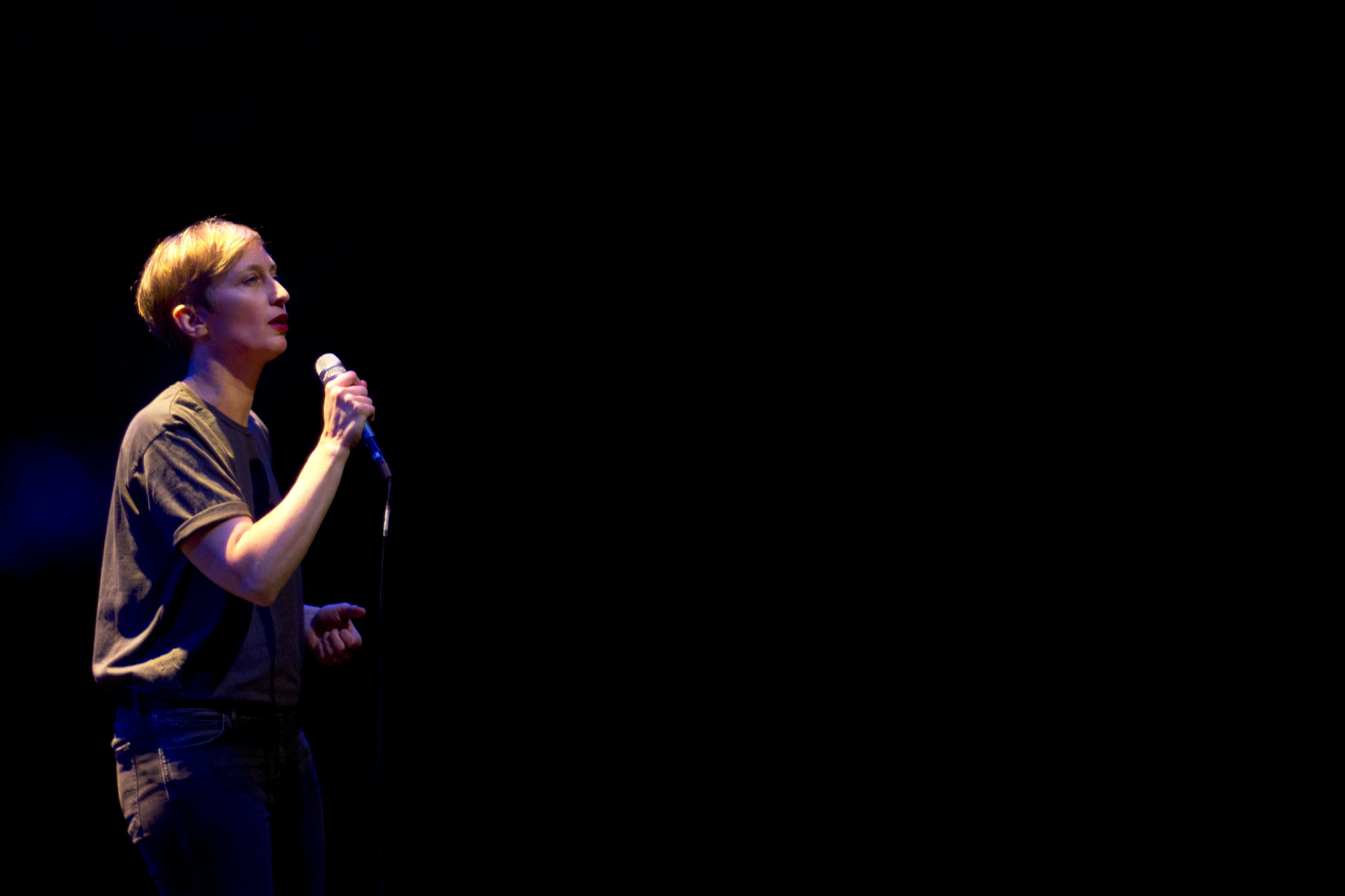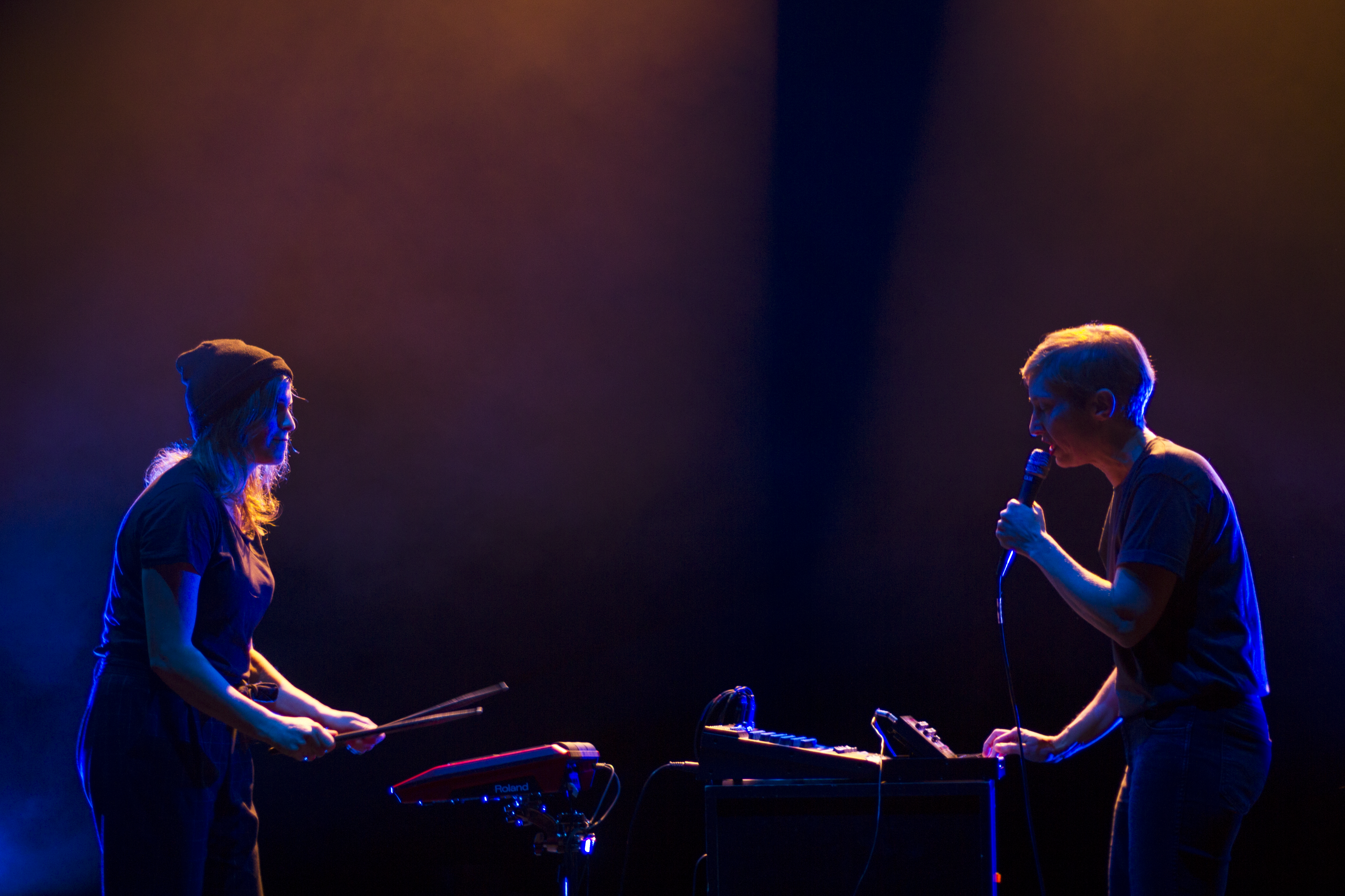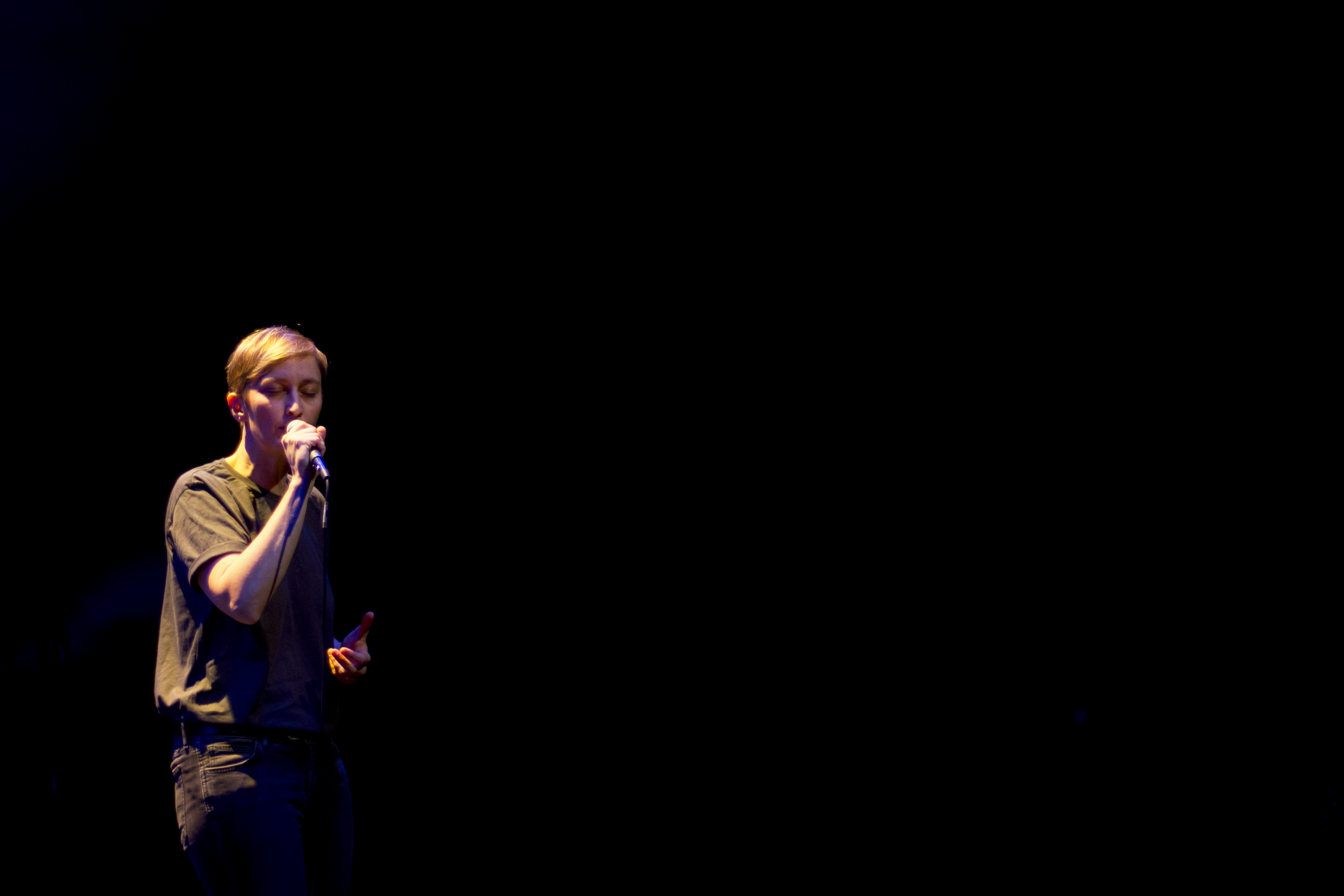 Vale Poher, accompagnée d’une percussionniste électronique, prend la suite de la soirée. Jouant les titres de son premier album, Pacific Peplum sorti novembre 2017, elle parvient à faire se lever et danser le premier rang, déjà conquis. Elle chante en français les histoires d’amour (“Synchrone”, “Péplum”)) et le monde contemporain, (“Splendeur aléatoire”, “la correspondance”). Elle revisite le titre d’Alain Souchon, “Ultra-moderne solitude” avec brio et laisse flotter dans la salle une ambiance apaisée.