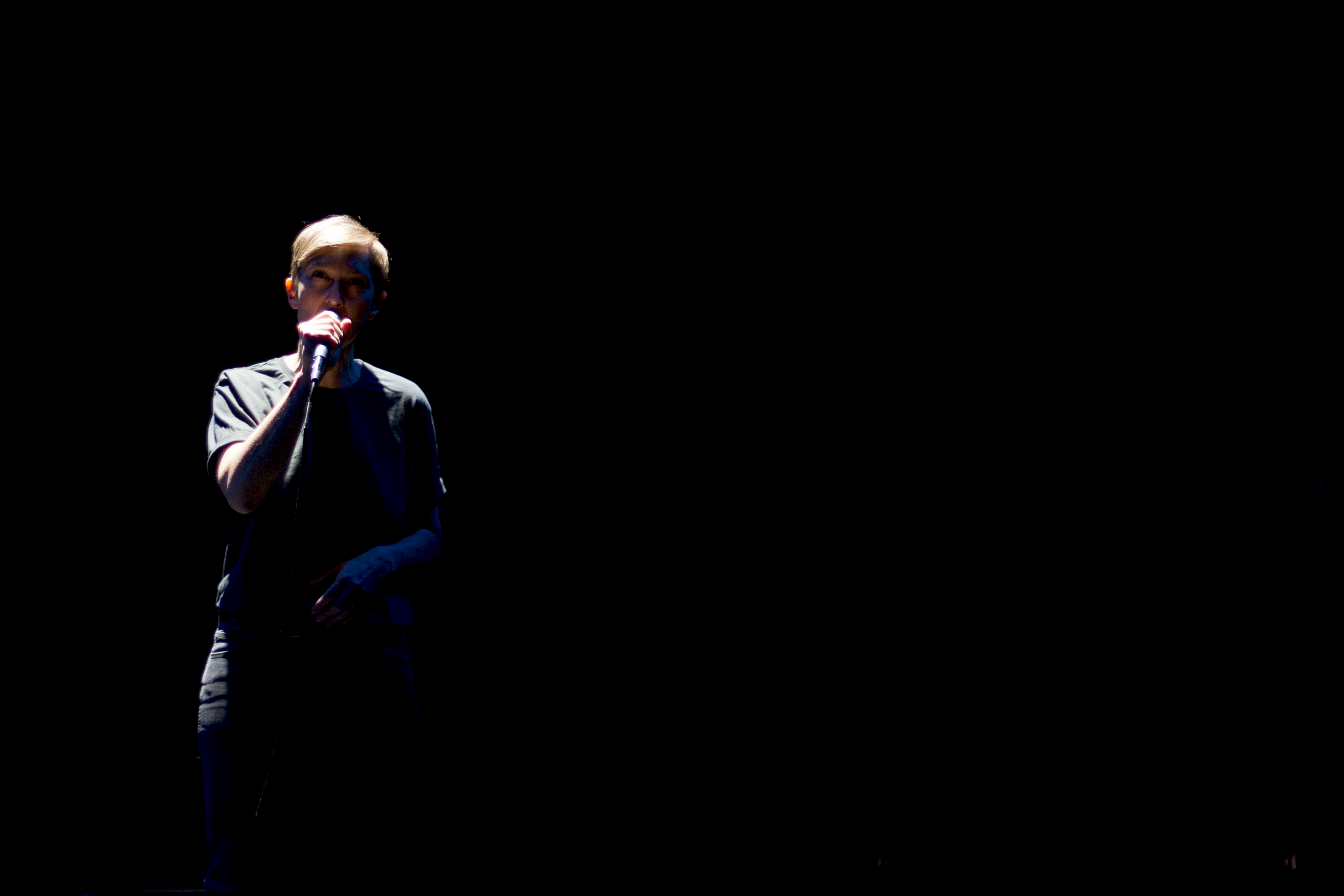 C’est Titus d’Enfer, revisitant en solitaire la Cène derrière sa grande table rouge, qui ouvre la soirée. Lorsque les lumières s’éteignent, il apparaît le sourire espiègle, et lance ses premiers samples. La musique se prête au lieu à merveille, contemporaine, conceptuelle, pas toujours très lisible mais faisant naître le débat. Sa voix, aiguë, de tête, ne semble pas être prise au sérieux par l’artiste lui-même. Titus d’Enfer fait le show, courant vers le public sagement assis sur les gradins, invitant un spectateur à l’assister sur un morceau, recevant une rose d’une petite fille, interrompant ses pistes pour préciser au public qu’il doit être attentif pour le refrain qui suit. On retiendra surtout le dernier morceau, “Honey”. Il ne fera pas l’unanimité auprès du public ce soir, mais il aura au moins su faire parler de lui et questionner l’idée de musique… ou d’anti-musique.
