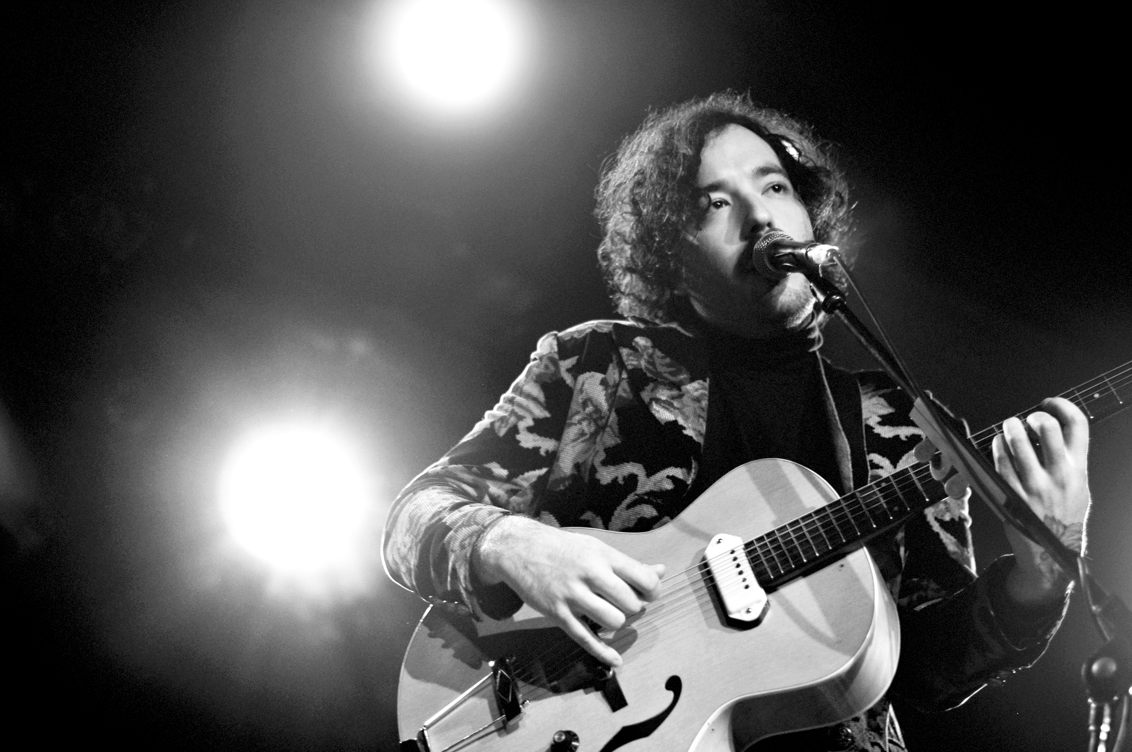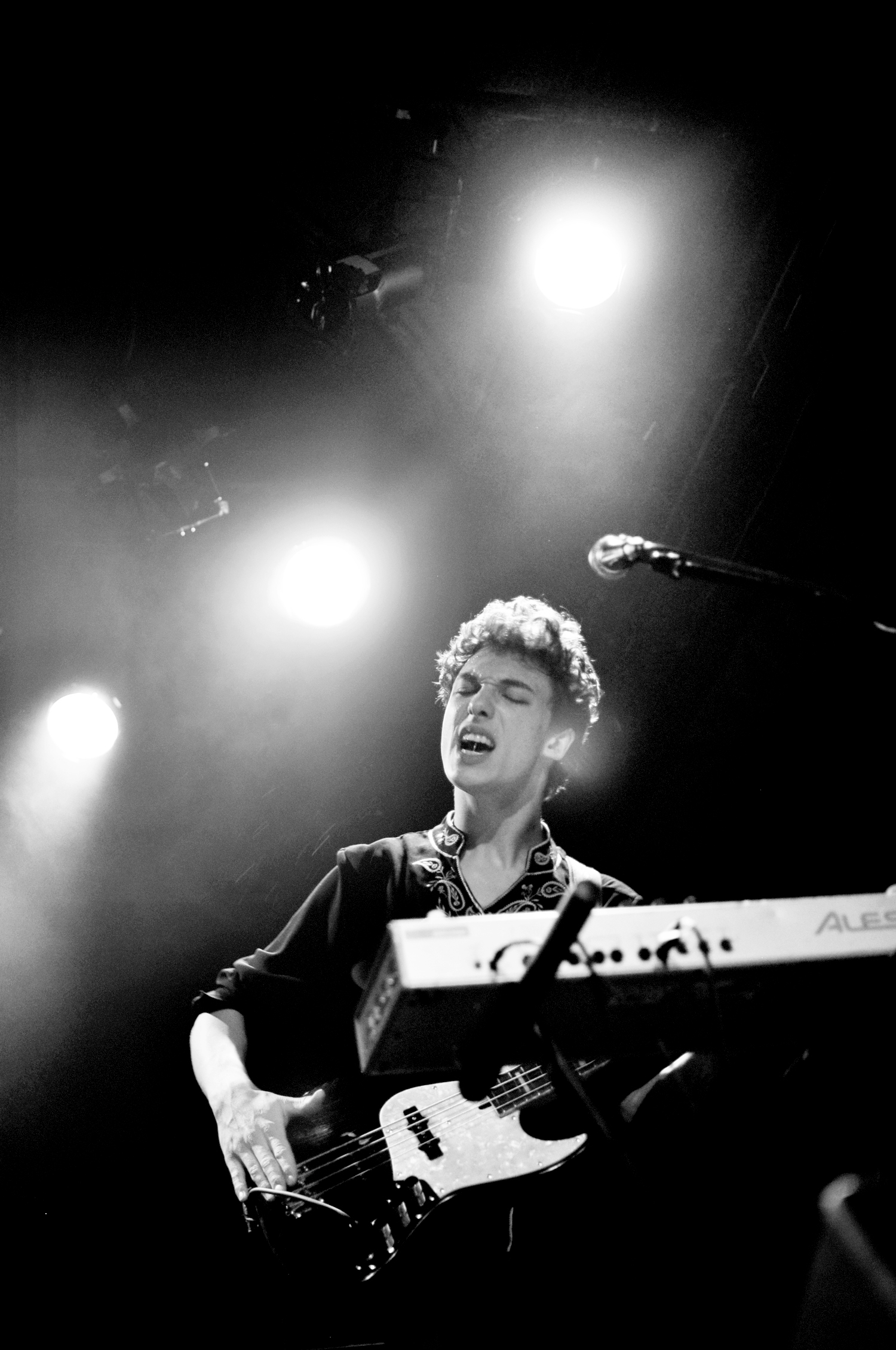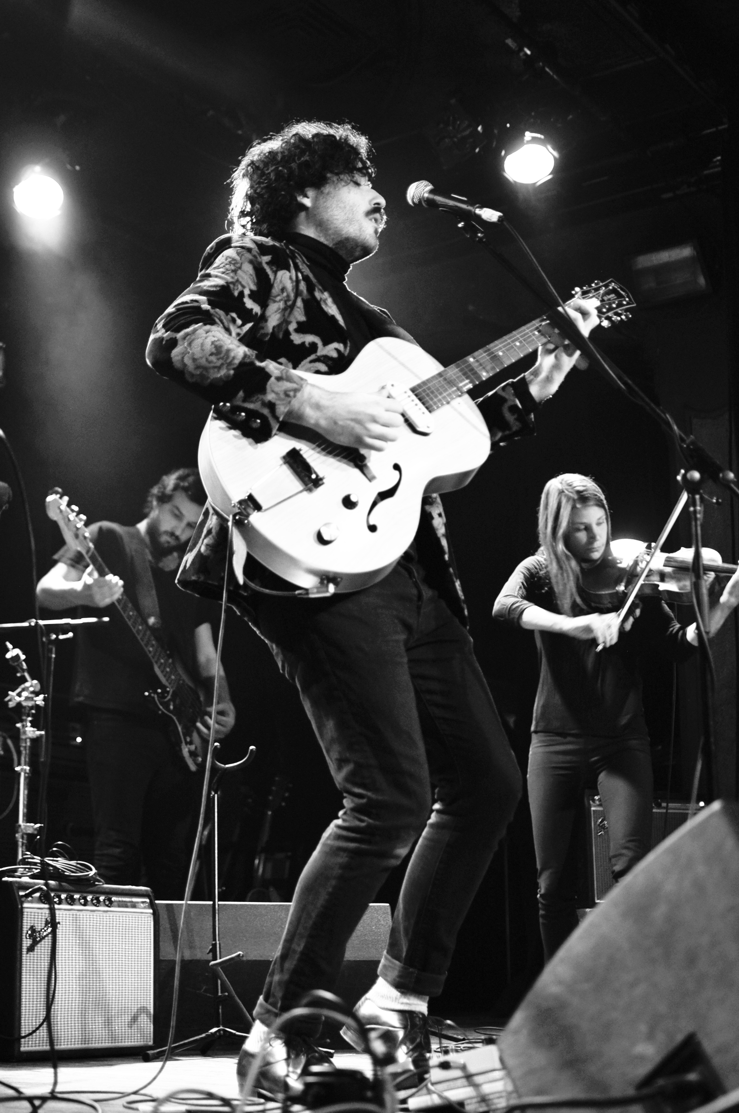 Le premier artiste en lisse c’est Mathieu Bérubé. Un nom qui ne nous est pas inconnu. Des airs de dandy parisien moustachu avec ses derbys, son blaser fleuri et un jean découvrant ses chevilles. Un timbre de voix plein de nuances, faussement nonchalant, qui vibre, s’étire et chante la mélancolie folk-rock très joliment sur des tempi lents. Accompagné de quatre musiciens dont une altiste qui s’essaie au thérémine, le Québécois n’en est pas à son coup d’essai ; son deuxième album est prévu à l’automne. Pas très bavard, presque pudique, il semble aux prises avec ses chansons, et ne dévoile des sourires timides que quelques secondes après la fin de chaque chanson. Pourtant musicalement c’est nickel chrome comme on dit dans l’Hexagone. Doux, hypnotisant et extrêmement pansant. Coup de cœur sur le “moment tendre” du show et la ballade “Sainte-Cécile”, patronne des musiciens.