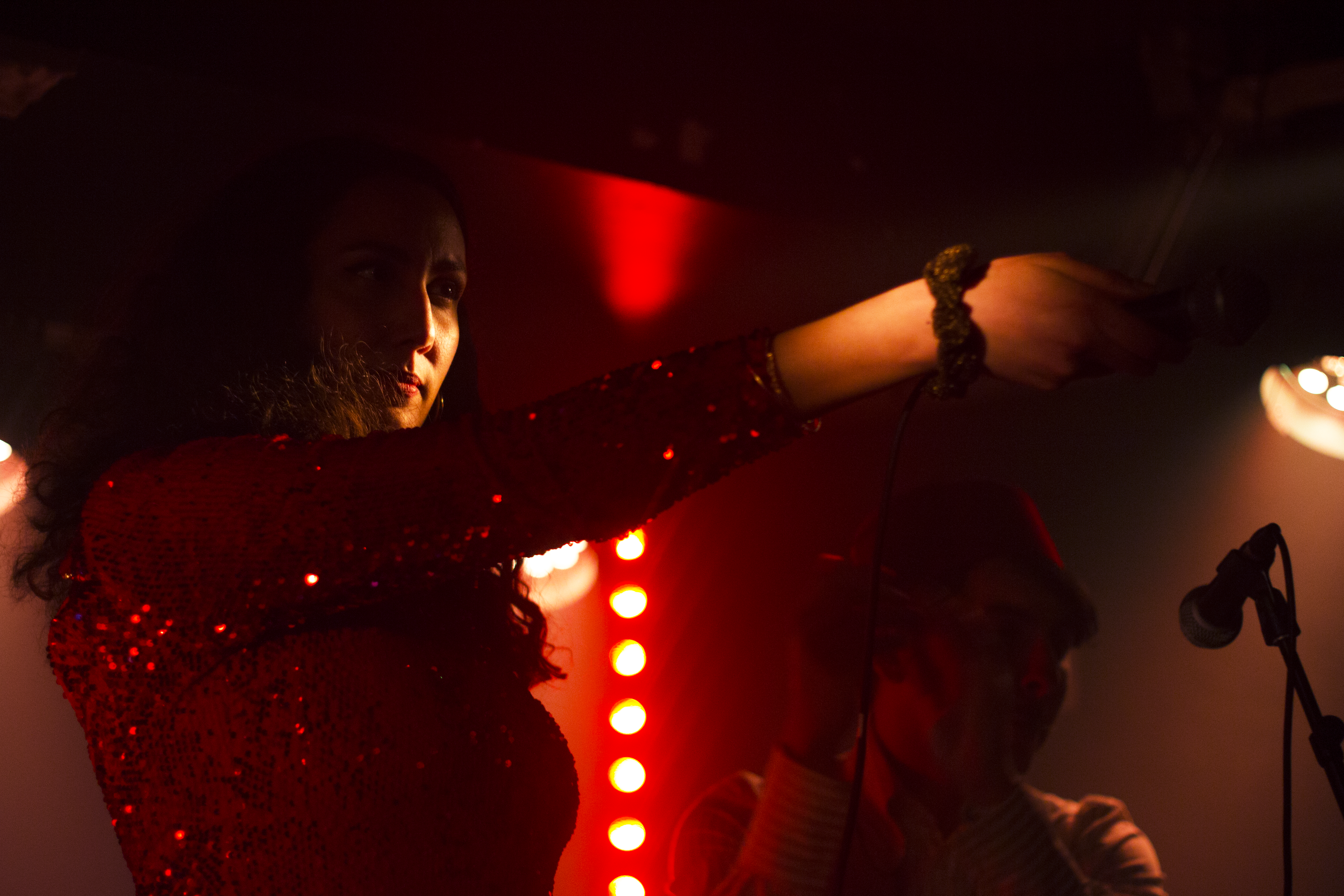 Ils sont deux sur la petite scène du Pop-Up pour entamer le set avec “Barachicha”, le titre instrumental qui ouvre l’EP. Hedi Bensalem, bassiste, guitariste et arrangeur, sort la flûte traversière et souffle les premières notes. La soirée s’annonce orientale, dansante et festive. Avec Ben McConnell à la batterie et Sarah Maison se chargeant elle-même du clavier électronique et des samples, le trio est au complet pour entamer cette release party. Pendant une petite heure, les six titres de Muzul s’enchaînent, entrecoupés notamment par la jolie et planante “Décroche-moi”.