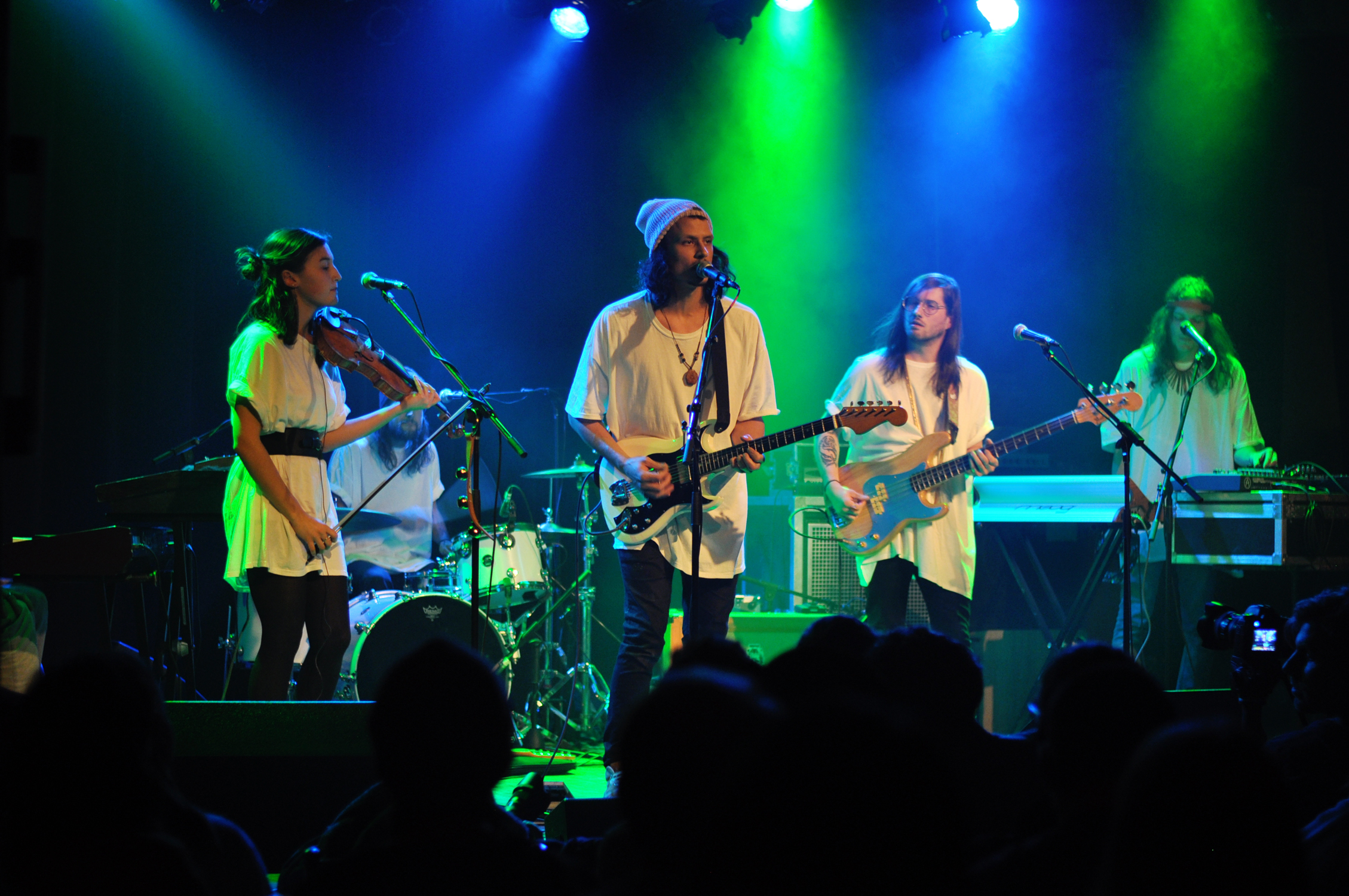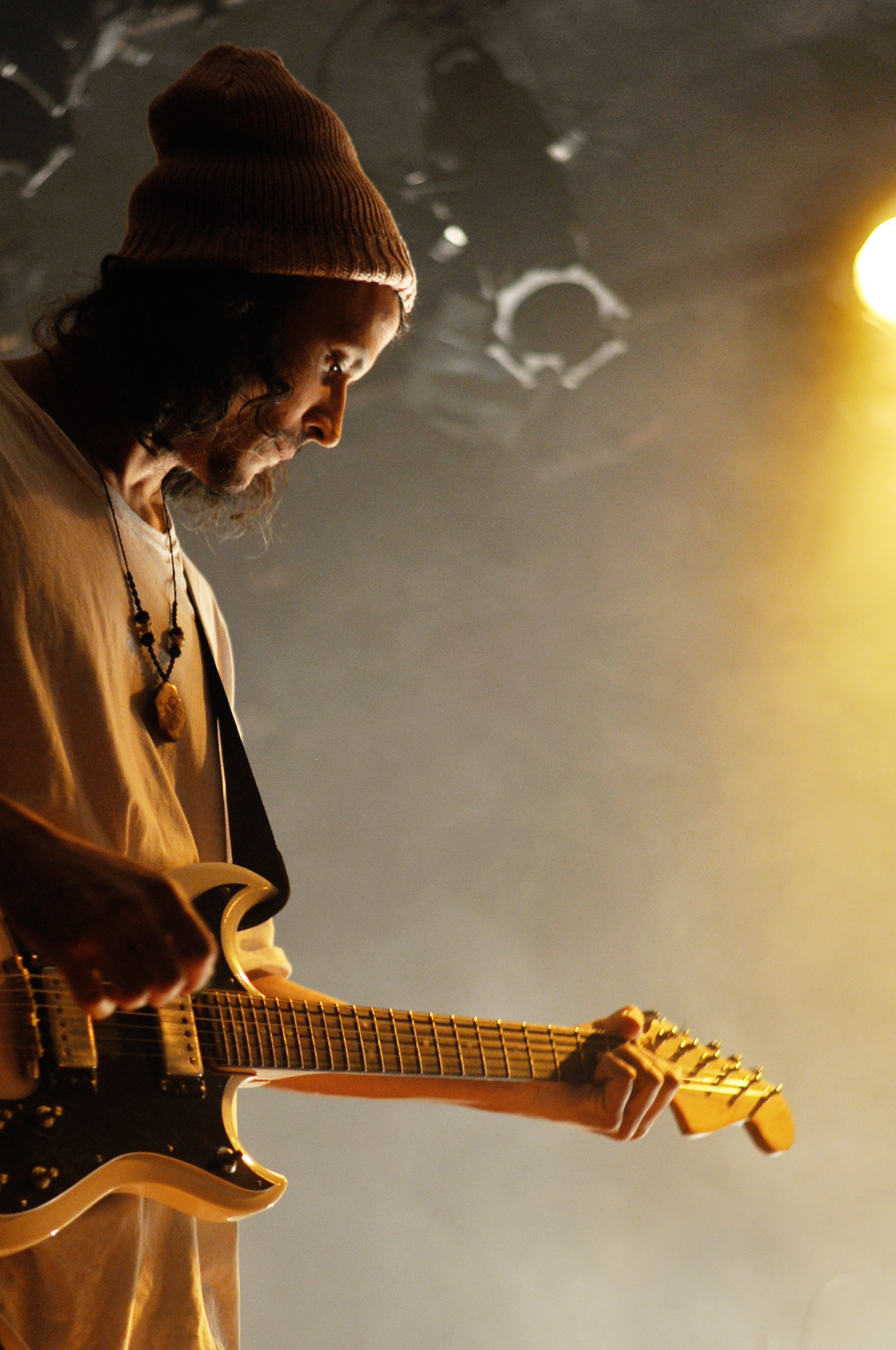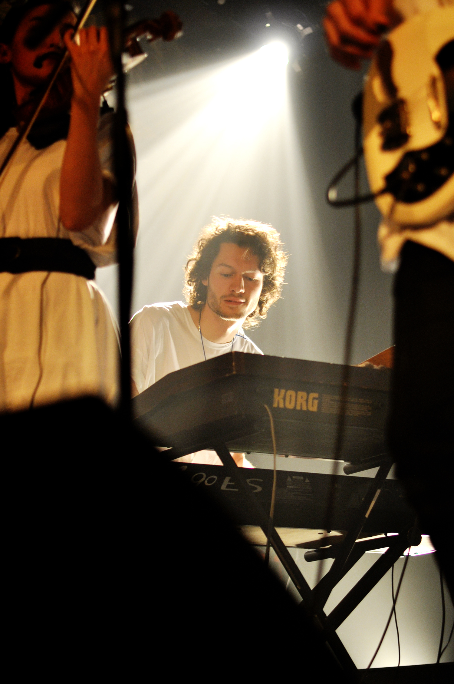 Les six musiciens portent un t-shirt blanc XXL en guise d’uniforme, une sorte de confrérie monacale hip-hop de la toge. Mais tu connais l’expression “l’habit ne fait le moine”. Si visuellement je trouve ça un peu adolescent, musicalement c’est la performance que je vais préférer dans la soirée. Le son est riche, une sorte de concentré de nappes électroniques qui s’entremêlent. Les nuances sont belles, les transitions travaillées, et je me laisse complètement subjuguer par ces séquences de répétitions, ces incantations qui s’étirent et laissent mon esprit vagabonder vers un ailleurs planant.