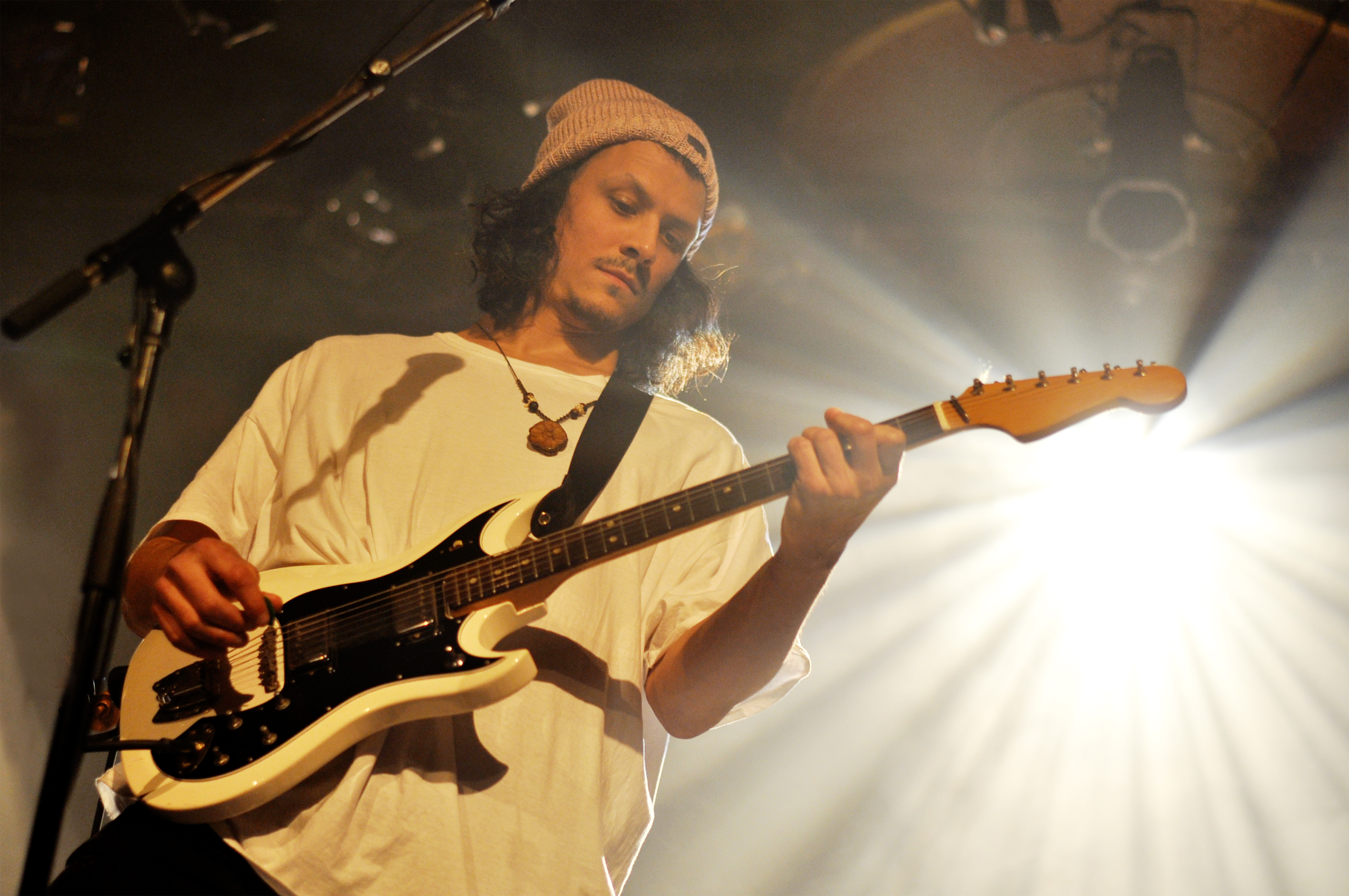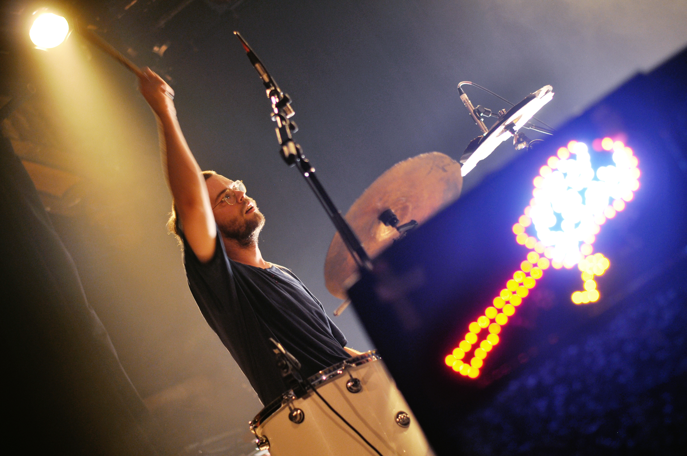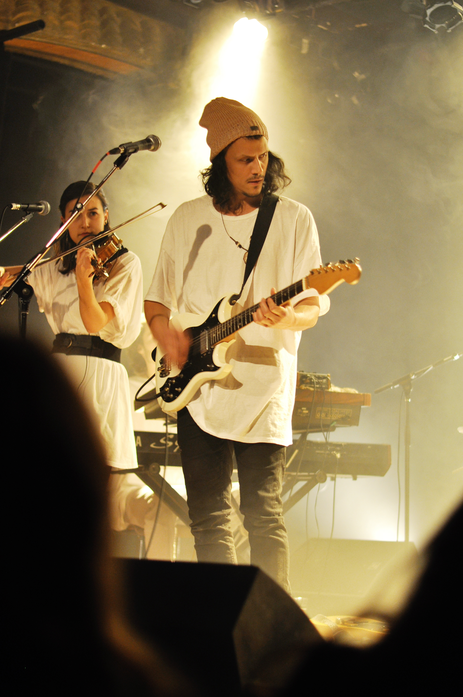 Les six musiciens portent un t-shirt blanc XXL en guise d’uniforme, une sorte de confrérie monacale hip-hop de la toge. Mais tu connais l’expression “l’habit ne fait le moine”. Si visuellement je trouve ça un peu adolescent, musicalement c’est la performance que je vais préférer dans la soirée. Le son est riche, une sorte de concentré de nappes électroniques qui s’entremêlent. Les nuances sont belles, les transitions travaillées, et je me laisse complètement subjuguer par ces séquences de répétitions, ces incantations qui s’étirent et laissent mon esprit vagabonder vers un ailleurs planant.
