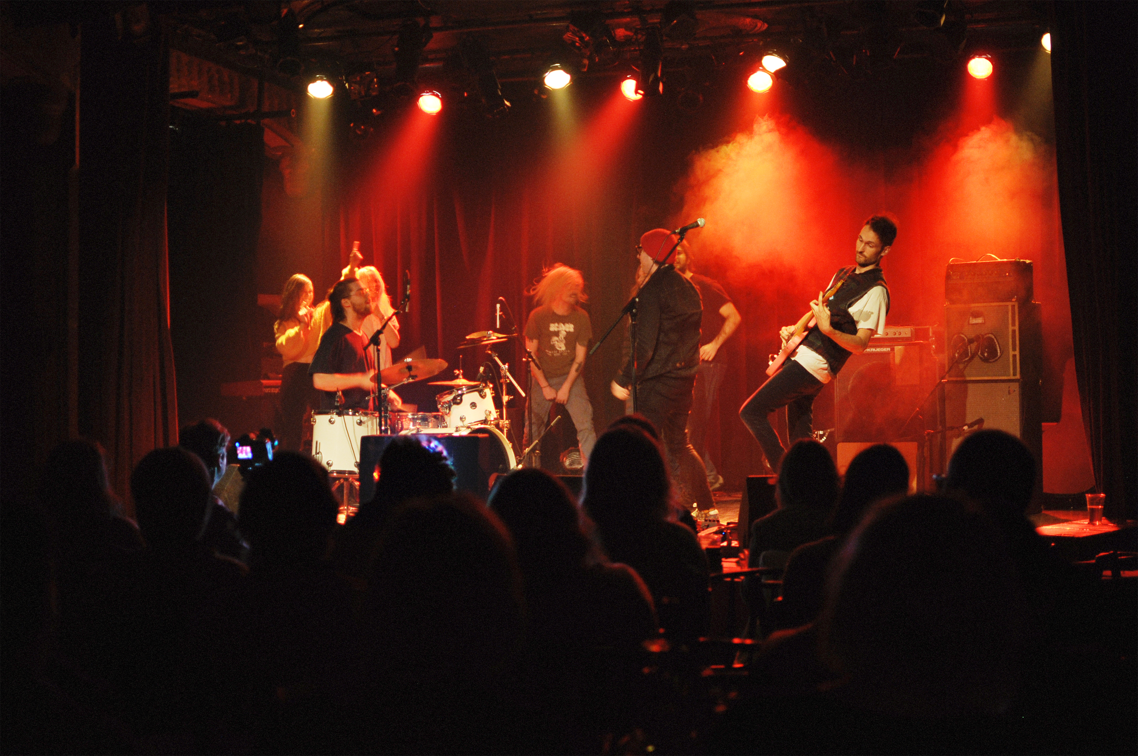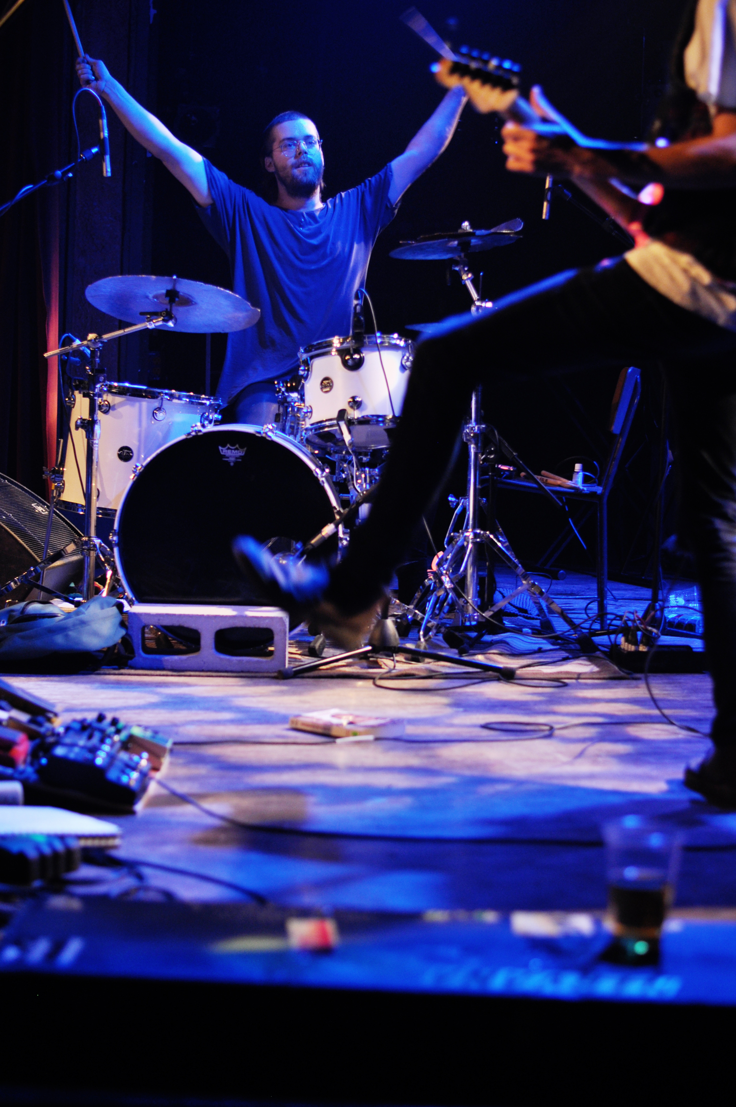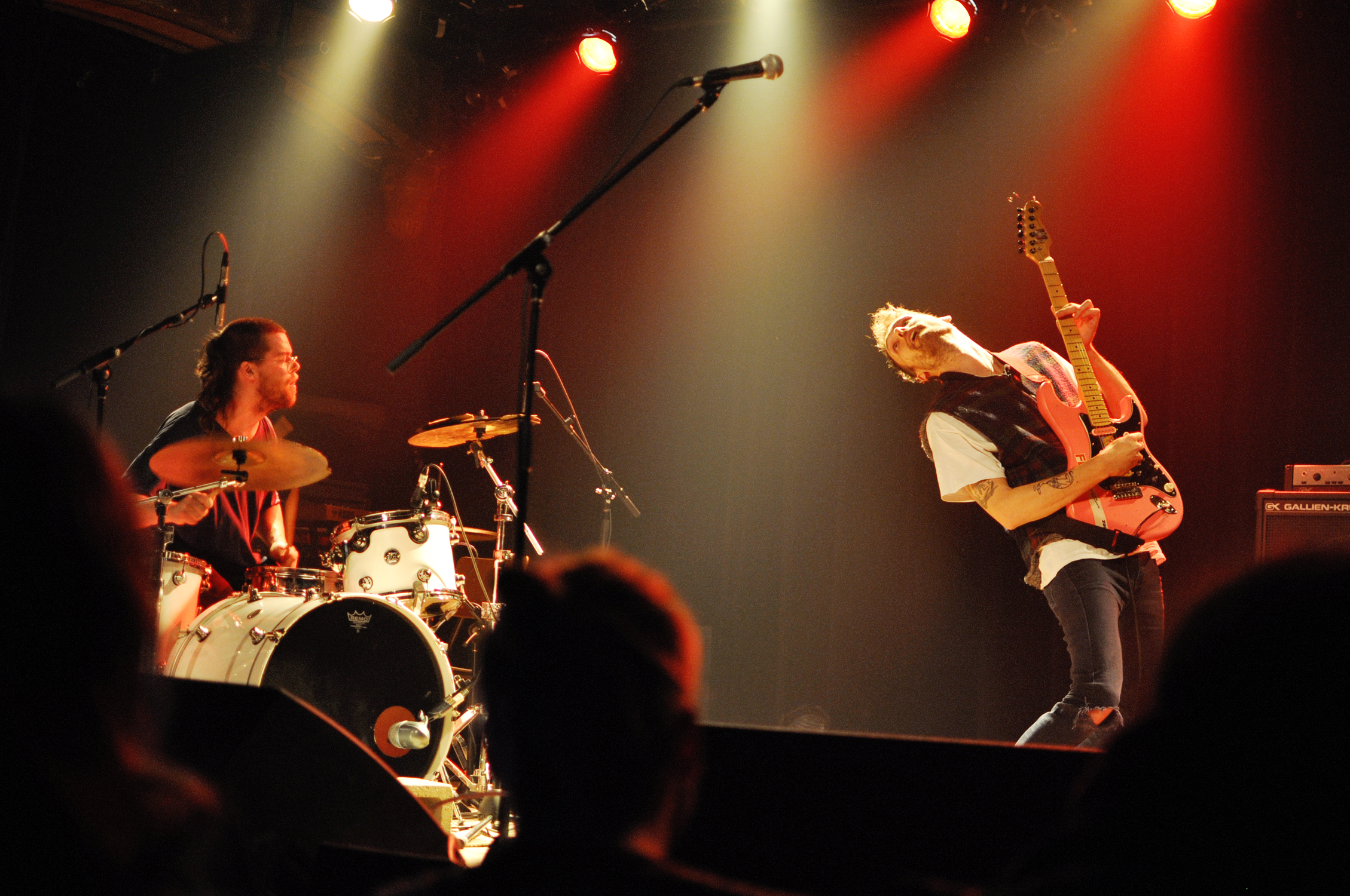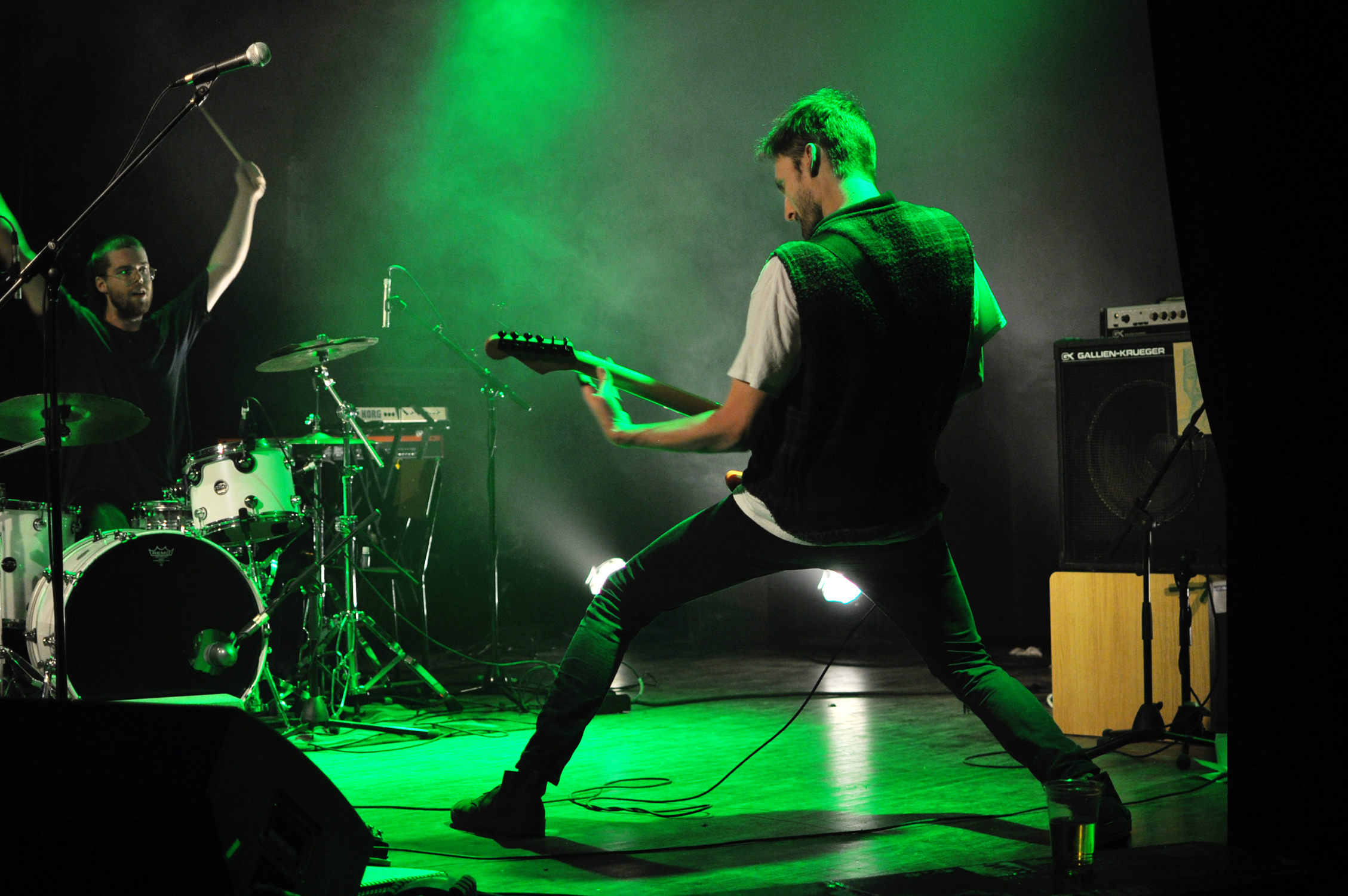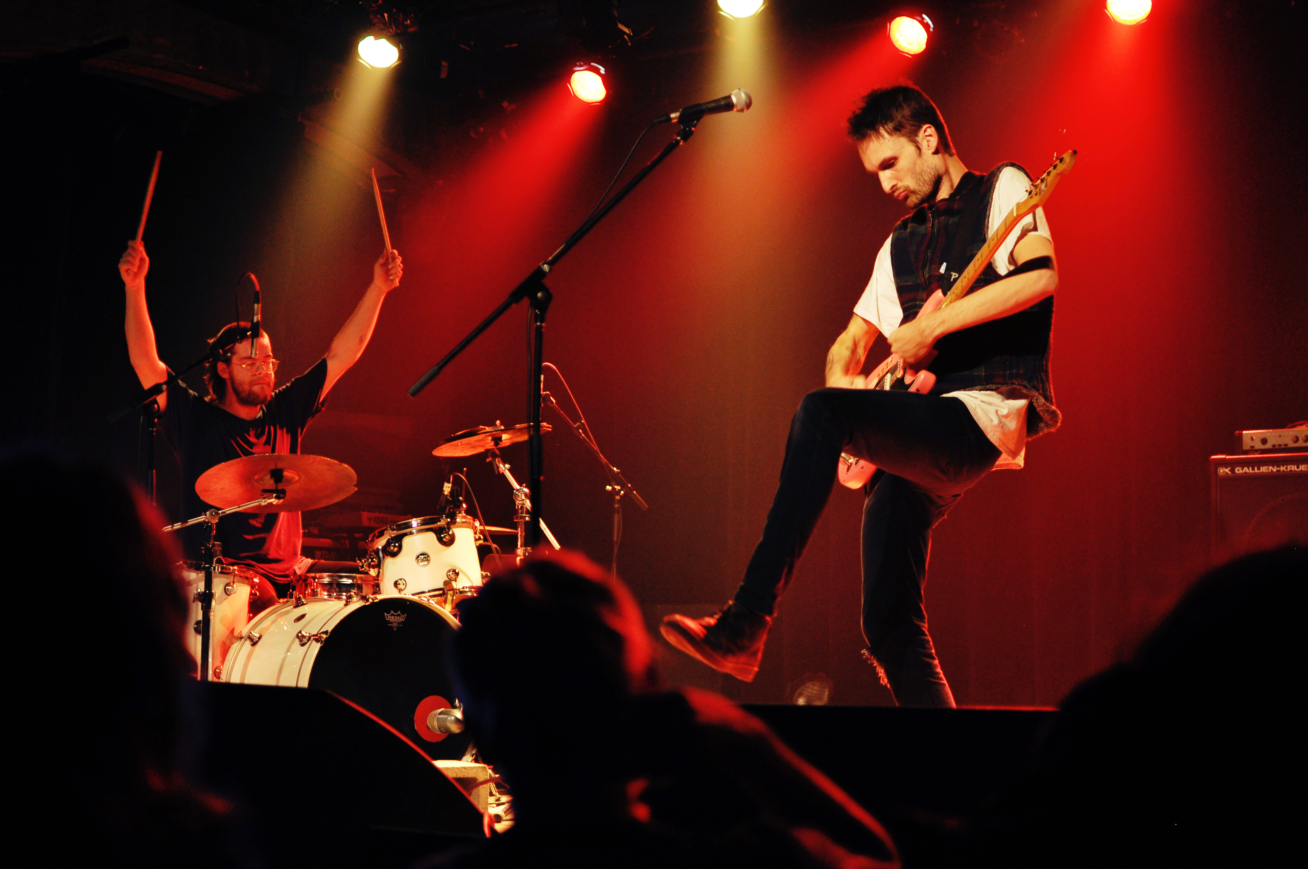 Troisième groupe en lisse : le duo punk-rock Crabe que l’on voit gigoter et sautiller comme des boxeurs en coulisses. La cerise sur le gâteau pour la majeure partie de la salle. Ou du moins la grosse Doc Martens dans la poutine. Composé de Gabriel Lapierre à la batterie, et de Mertin Hoëk à la guitare/chant, Crabe est le groupe qui nous a défoncé les tympans pour la soirée. C’est aussi le groupe qui fait monter des amateurs de hair spinning sur scène le temps d’une chanson puisqu’il est être un peu compliqué de faire du body surfing dans “le monde assis là”.