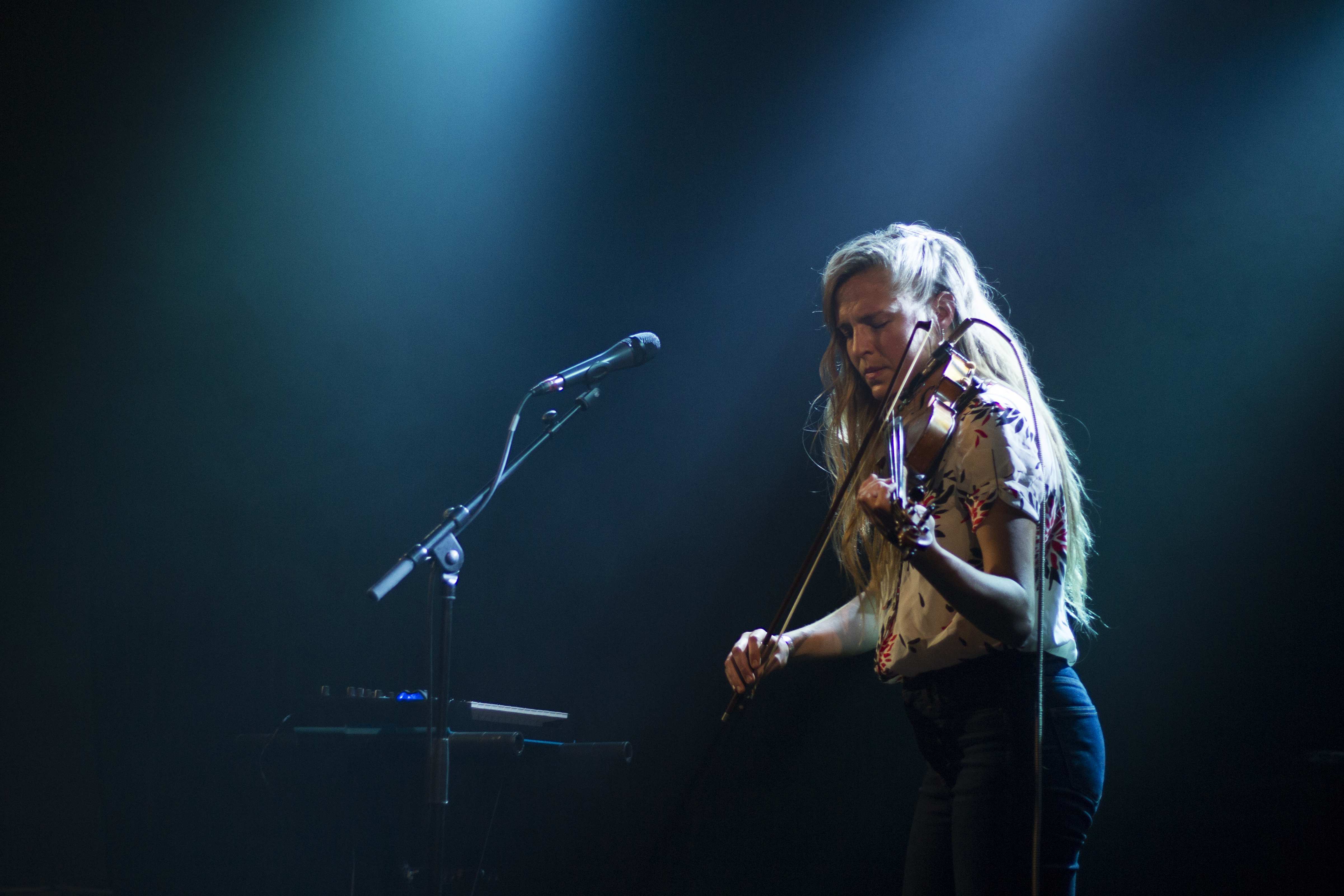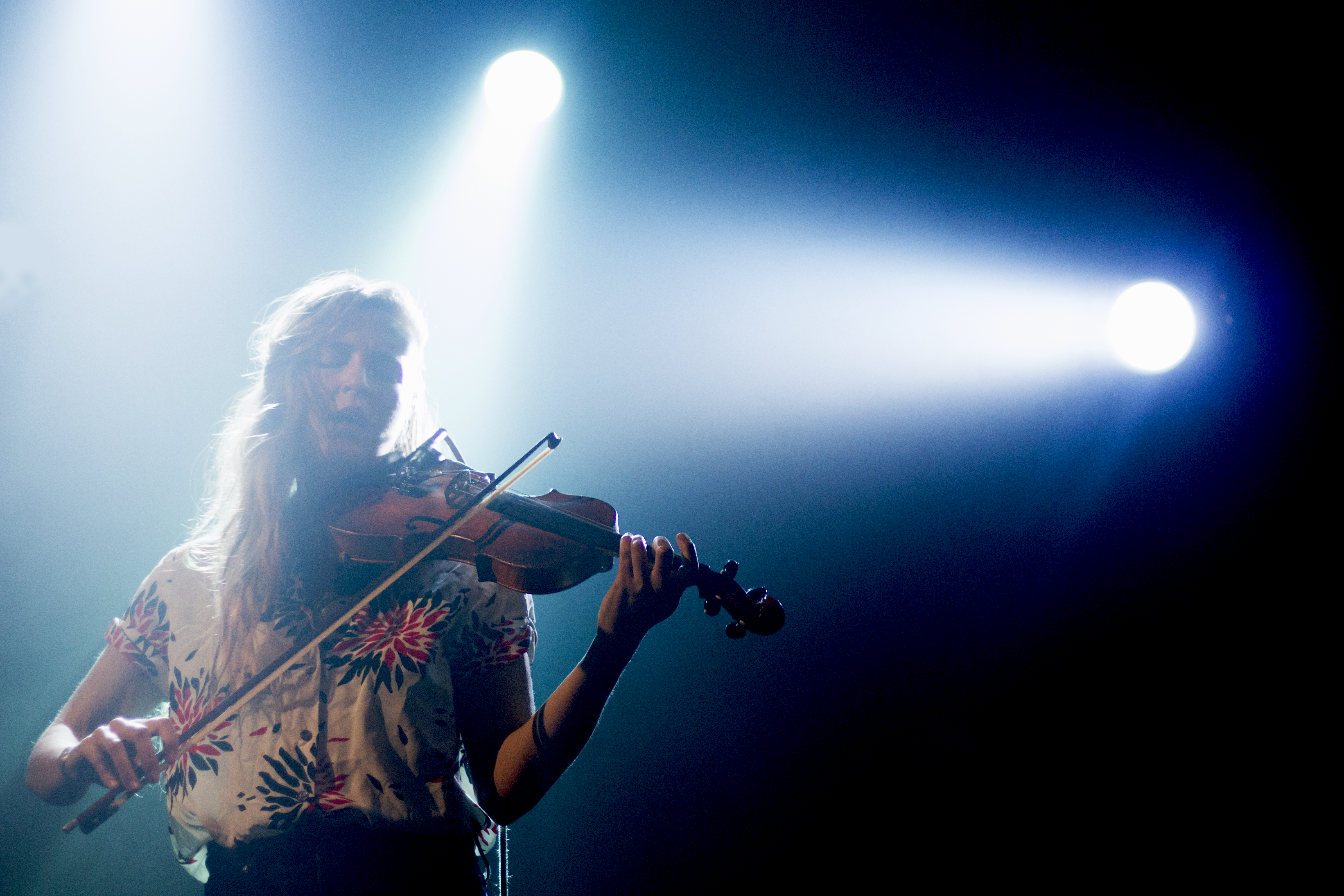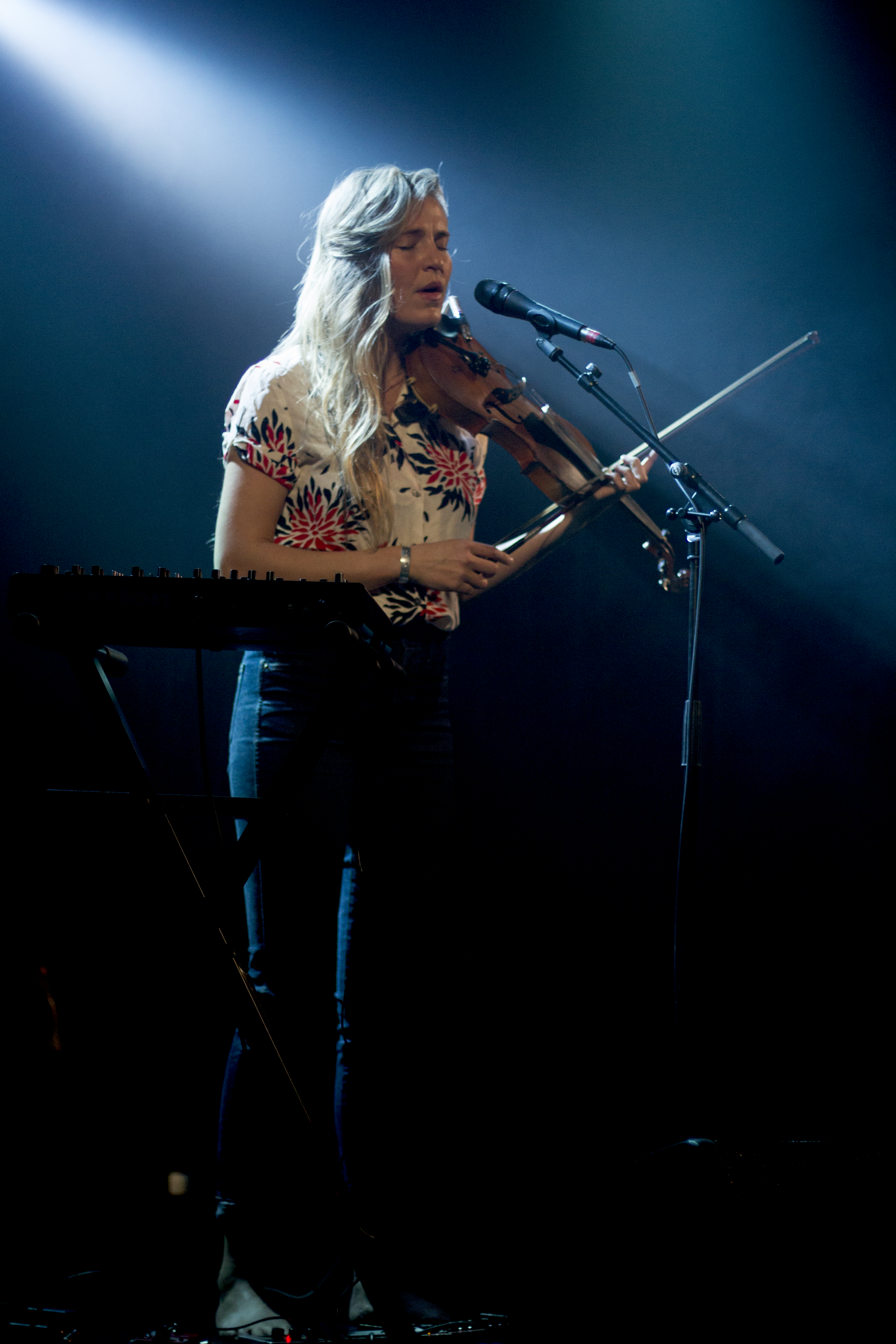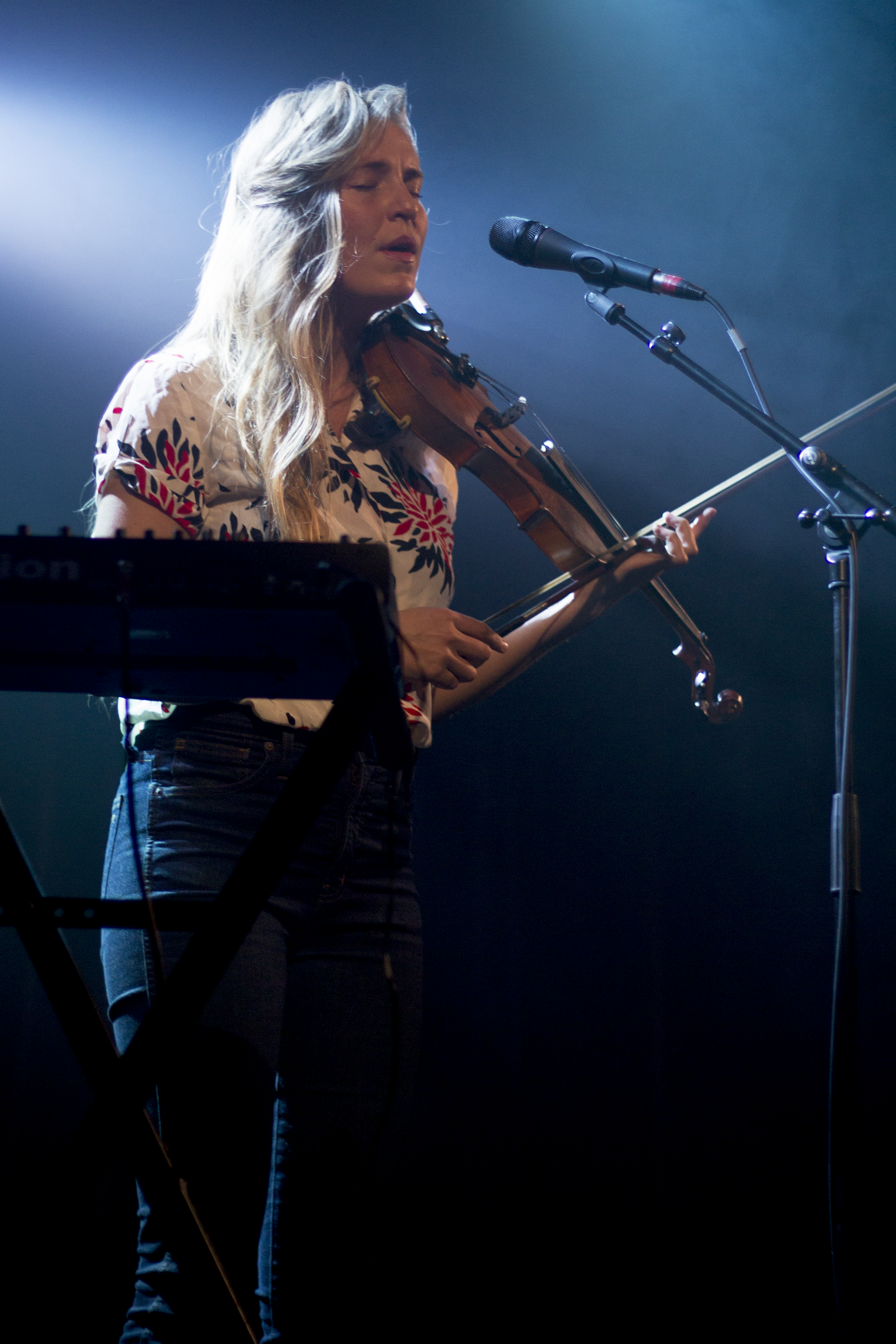 Hannah Epperson et son fidèle violon prennent la suite de la soirée en main. Seule sur la scène éclairée d’une lumière de pleine lune, elle fascine. À ses pieds de nombreuses pédales loop lui permettent de construire ses morceaux, ajoutant petit à petit des pistes et éléments. À l’archet, en pizz’ ou comme percu, le violon est l’élément central du set d’Hannah Epperson. Il peut être rythmé, doux, grinçant, chuchoté tandis que la voix, secondaire, ne sert qu’à donner des mots aux mélodies. Elle est d’ailleurs soufflée plus que chantée. Le set s’ouvre avec “Cat’s Cradle” donnant dès l’entrée le ton de la fin de soirée. Le violon y est très présent et l’ambiance cotonneuse. S’ensuivent des titres tout autant aériens, au format long de 7-8 minutes.