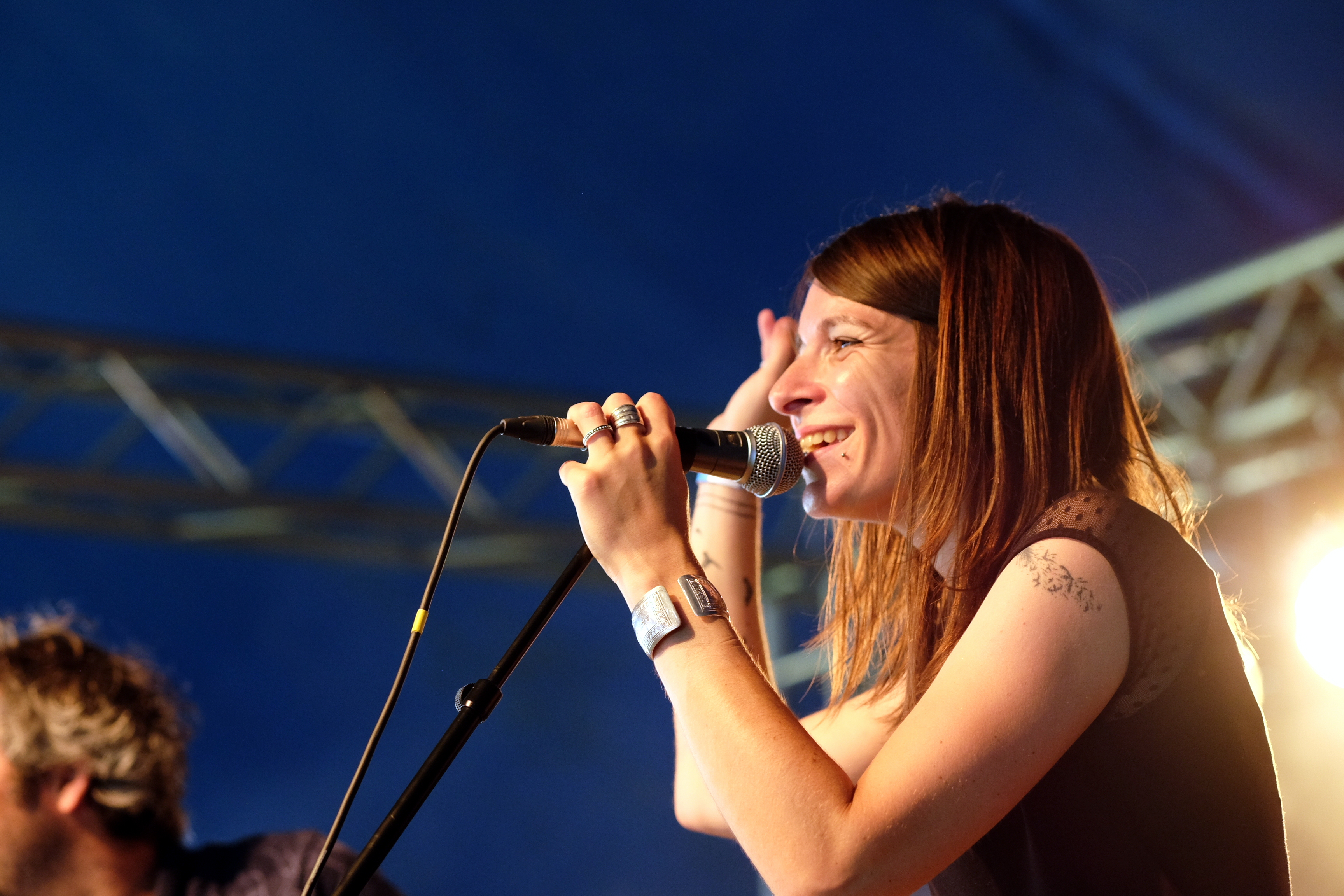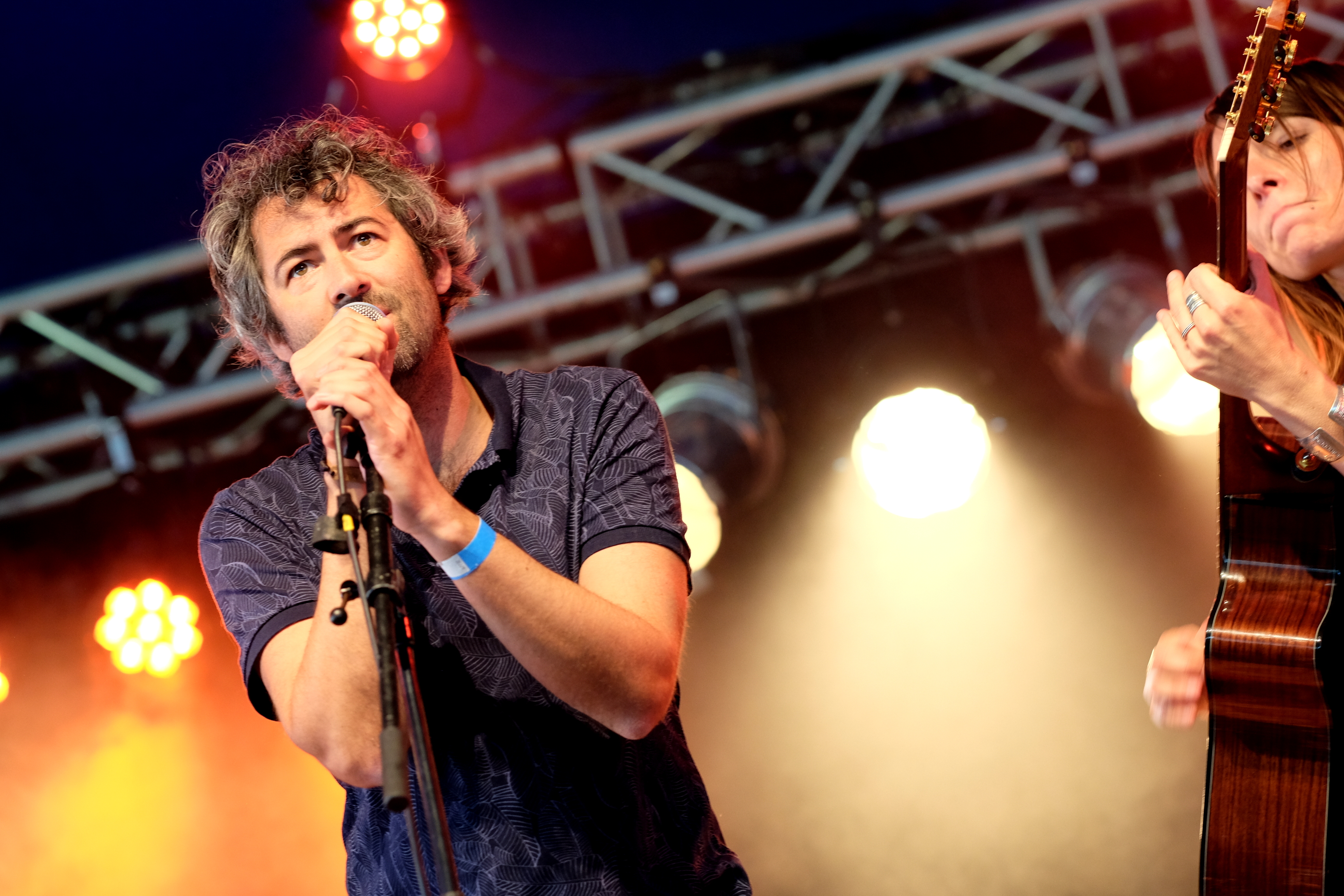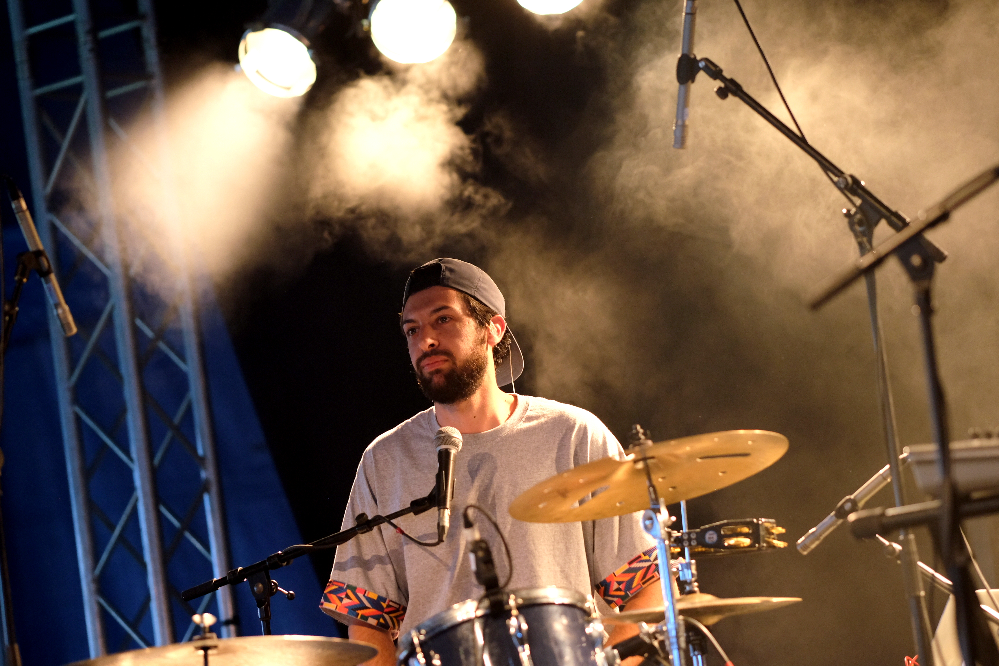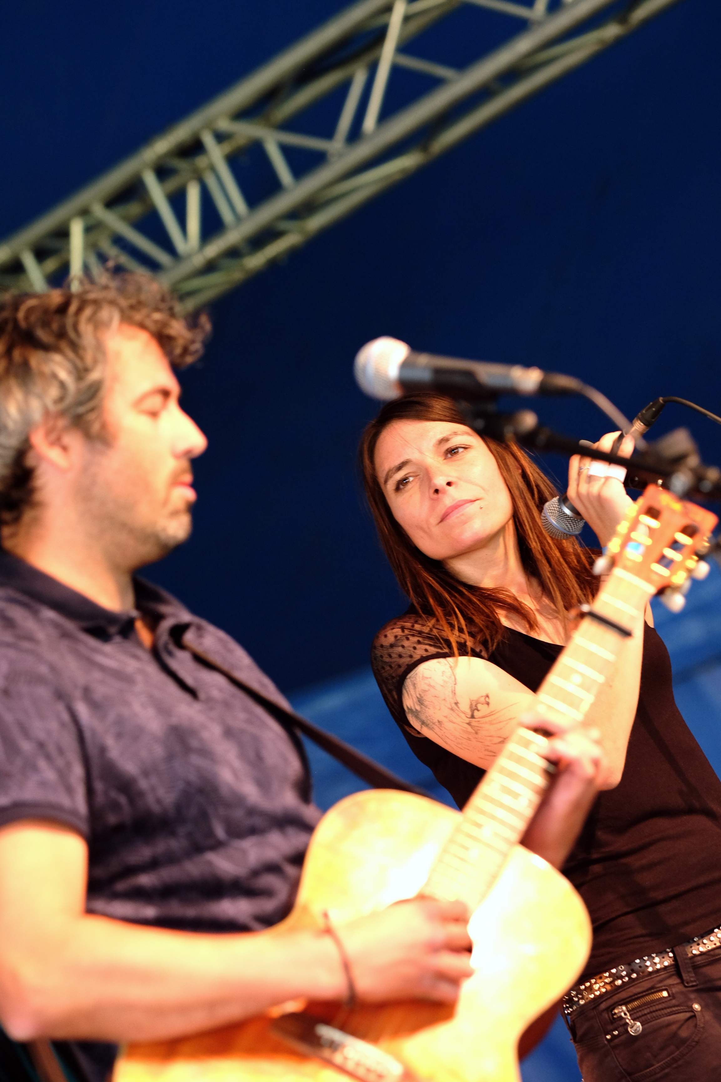 Après le local, place à un groupe originaire du plateau du Golan avec TootArd. D’habitude à 4, ils sont ce soir en duo batterie/guitare. Ils nous expliquent être sans nationalité et donc sans passeport, avec seulement un “laissez passer” pour guise de document de voyage. Et c’est ce “laissez passer” qui est aussi le nom de leur second album. Musicalement, les styles se croisent. Entre blues touareg, reggae et musique arabe, le groupe parvient à faire régner la bonne humeur sous le petit chapiteau et à faire onduler l’ensemble du public.
