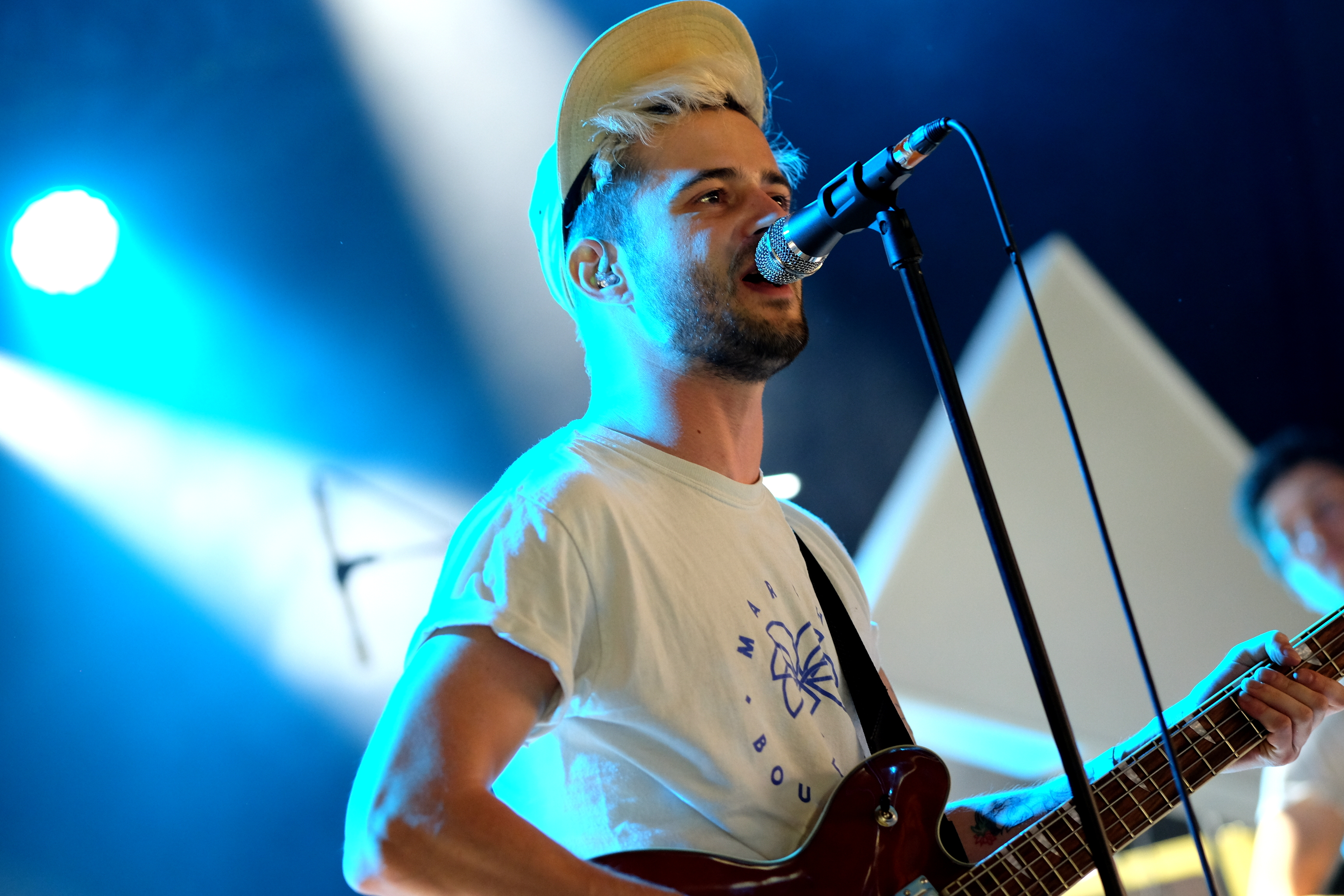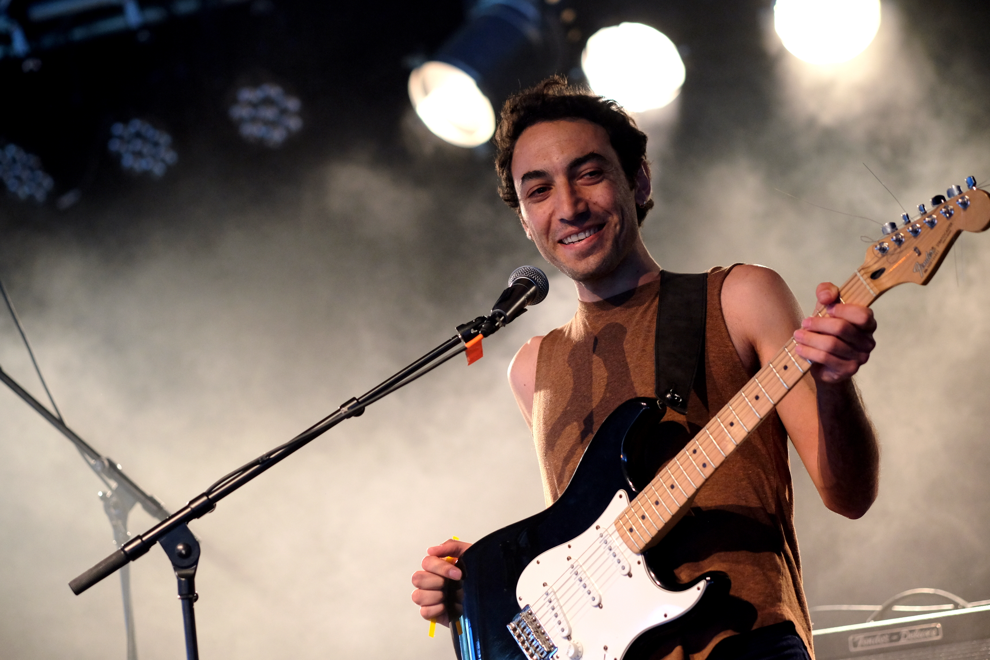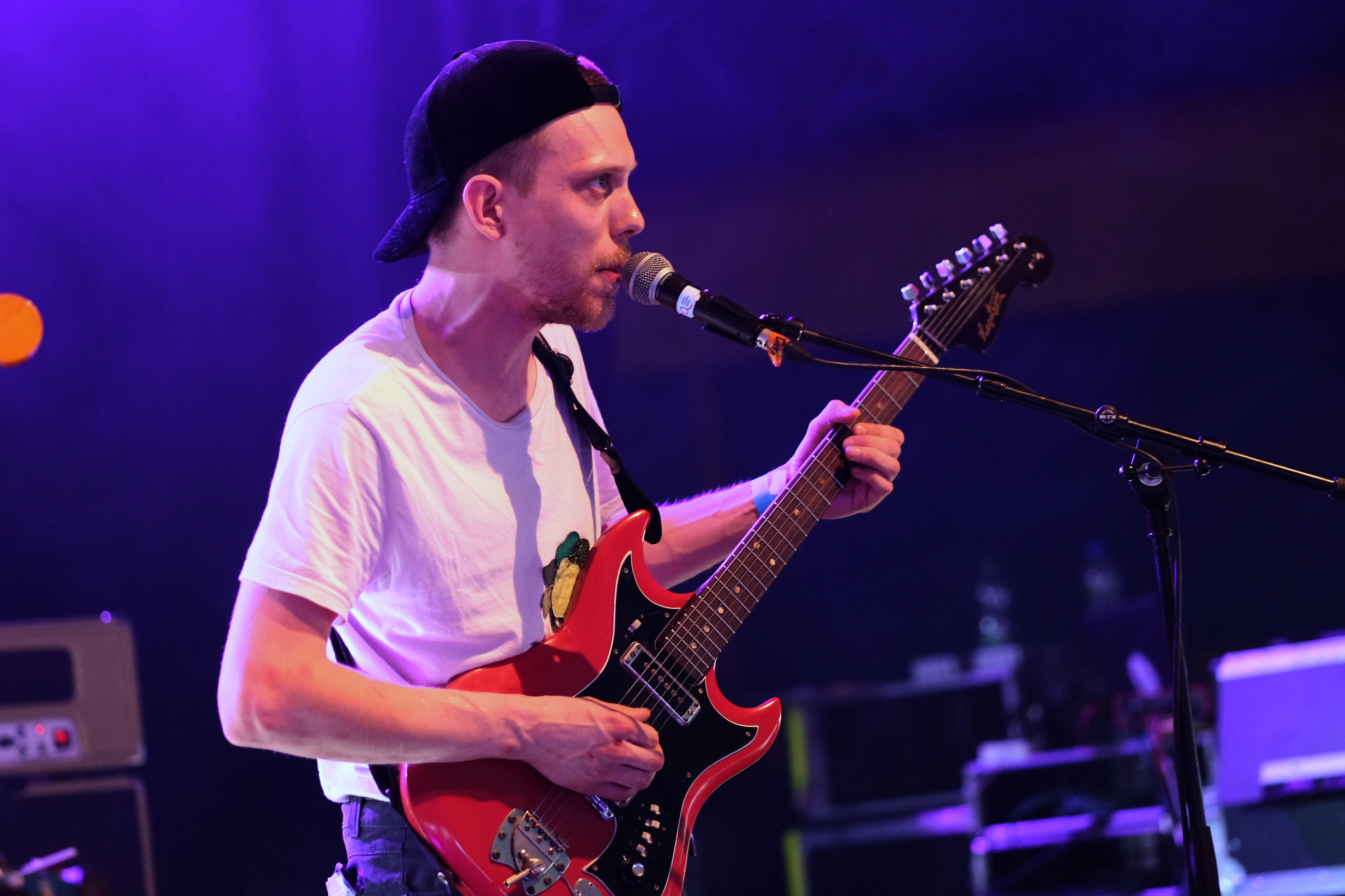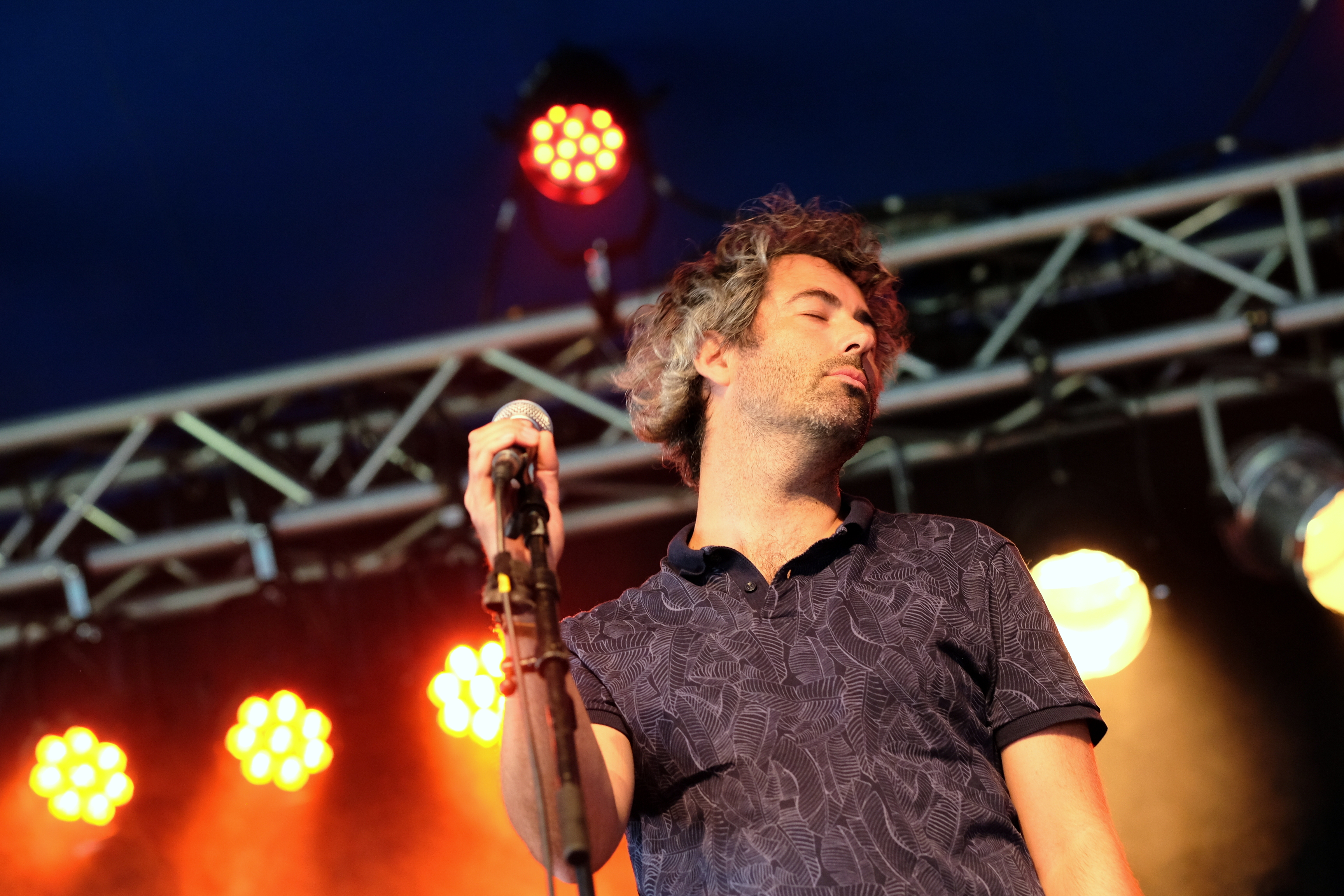 Amoure et Amor Blitz ont choisi la solution, peut-être la plus “facile”, de se partager le set en deux fois 30 minutes, avec la réunion des deux groupes sur les derniers morceaux de chacun. Une façon pour nous de profiter de la musique des deux groupes de manière bien identifiable. Malheureusement, aujourd’hui, je les trouve un peu en dessous. Est-ce l’impression d’avoir fait le tour au bout de 3 chansons qui me fait m’éloigner d’Amoure ? Est-ce la grande scène qui écrase un peu l’énergie d’Amor Blitz ? Peut-être est-ce simplement l’envie d’aller profiter du soleil hors du chapiteau… La battle précédente de Joy & Glory et Petseleh avait une autre couleur. Plutôt que de séparer le set en deux, les deux formations, qui se connaissent très bien, avaient préparé un mélange de titres des deux répertoires, avec tous les musiciens réunis pour les jouer. À les voir mêler leurs voix et leurs guitares, on aurait presque pu croire qu’un seul et même groupe jouait en face de nous. Une belle réussite.