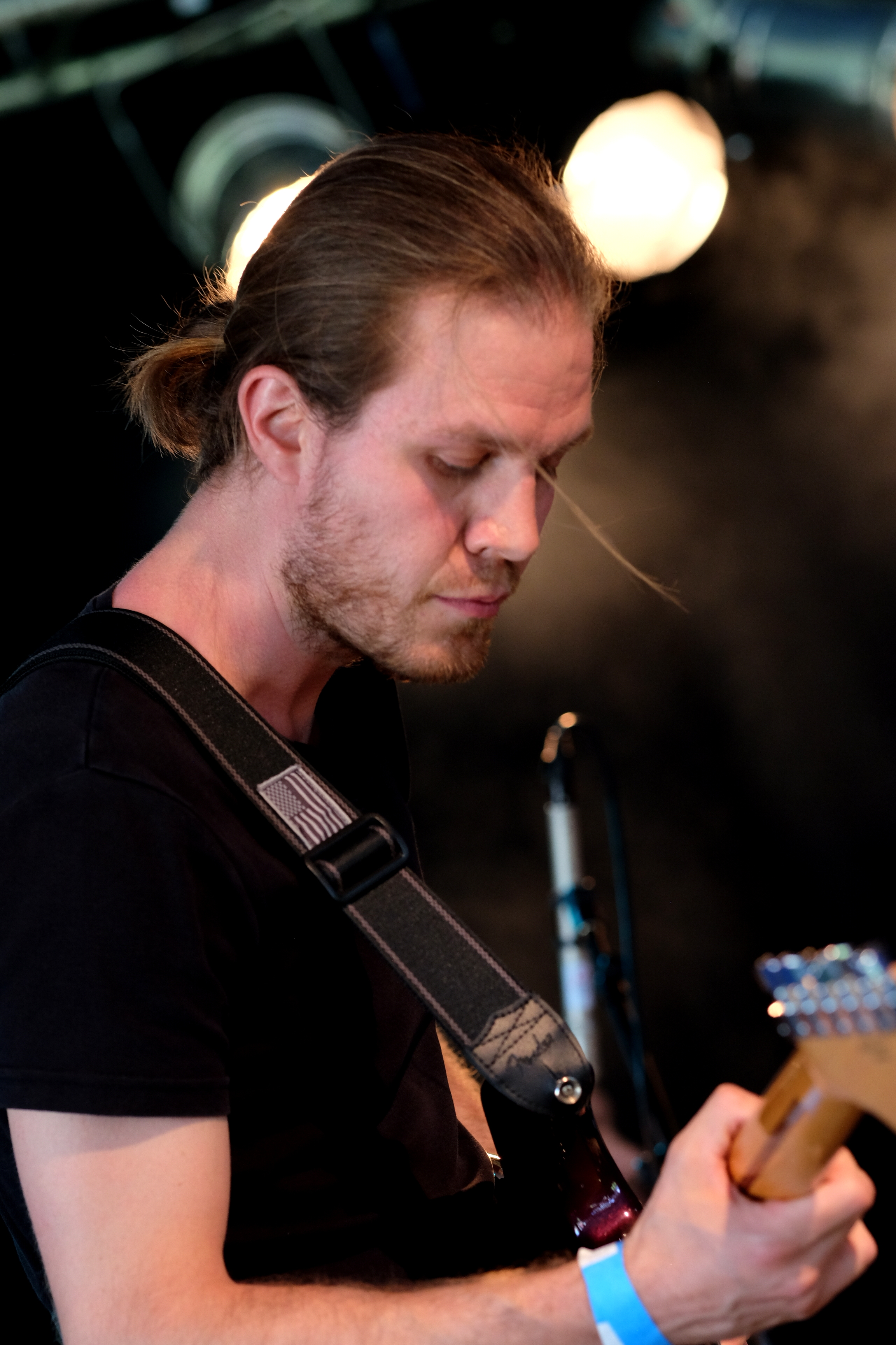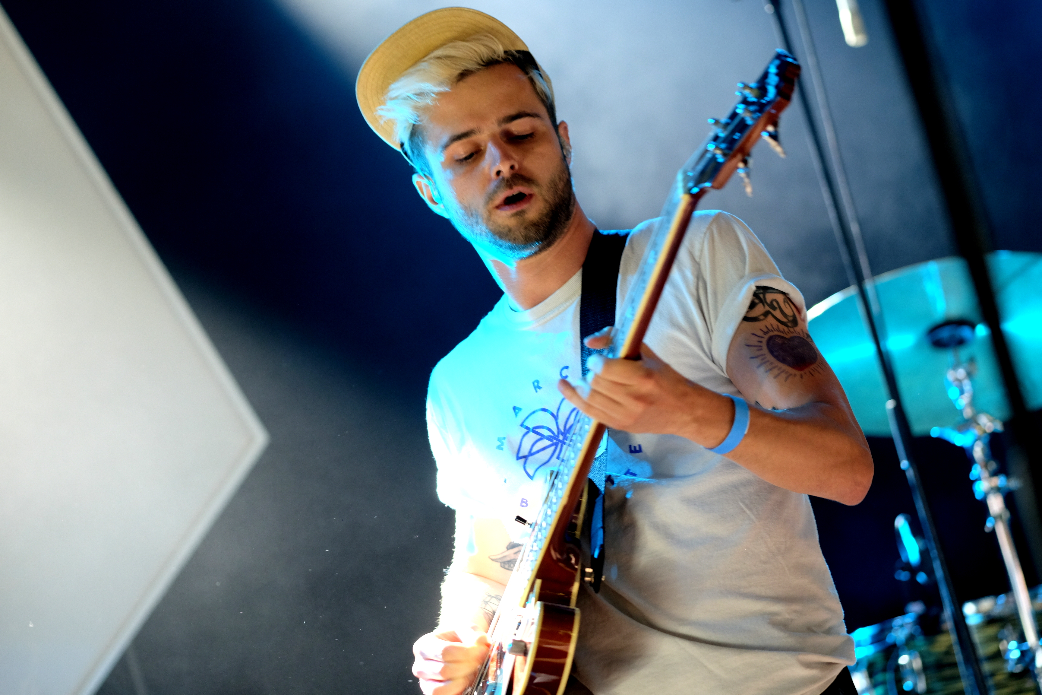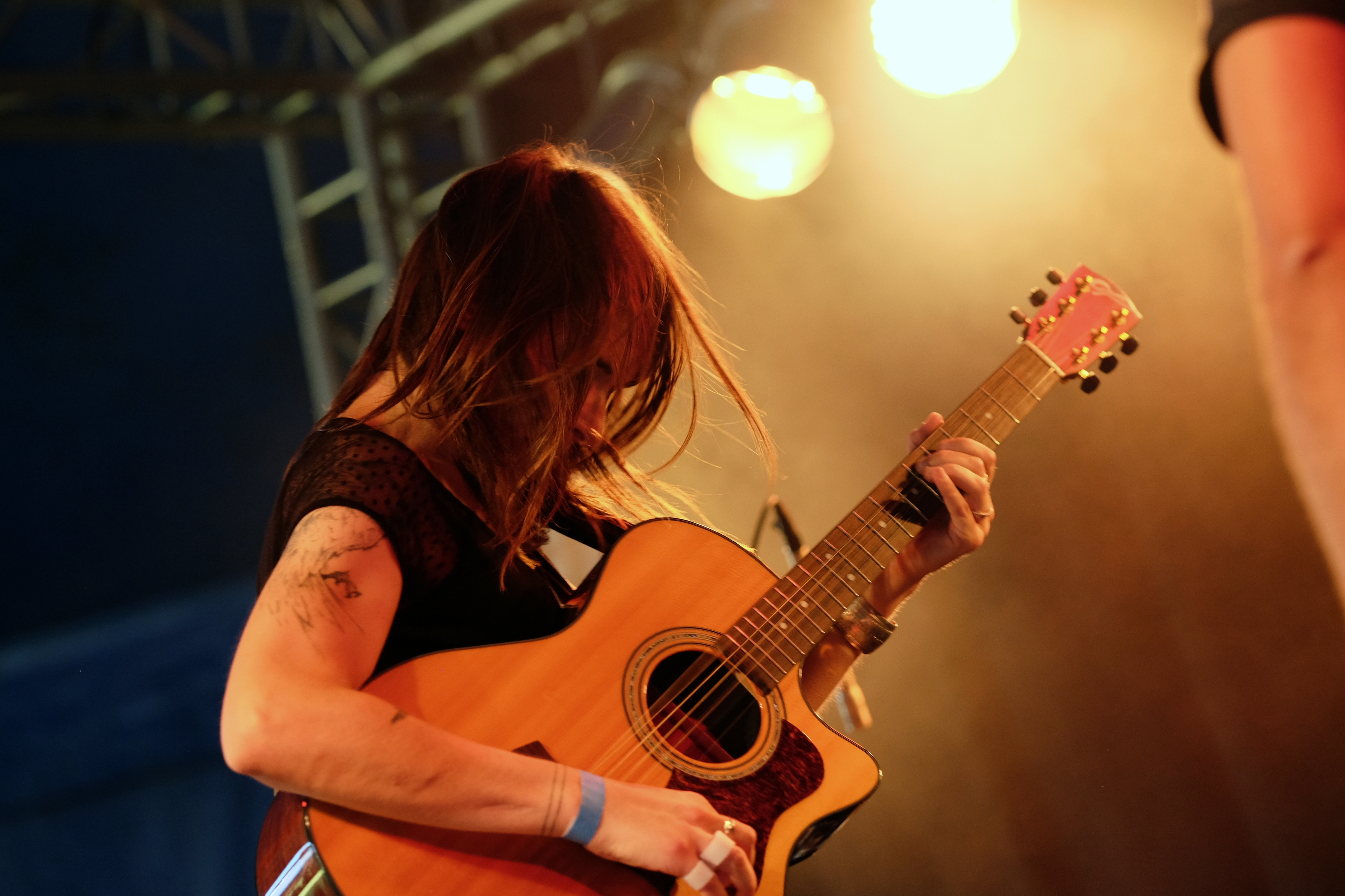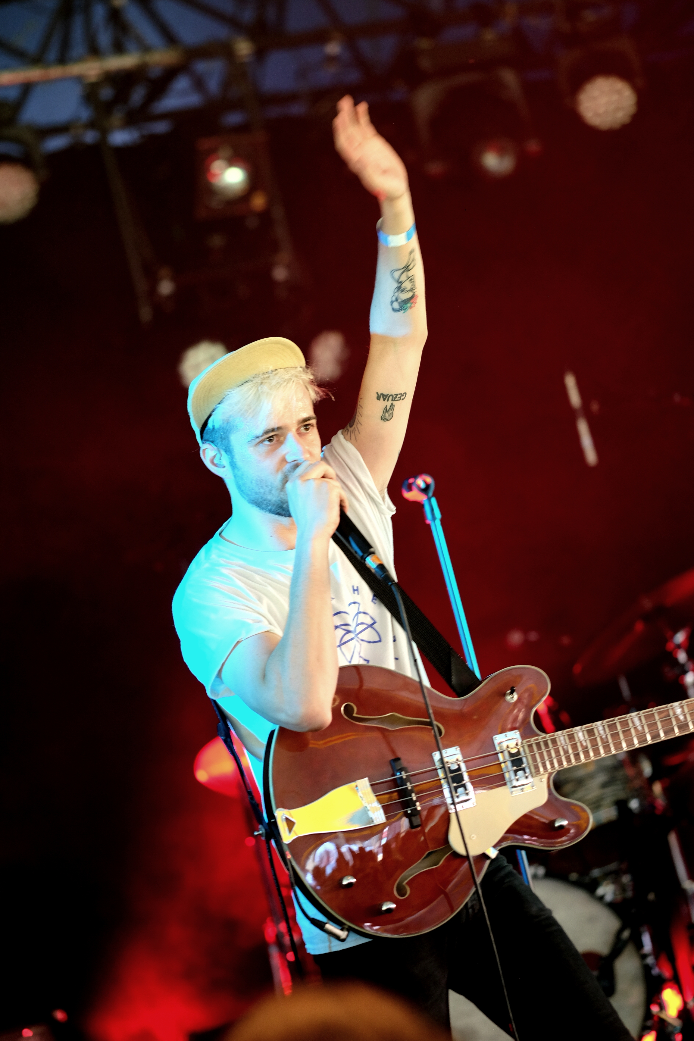 Amoure et Amor Blitz ont choisi la solution, peut-être la plus “facile”, de se partager le set en deux fois 30 minutes, avec la réunion des deux groupes sur les derniers morceaux de chacun. Une façon pour nous de profiter de la musique des deux groupes de manière bien identifiable. Malheureusement, aujourd’hui, je les trouve un peu en dessous. Est-ce l’impression d’avoir fait le tour au bout de 3 chansons qui me fait m’éloigner d’Amoure ? Est-ce la grande scène qui écrase un peu l’énergie d’Amor Blitz ? Peut-être est-ce simplement l’envie d’aller profiter du soleil hors du chapiteau… La battle précédente de Joy & Glory et Petseleh avait une autre couleur. Plutôt que de séparer le set en deux, les deux formations, qui se connaissent très bien, avaient préparé un mélange de titres des deux répertoires, avec tous les musiciens réunis pour les jouer. À les voir mêler leurs voix et leurs guitares, on aurait presque pu croire qu’un seul et même groupe jouait en face de nous. Une belle réussite.