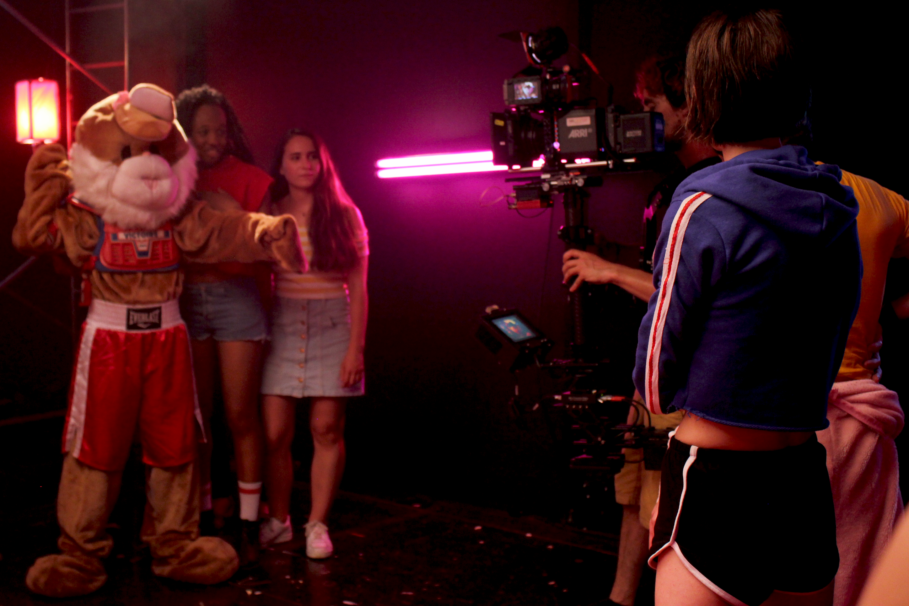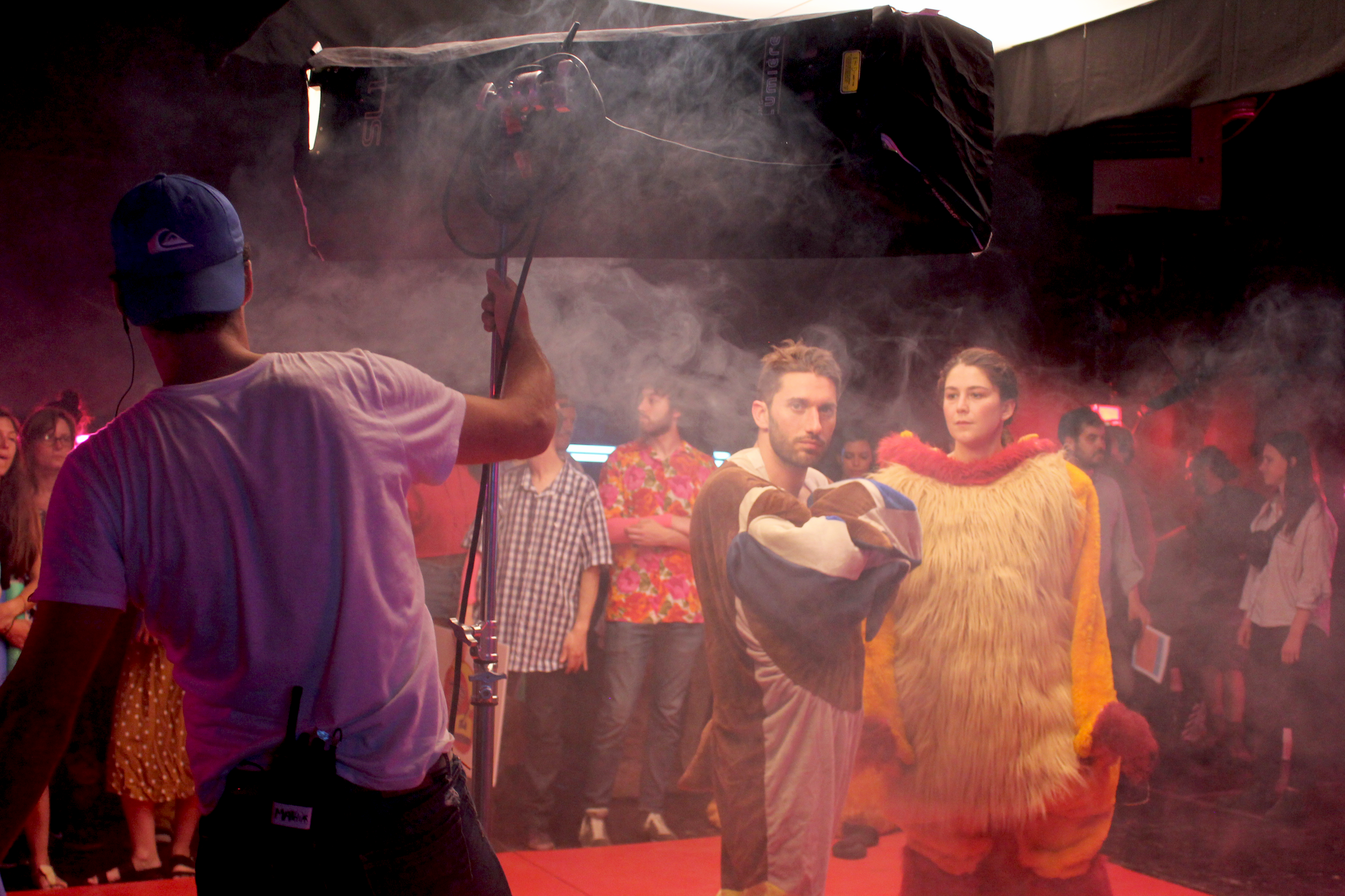 L’idée est de filmer des combats sur le ring, plusieurs versions d’un même scénario, revenant en boucle. Les figurants sont installés en cercle tout autour du ring. Leurs costumes sont colorés et animaliers. Dans leurs bras, l’accessoiriste fait passer tantôt des “frites” de piscine, tantôt du pop-corn.