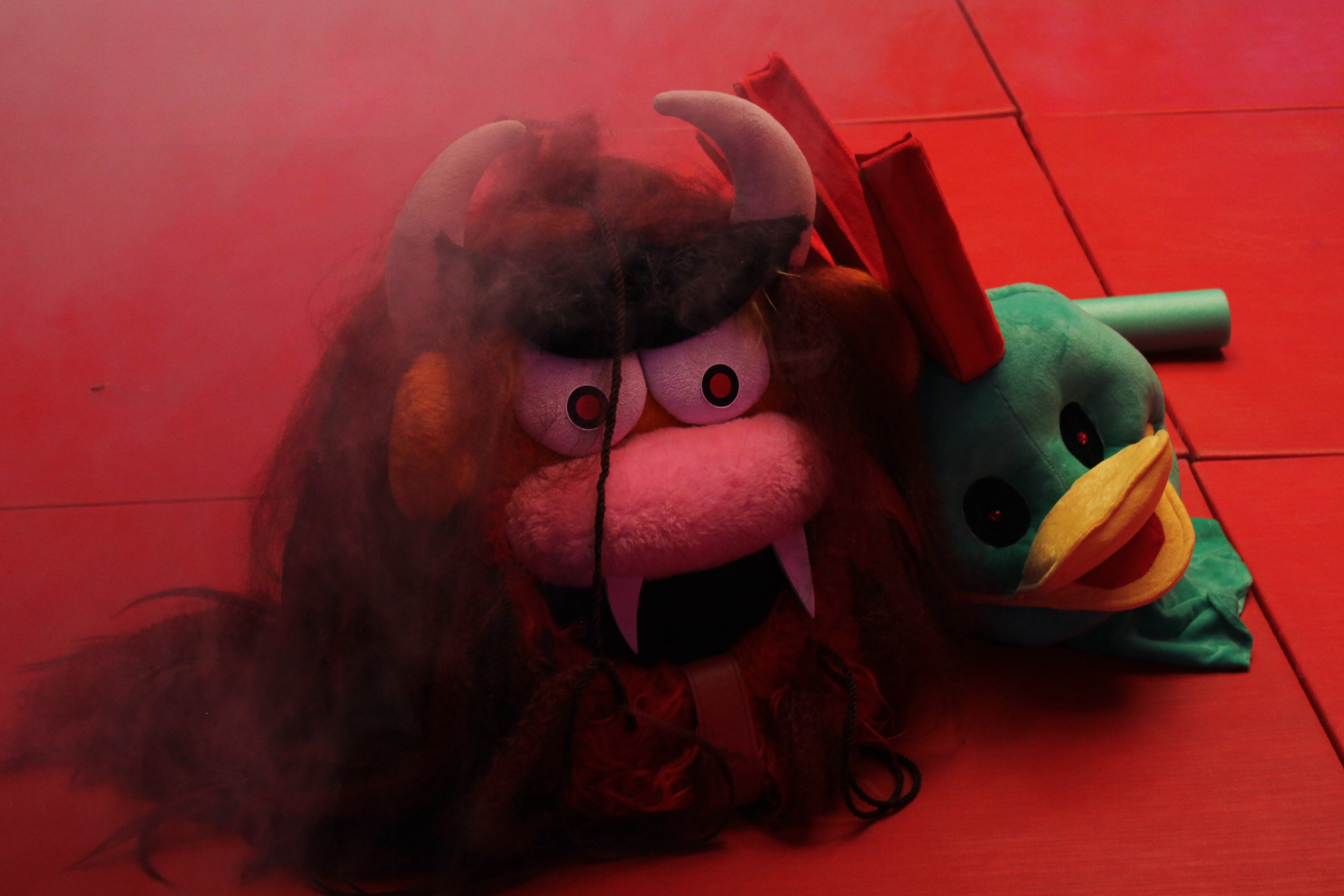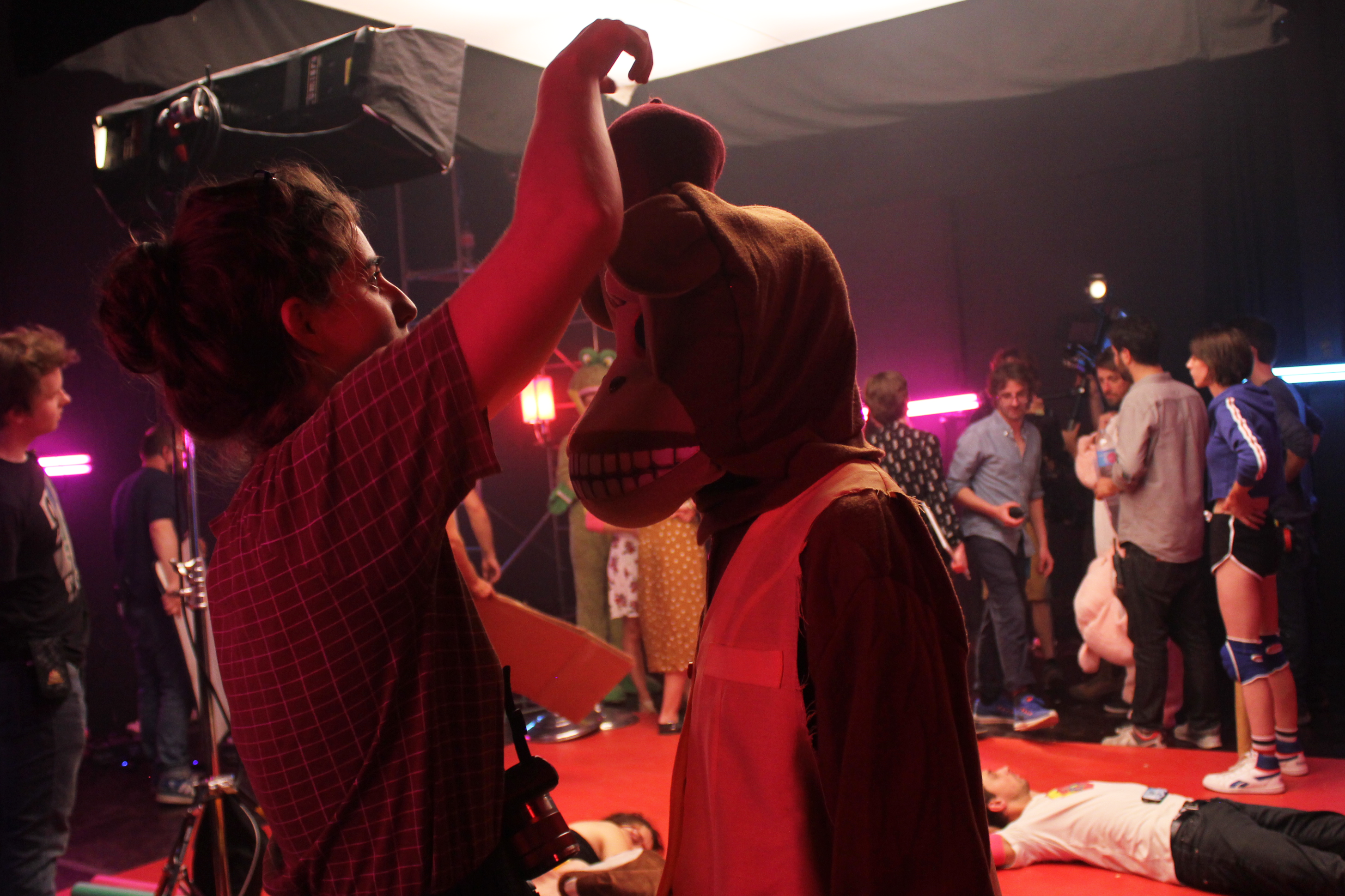 Quand j’arrive au studio de Montreuil, la caméra tourne déjà. Il fait extrêmement chaud dans la salle, drapée de noir pour filtrer le soleil de dehors. Au sol des tatamis, au plafond une lumière froide, dans les coins un diffuseur de fumée et tout le matériel des cameramen. Beaucoup de monde s’active dans l’arène. Il y a ici une petite trentaine de figurants, habillés de couleurs et certains cachés sous des déguisements pelucheux d’ours, singes, oiseaux…