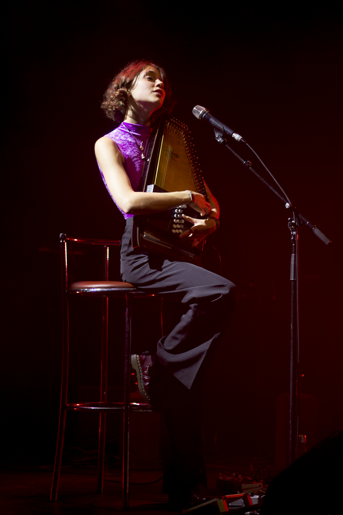 Le public de la Cigale, confortablement installé, ne quitte pas son siège tandis que le changement de plateau s’opère. Fébrilement la salle attend sa star. Et lorsque Pomme arrive sur scène, discrètement et sur la pointe des pieds, la foule explose. Ses premières notes sont électroniques : des nappes lancée et modifiées à partir d’un petit boîtier qu’elle tient sur un genou. Alors que la salle résonne encore de ce son aérien, elle attrape sa guitare et loin du micro, comme venue d’un autre monde, elle commence par les magnifiques vocalises de “À peu près”.