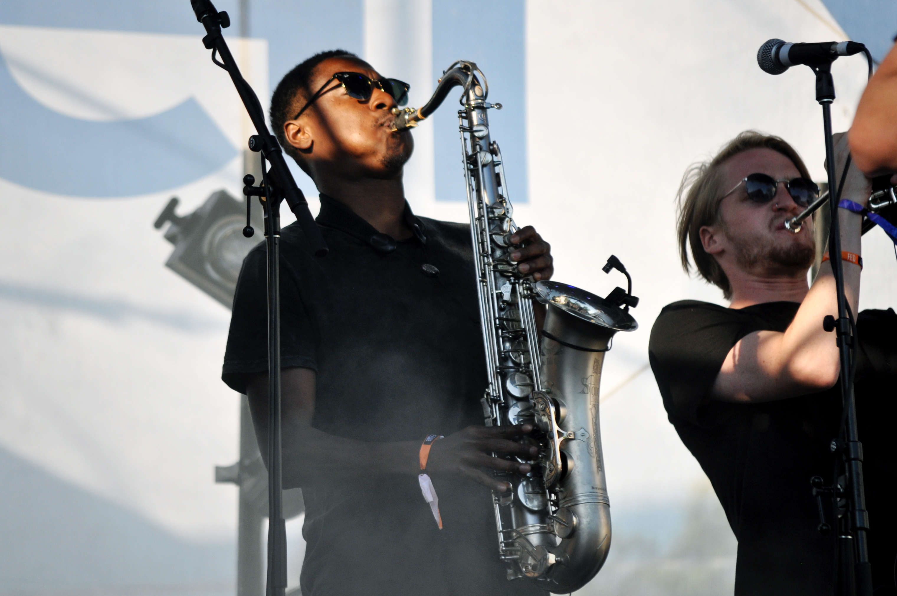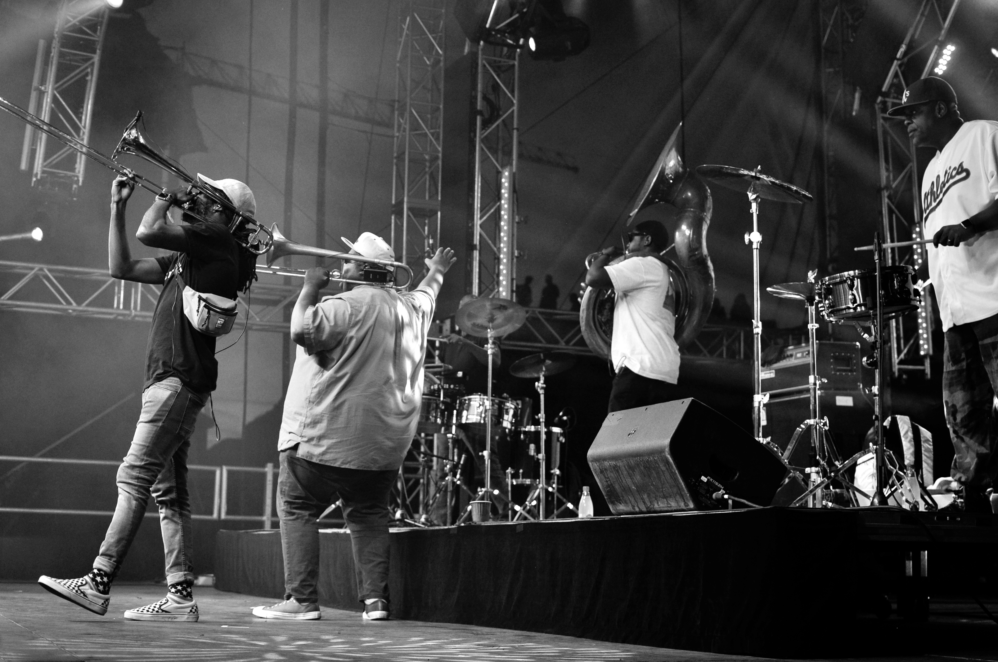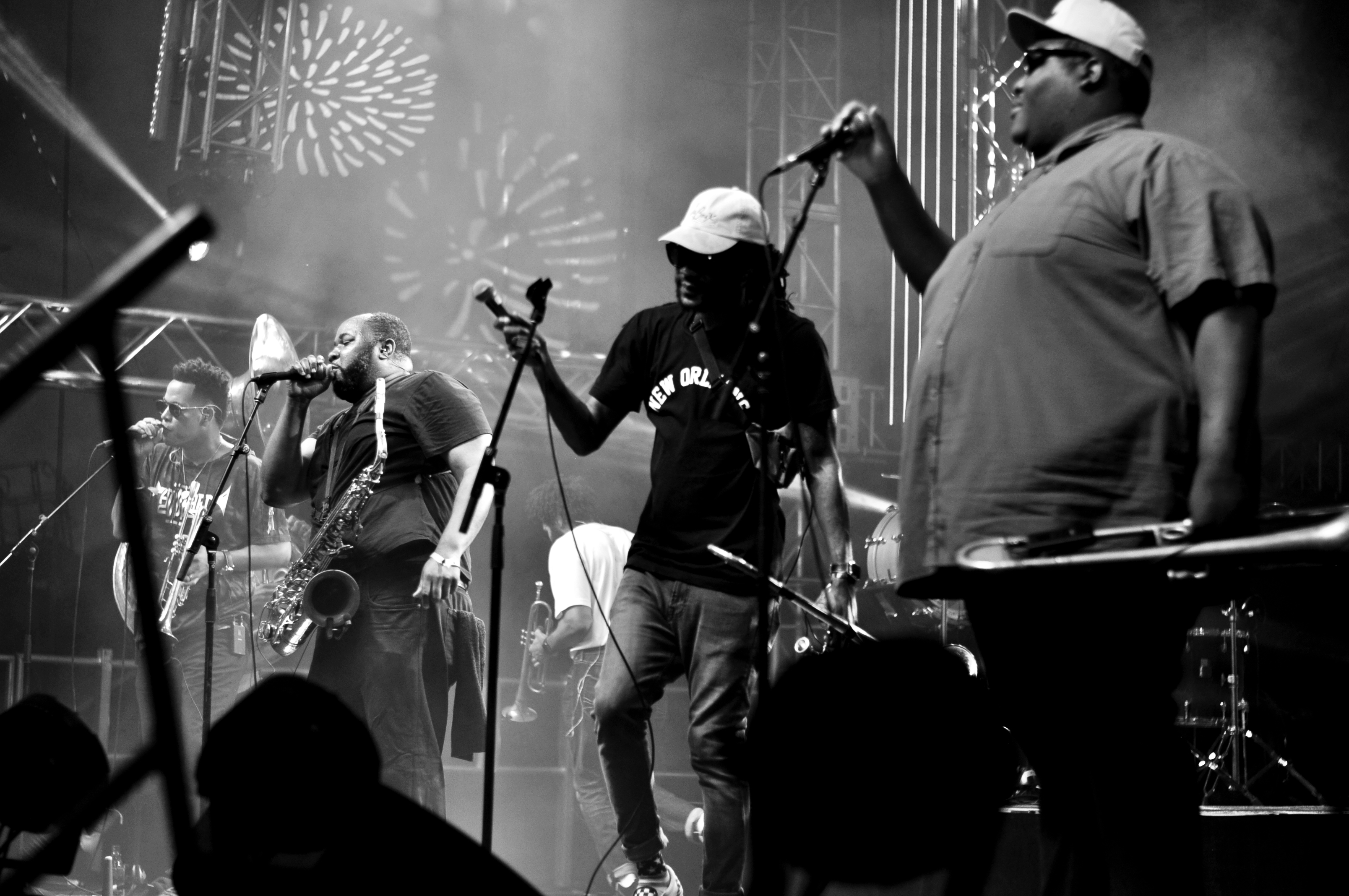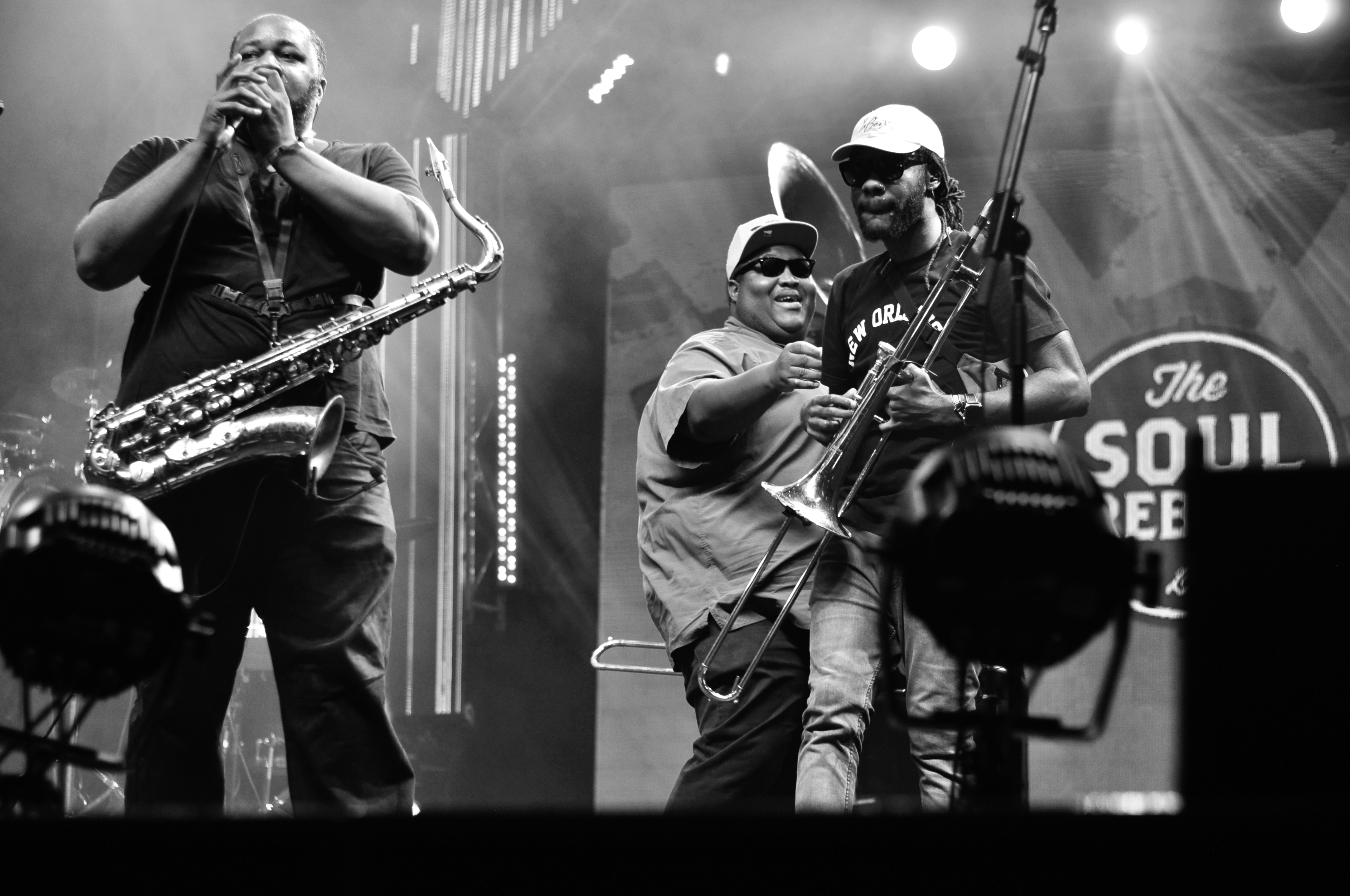Fin de soirée avec une jolie découverte bien festive : The Soul Rebels. Neuf Noirs-américains de la Nouvelle-Orléans qui maîtrisent leur instrument comme personne. Un quintet de cuivre qui joue en harmonie au quart de soupir près. Pour la section rythmique très fanfare : deux percus et un soubassophone en arrière. Quelques passages chantés et voilà la place d’Youville qui fête l’été et la musique. Très bon !