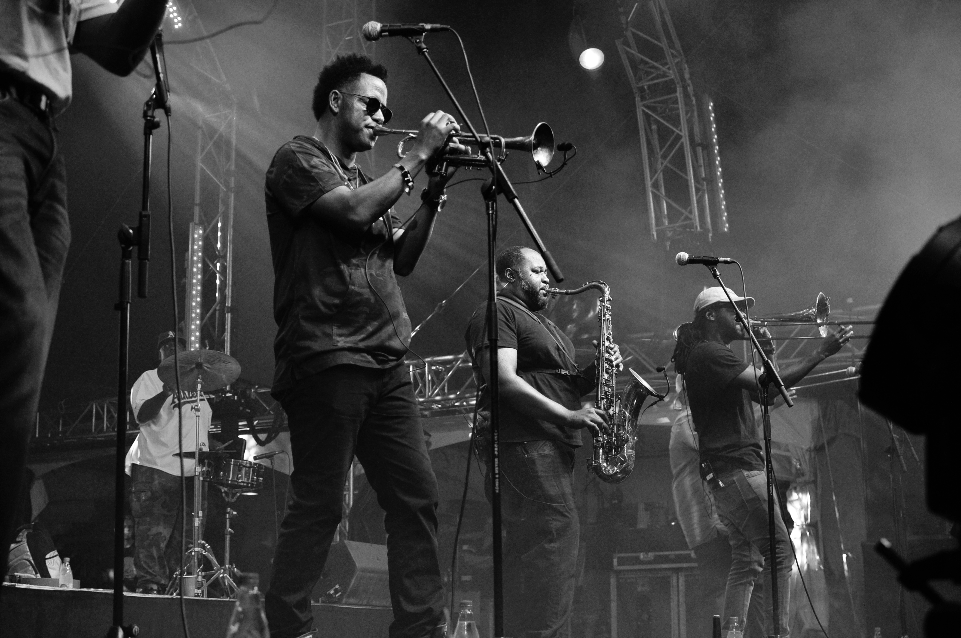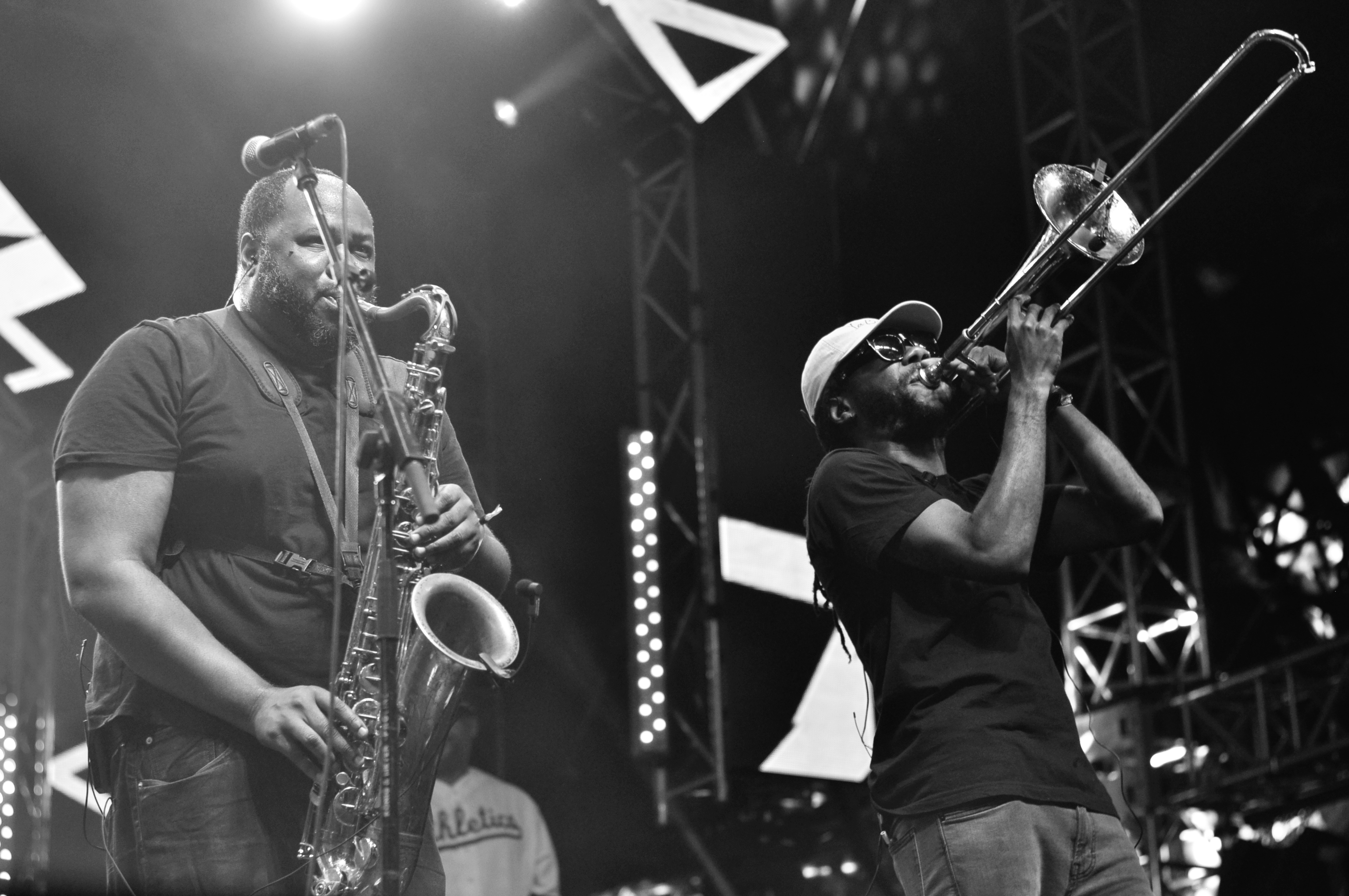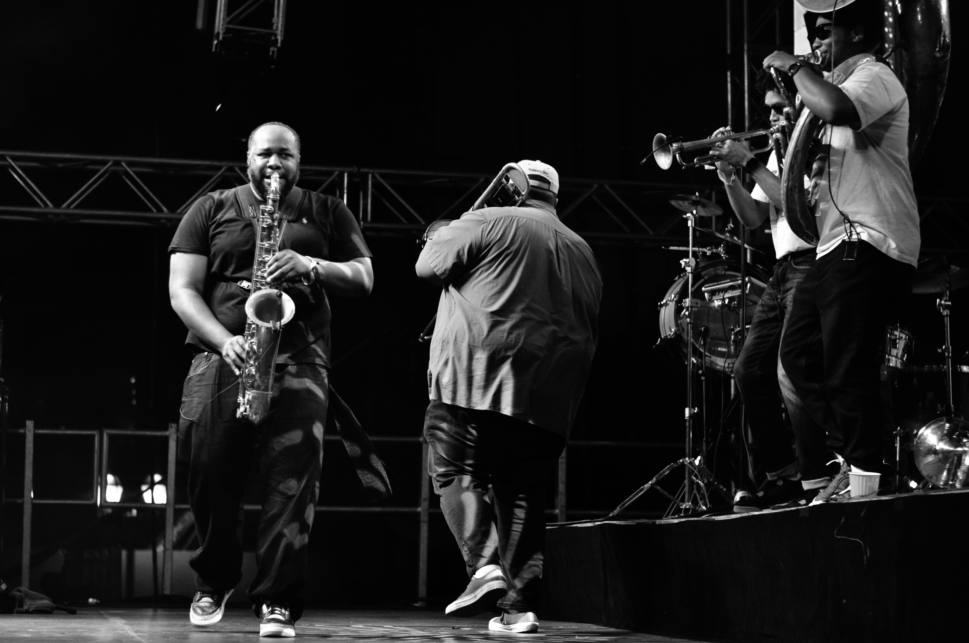Fin de soirée avec une jolie découverte bien festive : The Soul Rebels. Neuf Noirs-américains de la Nouvelle-Orléans qui maîtrisent leur instrument comme personne. Un quintet de cuivre qui joue en harmonie au quart de soupir près. Pour la section rythmique très fanfare : deux percus et un soubassophone en arrière. Quelques passages chantés et voilà la place d’Youville qui fête l’été et la musique. Très bon !
