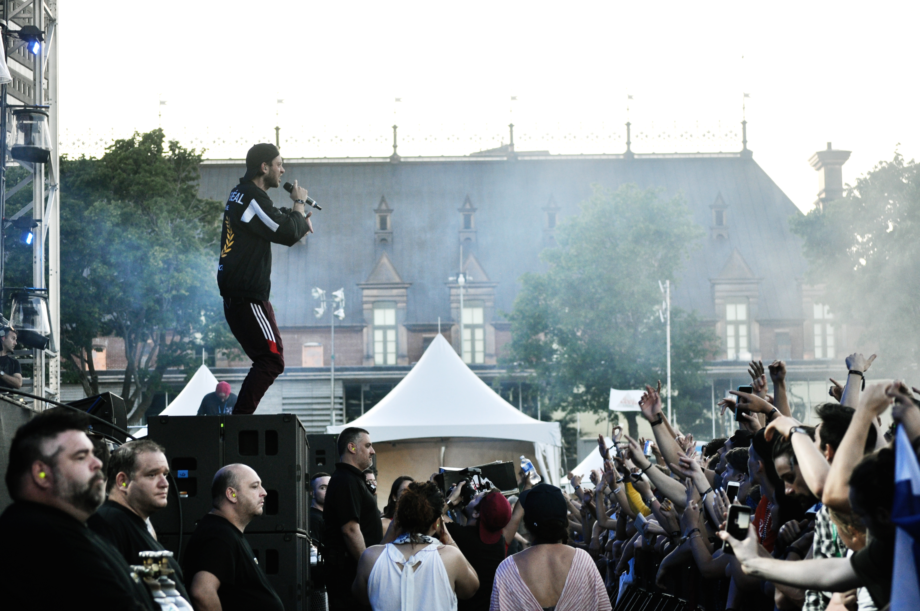 On passe au rap du côté des Plaines, puisque Loud et son DJ Ajust ont fait grimper la chaleur et l’excitation effarante du public en quelques minutes. Des vigiles sur la défensive, des malaises en veux-tu en voilà dans les premiers rangs comprimés contre la barrière de sécurité… et du mosh-pit dans la fosse. Voilà un peu l’ambiance dans laquelle le rappeur québécois débarque avec “So Far, So Good”. Sourires aux lèvres, Loud arpente inlassablement la grande scène Bell allant chercher son public qui scande chaque mot avec lui. Il s’accordera même une petite immersion dans le pit pour aller saluer ses fans. Définitivement un concert record pour Une année record.