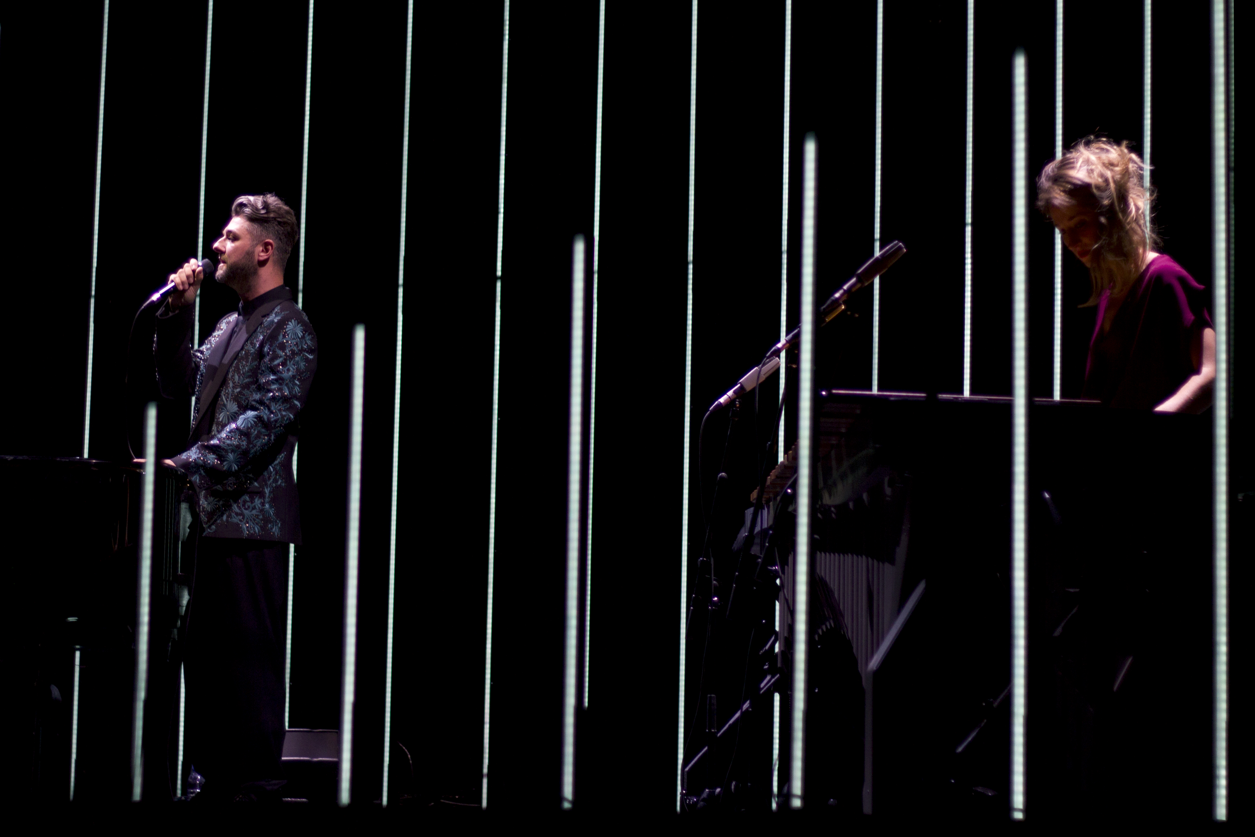 Sur scène, Pierre Lapointe est accompagné d’un piano et d’un marimba, créant tantôt une ambiance douce et romantique, tantôt percussive et rythmique. L’orchestration est fabuleuse, tout comme la scénographie et les lumières. Autour du trio, des tubes de néon forment un amphithéâtre lumineux et animé, ajoutant parfois du psychédélique, parfois de la quiétude, aux titres chantés.