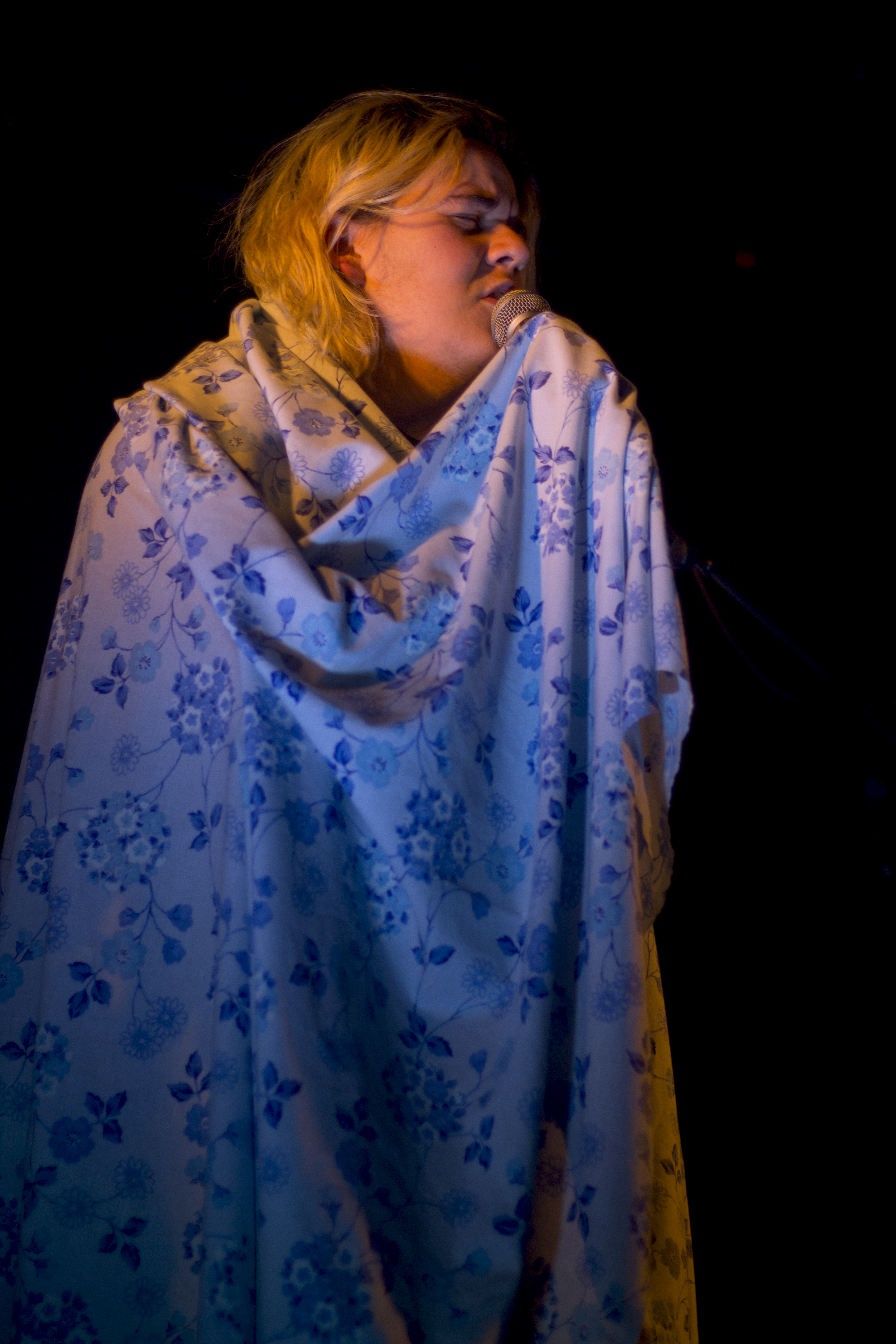 C’est enroulée dans un drap fleuri que la jeune femme fait son apparition. Présence fantomatique qui se cache des regards, elle entame le set en chantant les premiers mots de “Miroir” : “Je m’excuse de mon corps”. Le ton est donné. On entre tout de suite dans un cocon de douceur, intense en émotions. Introspectif et douloureux, ce deuxième opus nous plonge dans de vieilles blessures, comme la difficile acceptation de soi, la mort, le manque, la séparation, etc. avec les titres “Les chemins”, “Sans titre” ou “1998”.