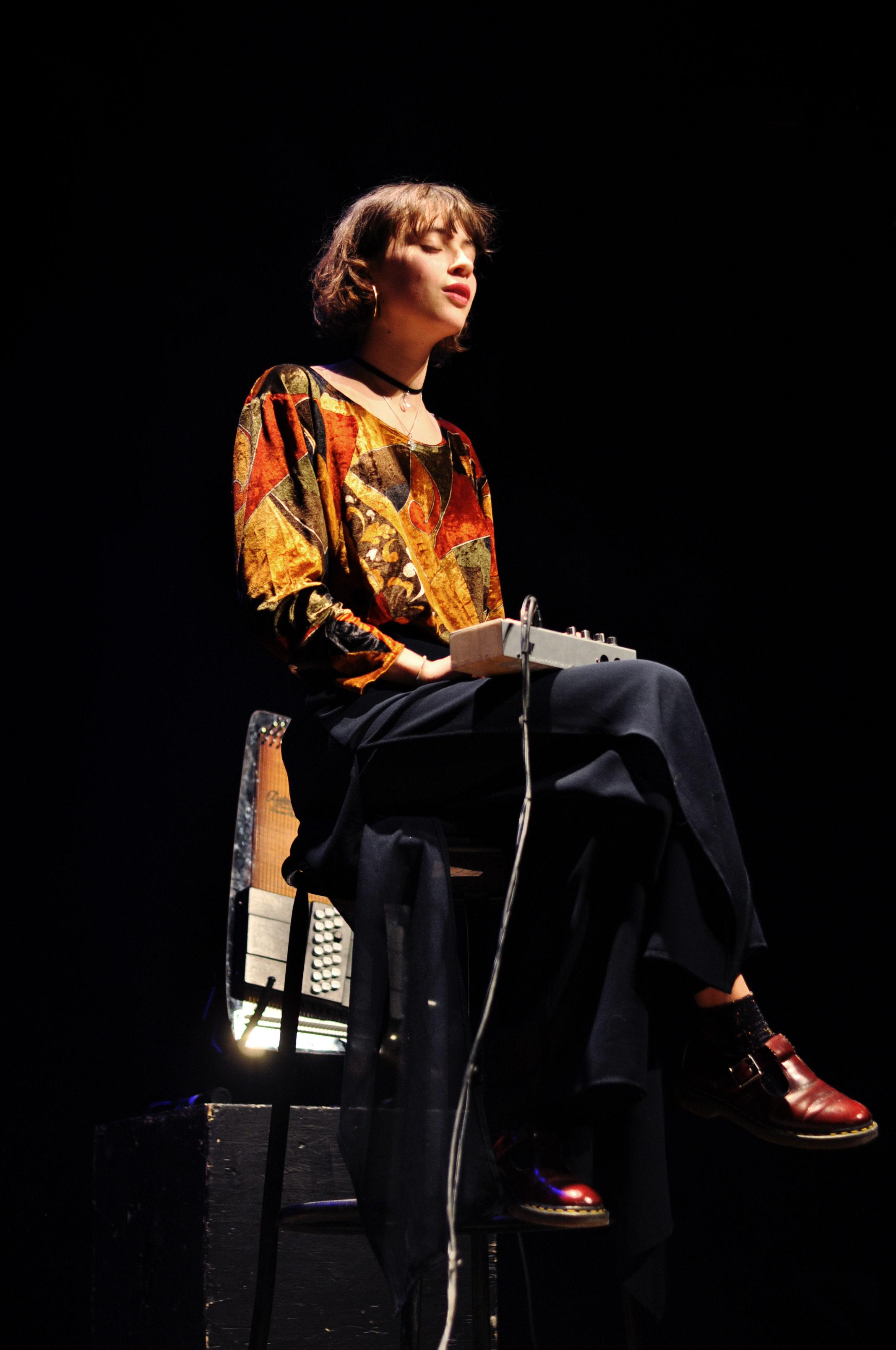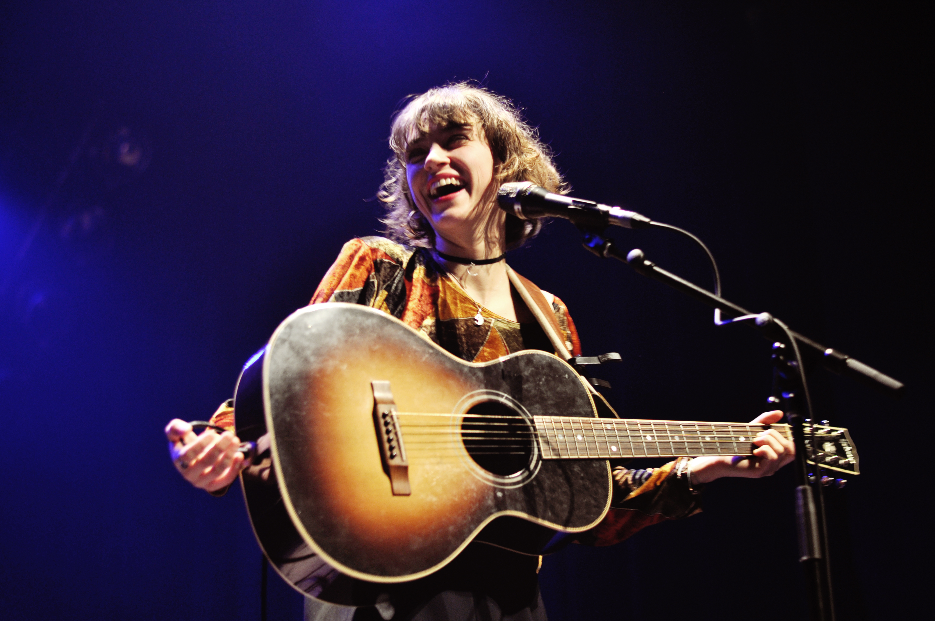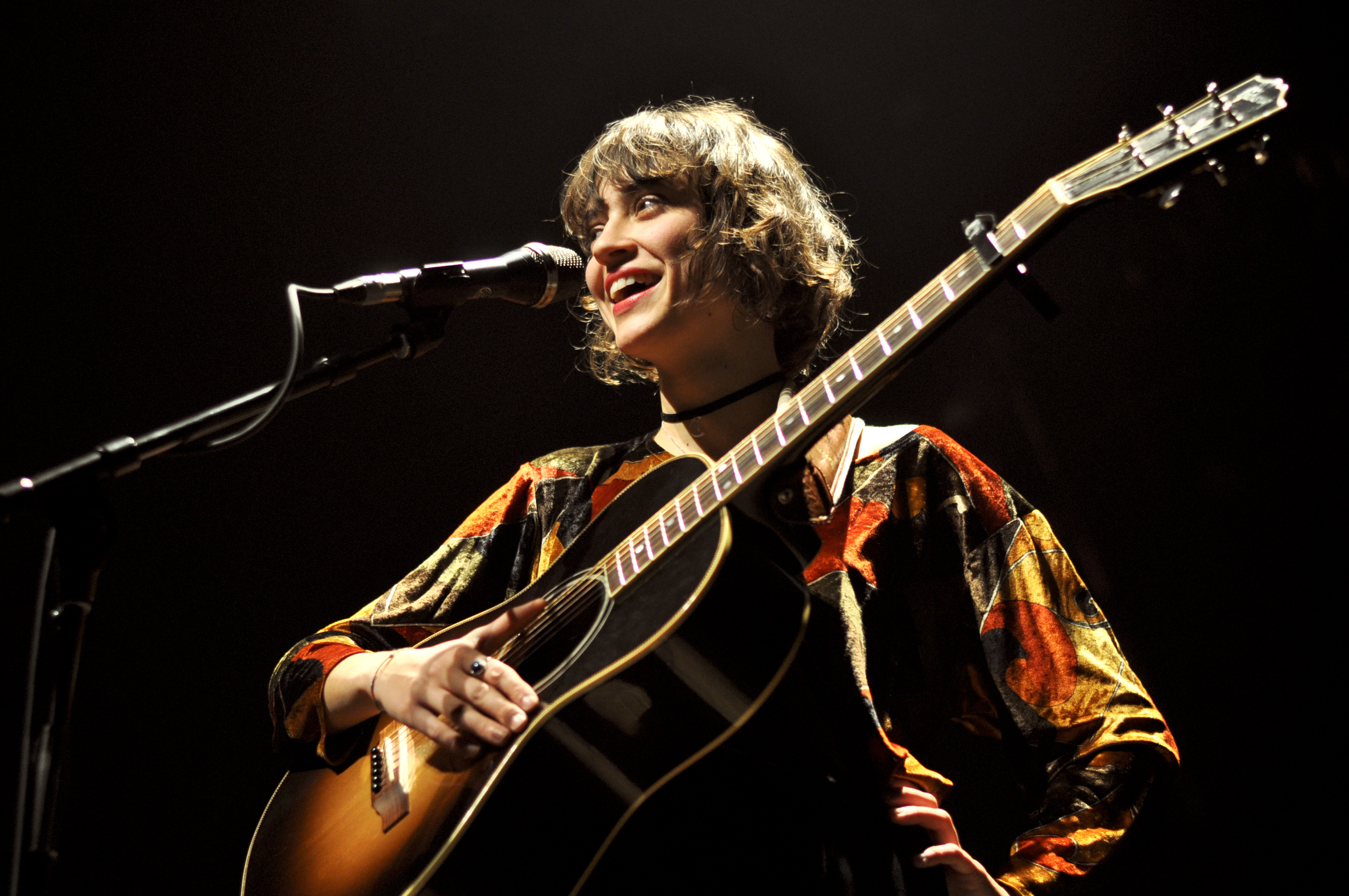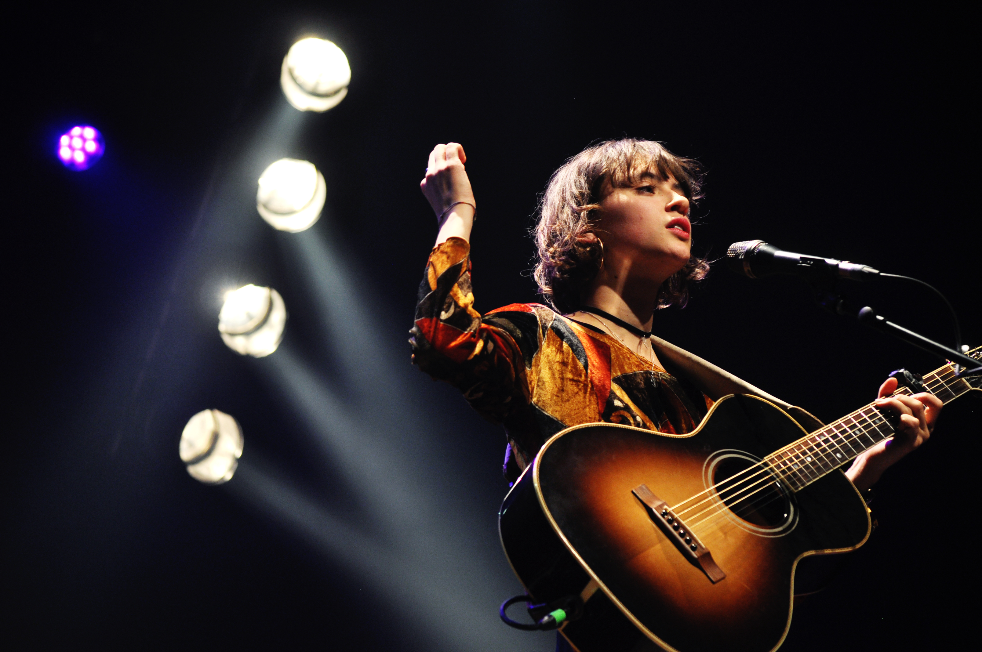 Pomme débarque sur scène quelques minutes avant 21h, et après avoir fait une courte introduction instrumentale avec une petite machine électronique posée sur ses genoux, elle entame le bal avec “À peu près”. La jeune femme s’accompagne uniquement de guitares et de sa fidèle auto-harpe. Elle chante les titres de son premier album sorti il y a un maintenant.
