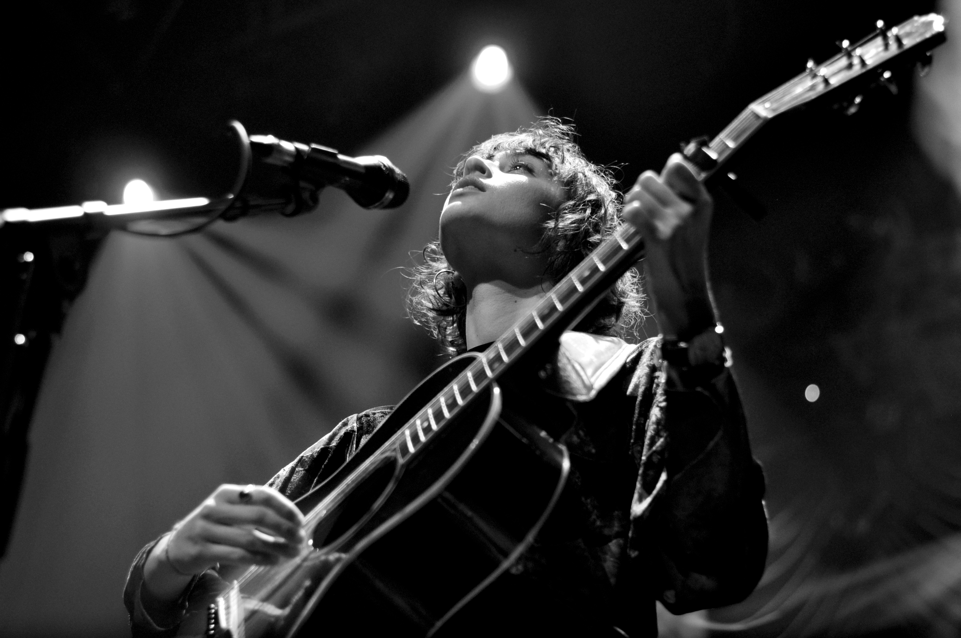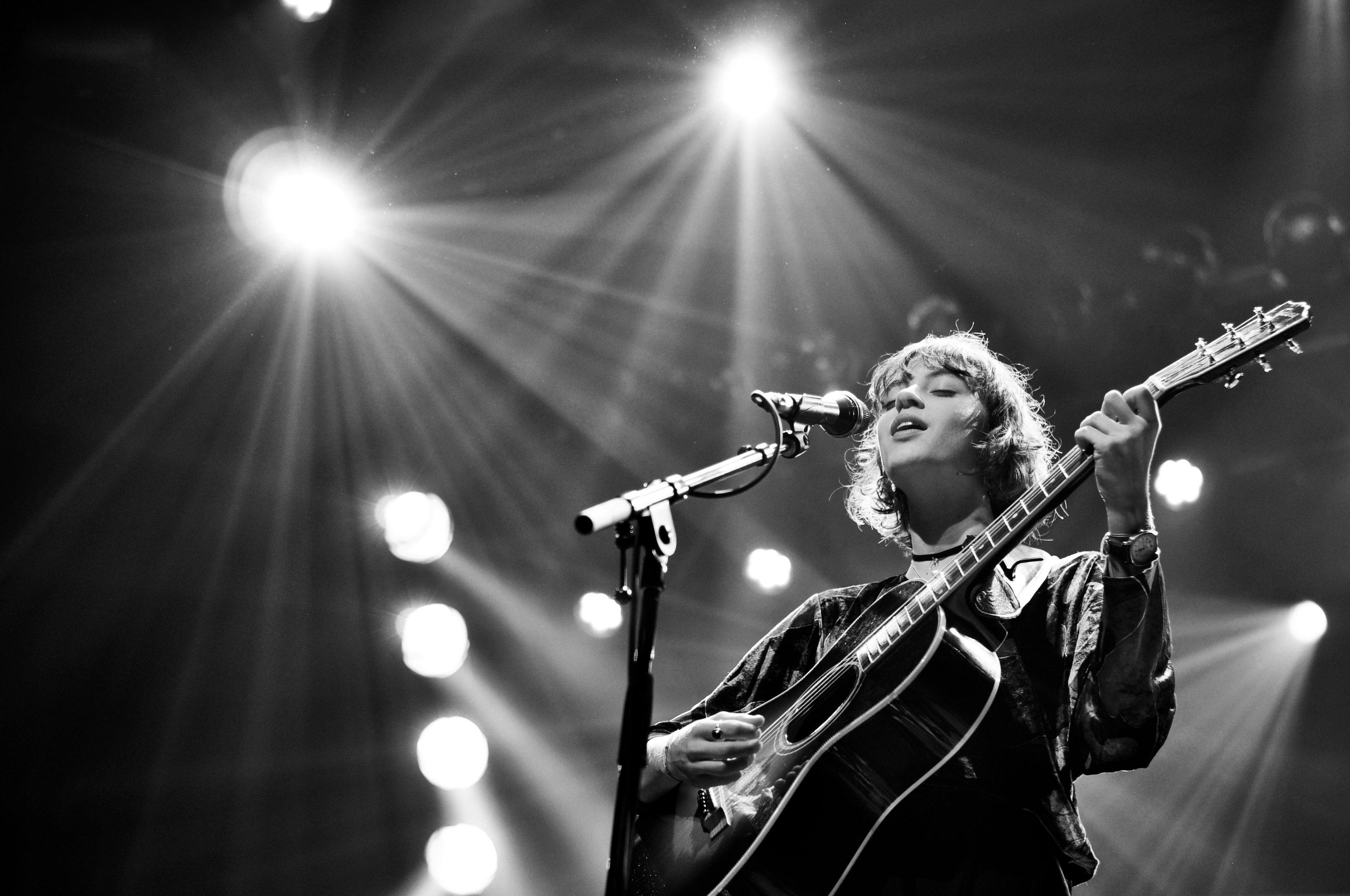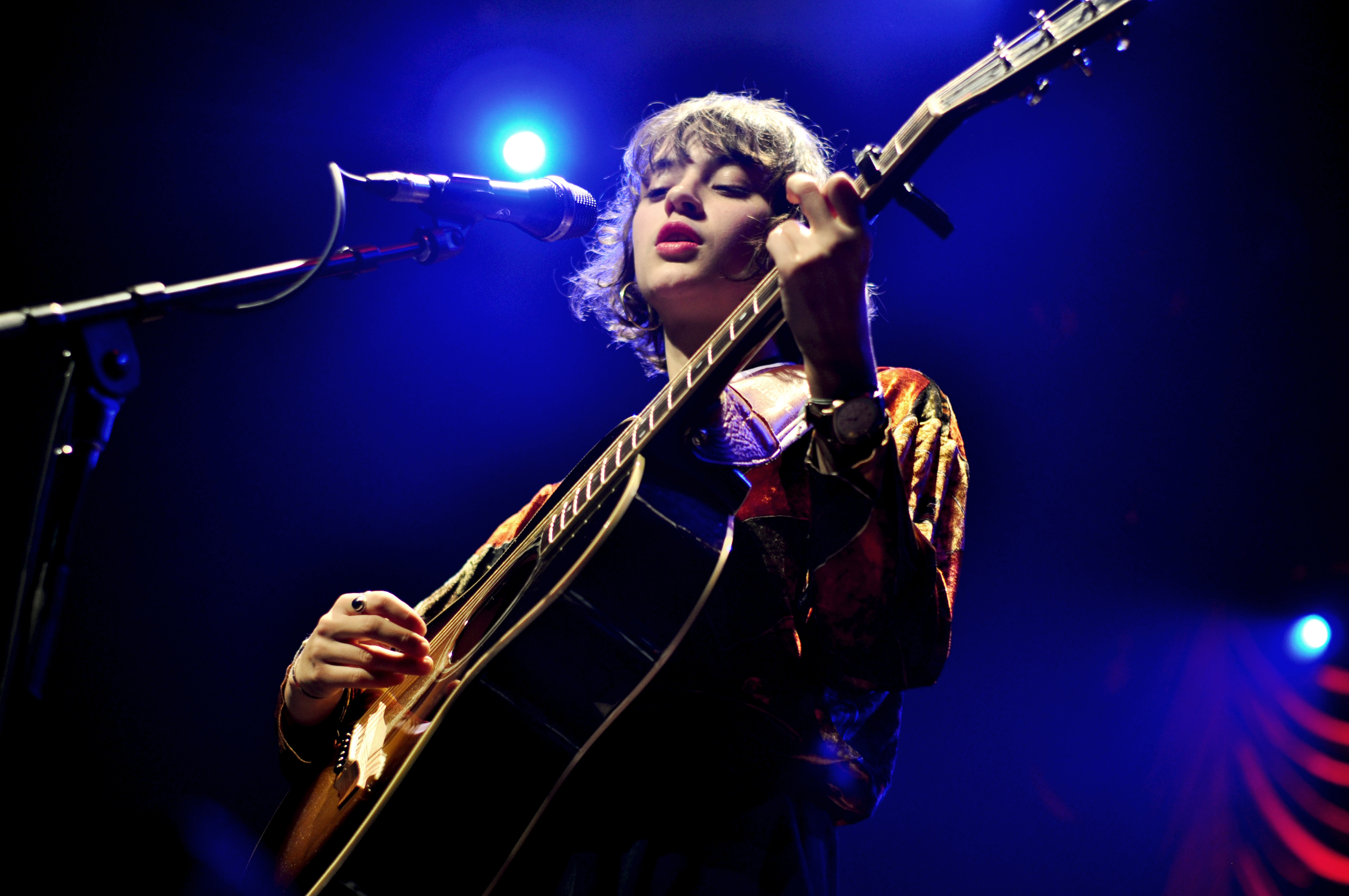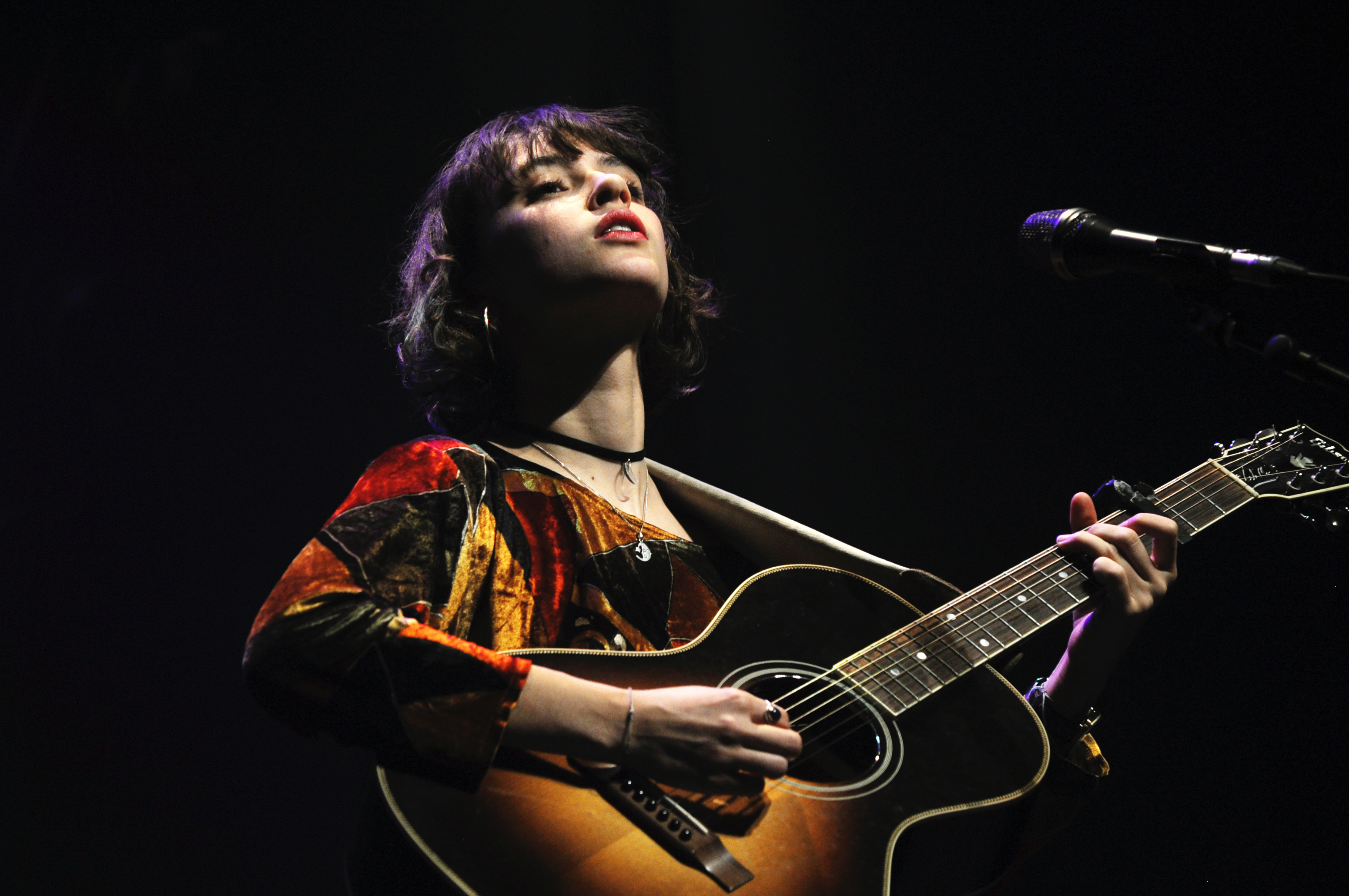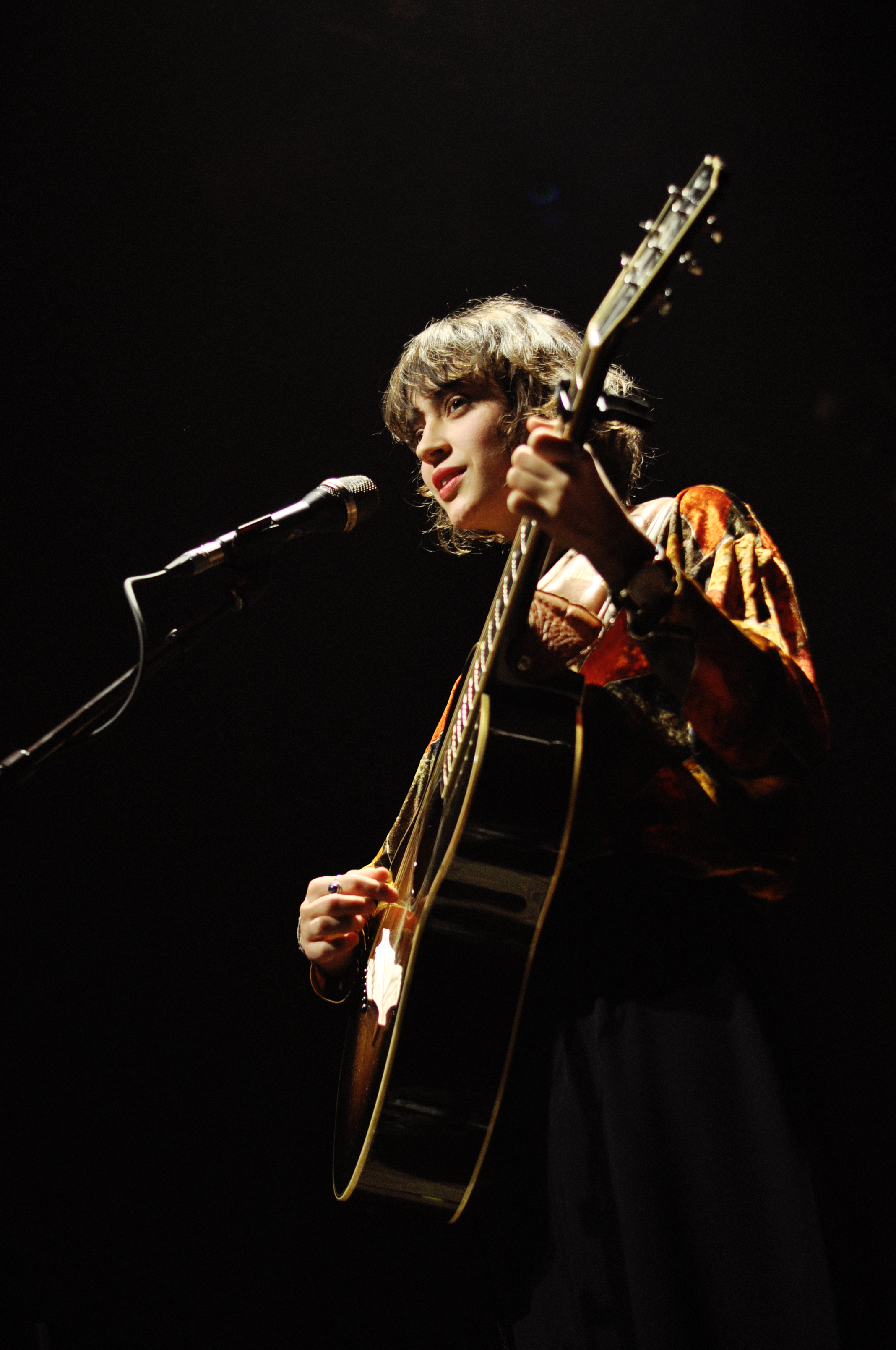 Pomme débarque sur scène quelques minutes avant 21h, et après avoir fait une courte introduction instrumentale avec une petite machine électronique posée sur ses genoux, elle entame le bal avec “À peu près”. La jeune femme s’accompagne uniquement de guitares et de sa fidèle auto-harpe. Elle chante les titres de son premier album sorti il y a un maintenant.