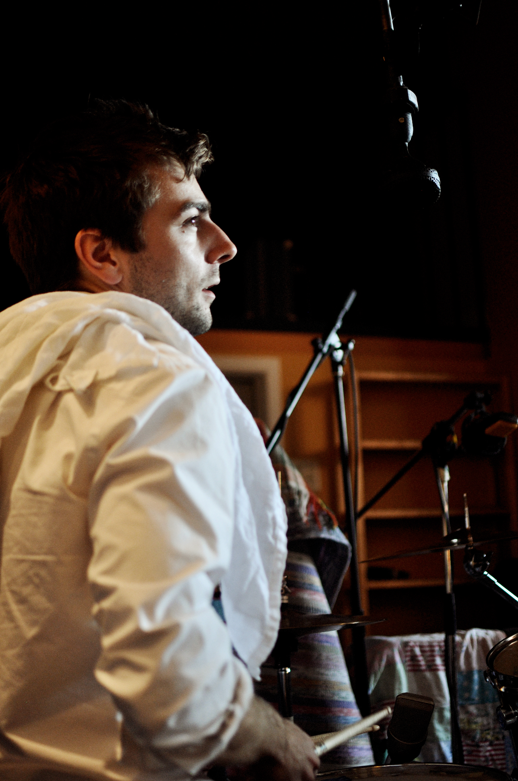 Alex, Julien et Mark (batterie) sont déjà là. Christophe (basse) travaille dans la matinée et va nous rejoindre quelques minutes plus tard. En attendant, les trois gars écoutent les enregistrements de la veille, concentrés autour de la table de mixage. Ils peaufinent ce qu’ils peuvent. Ils sont déjà bien fiers de leur travail.