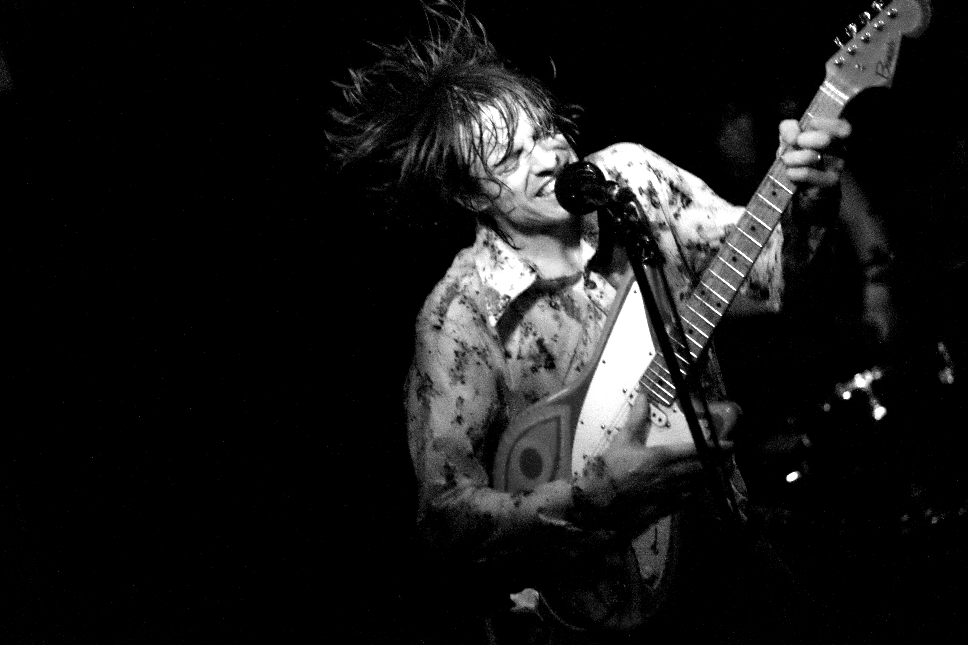 Tout ce que je peux vraiment faire, c’est te dire qu’après les avoir découverts à Nancy pour les Nuits de l’Alligator, je ne peux que confirmer l’évidence après un concert dans un club allemand. Cette évidence qu’on a besoin de plus de groupes comme The Schizophonics, qui n’ont pour seule limite que celle de leur propre corps. Et je peux te dire que le corps de Pat Beers a des limites bien différentes des tiennes. Un heure et demi à sauter au-dessus des cordes, à monter et descendre de l’estrade, à grimper là où il pouvait, à se traîner par terre, à danser, à sauter et retomber en grand écart. Une heure et demi de roulades arrière sans lâcher sa guitare, sans même arrêter de la faire sonner comme il fallait, cela relève de l’exploit, du miracle, de la grâce. Oui voilà, The Schizophonics est touché par la grâce.