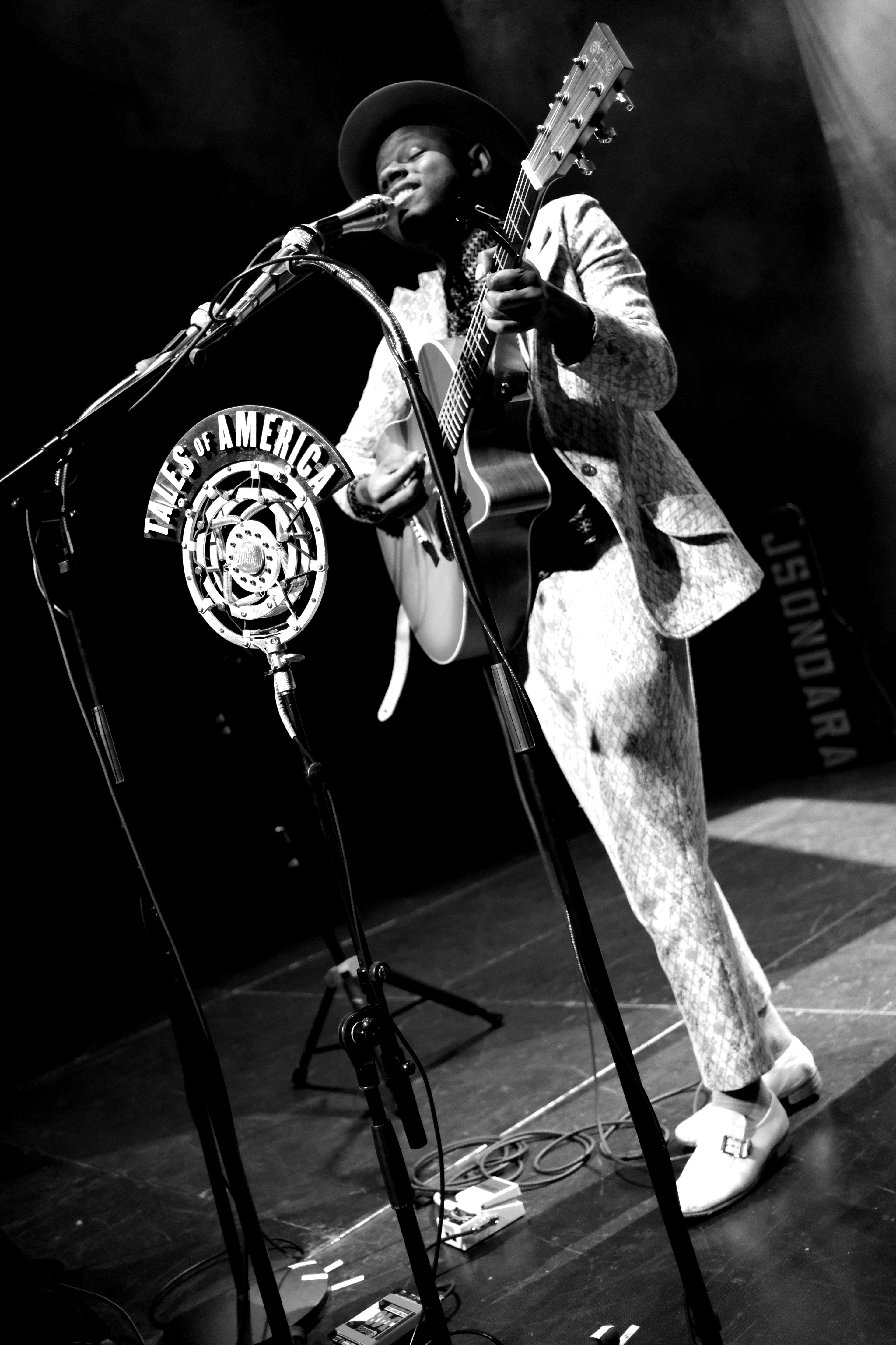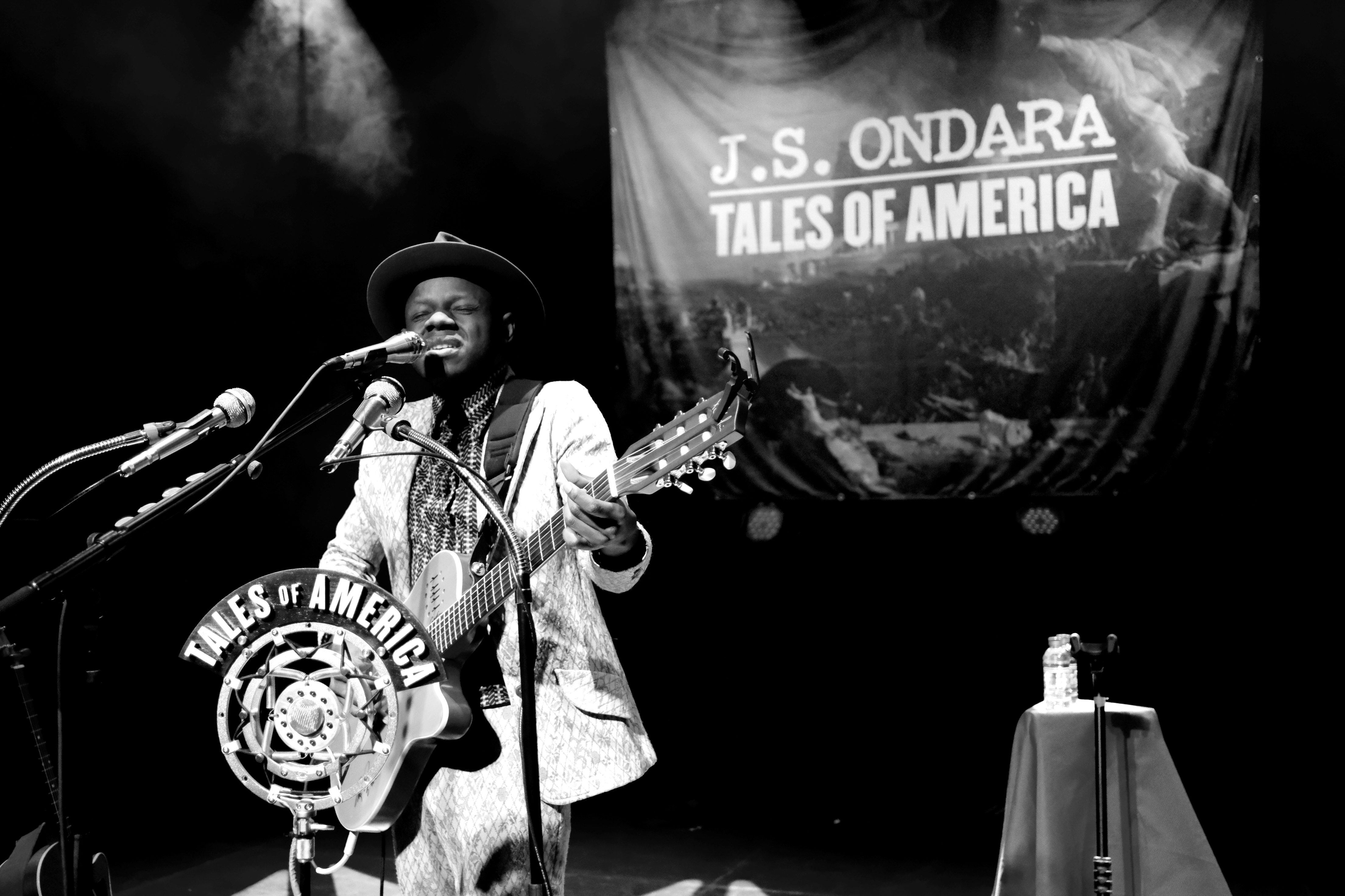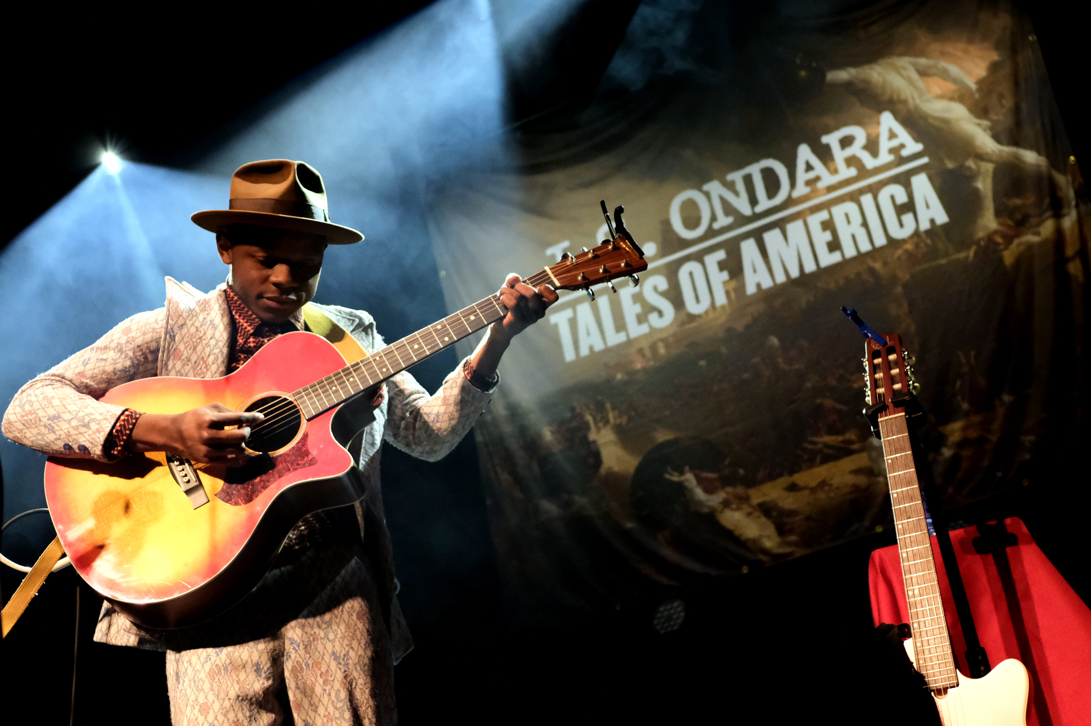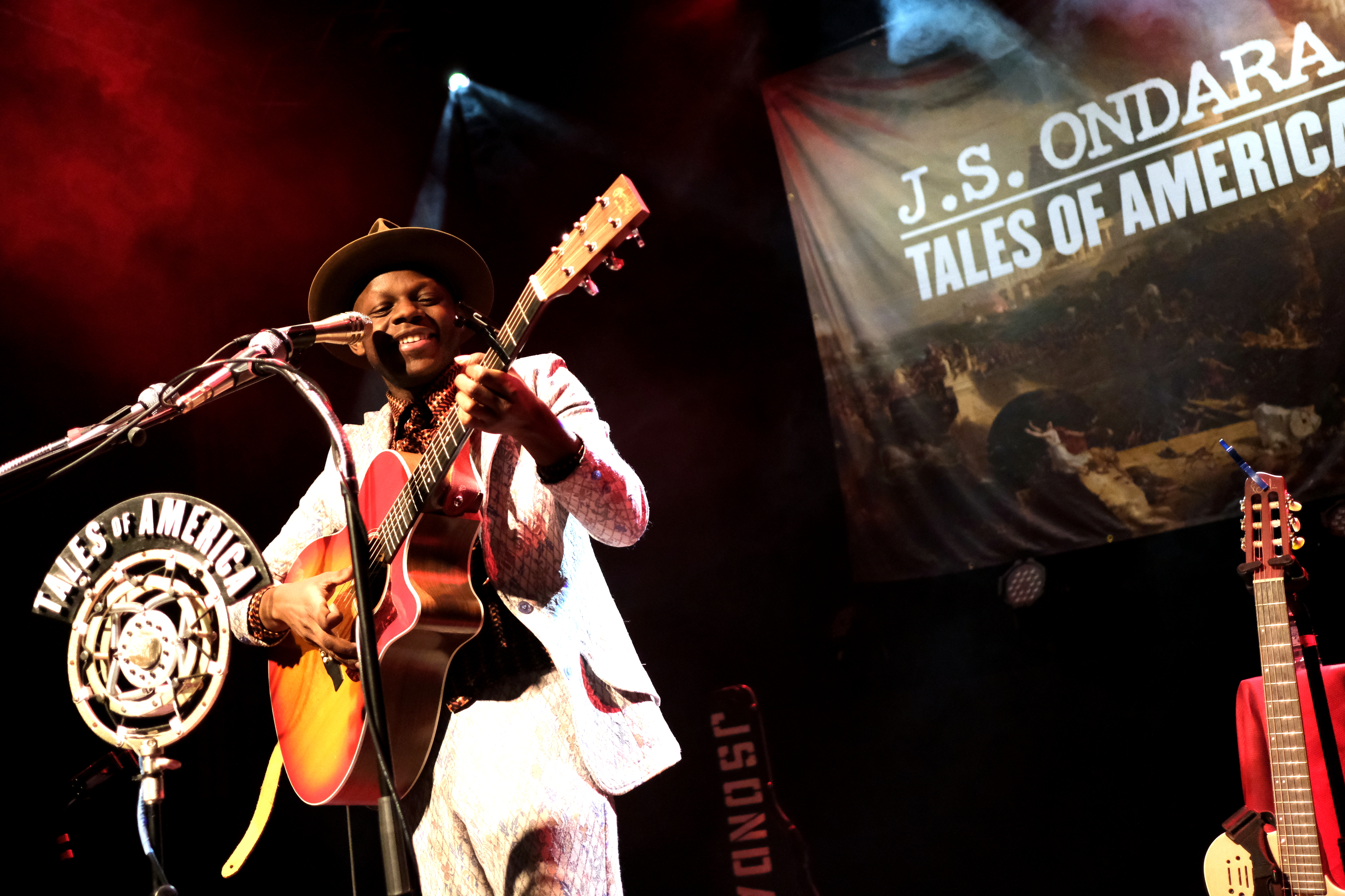 J.S. Ondara est de ces artistes qui ne laissent rien au hasard. RIEN. Ni le costume (très vintage, à petites fleurs), ni la chemise (parfaite, en wax), ni le chapeau (attirail parfait du folkeux). Pareil niveau scénographie. Une énorme tenture en fond, nom en grand sur tableau antique, son étui à guitare, avec encore son nom en blanc, une petite table voilée de rouge pour déposer ses bouteilles, 2 guitares magnifiques, 3 micros de front suppléés d’un micro vintage au nom de l’album. L’esprit de l’Amérique est bien là, tant dans l’imagerie que dans l’énergie et la méticulosité déployées pour un seul homme.