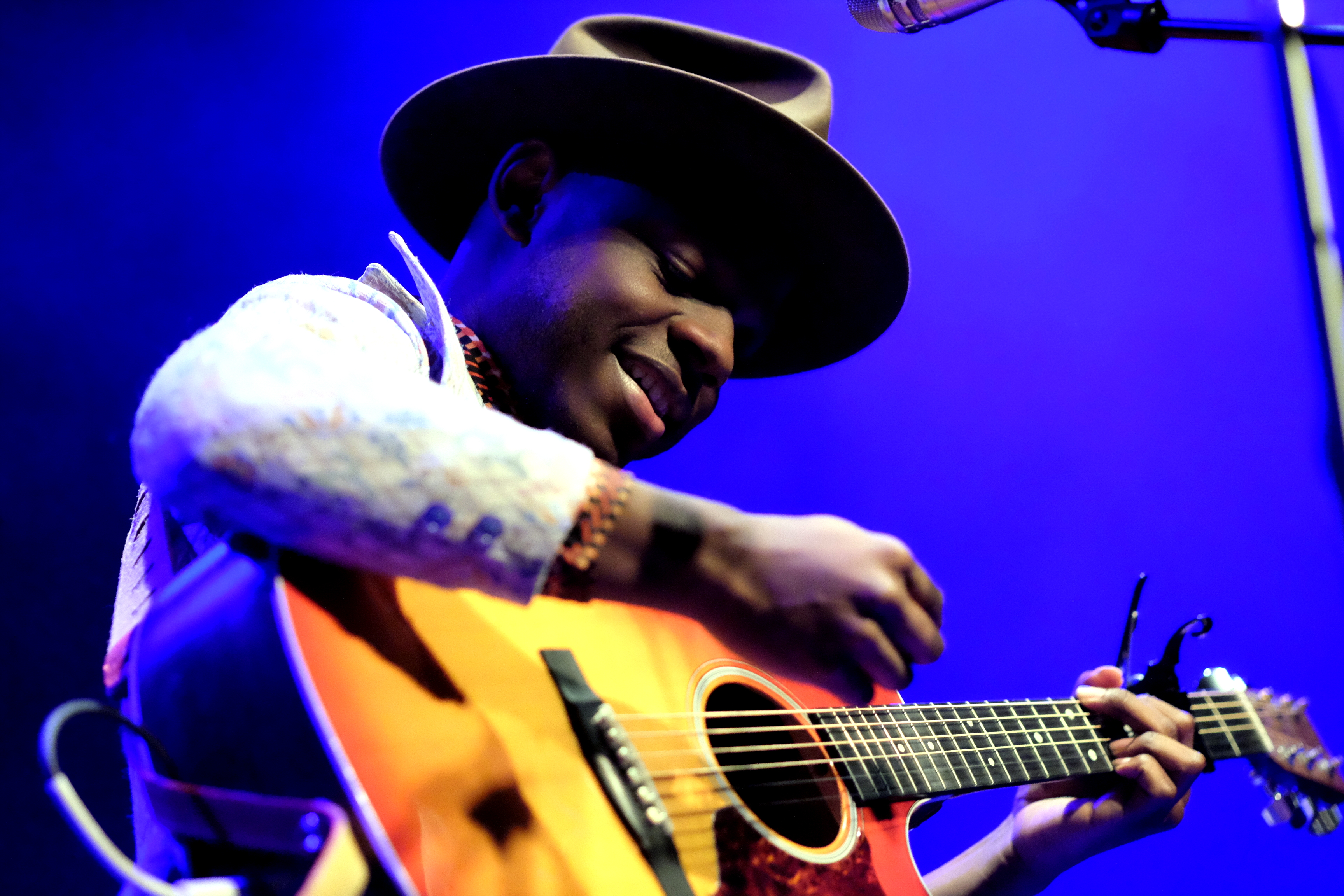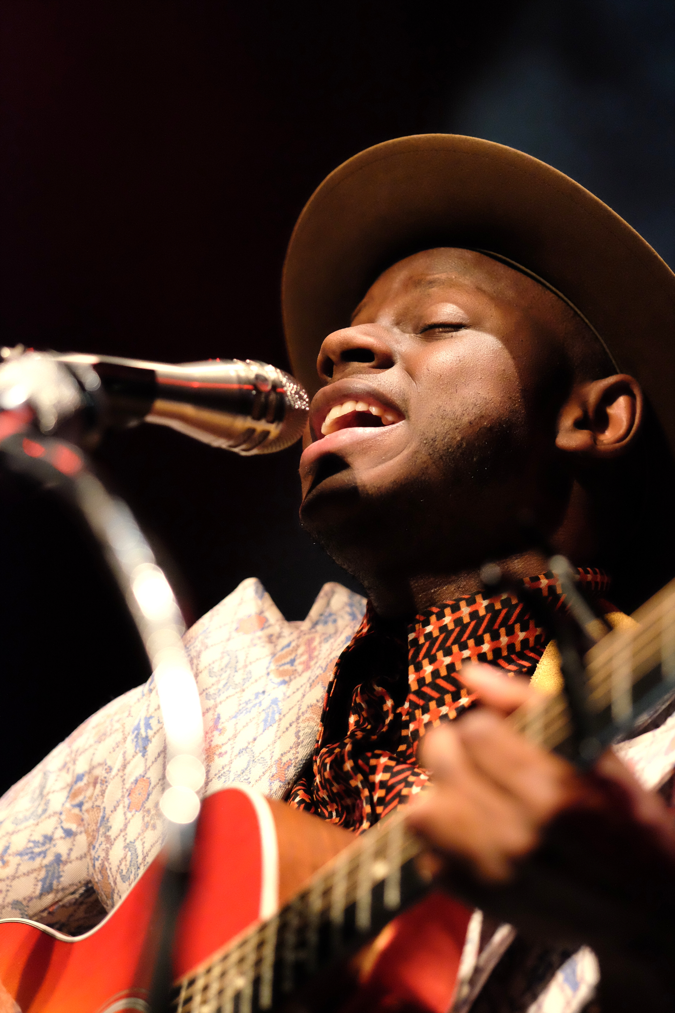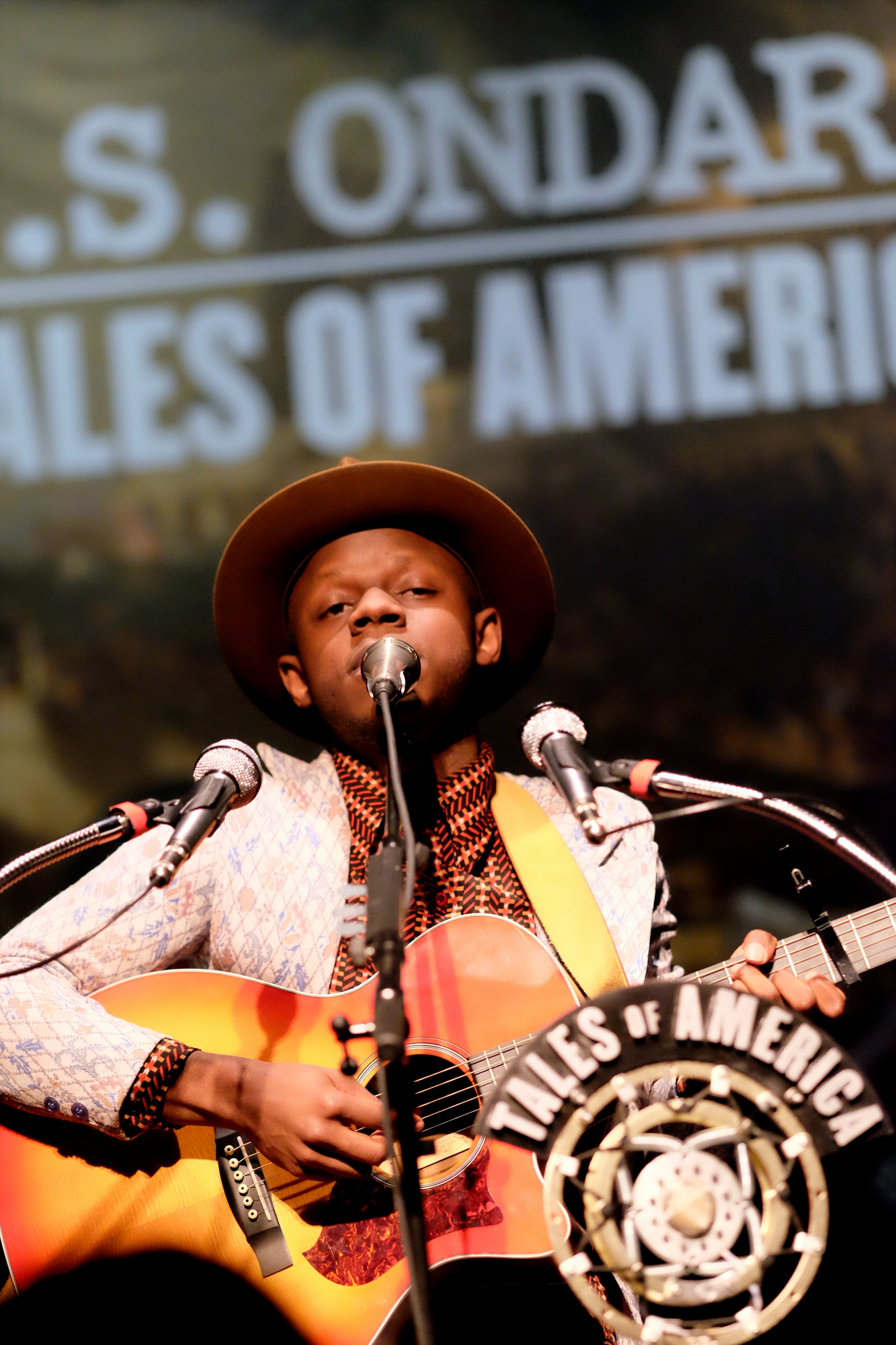 J.S. Ondara est de ces artistes qui ne laissent rien au hasard. RIEN. Ni le costume (très vintage, à petites fleurs), ni la chemise (parfaite, en wax), ni le chapeau (attirail parfait du folkeux). Pareil niveau scénographie. Une énorme tenture en fond, nom en grand sur tableau antique, son étui à guitare, avec encore son nom en blanc, une petite table voilée de rouge pour déposer ses bouteilles, 2 guitares magnifiques, 3 micros de front suppléés d’un micro vintage au nom de l’album. L’esprit de l’Amérique est bien là, tant dans l’imagerie que dans l’énergie et la méticulosité déployées pour un seul homme.