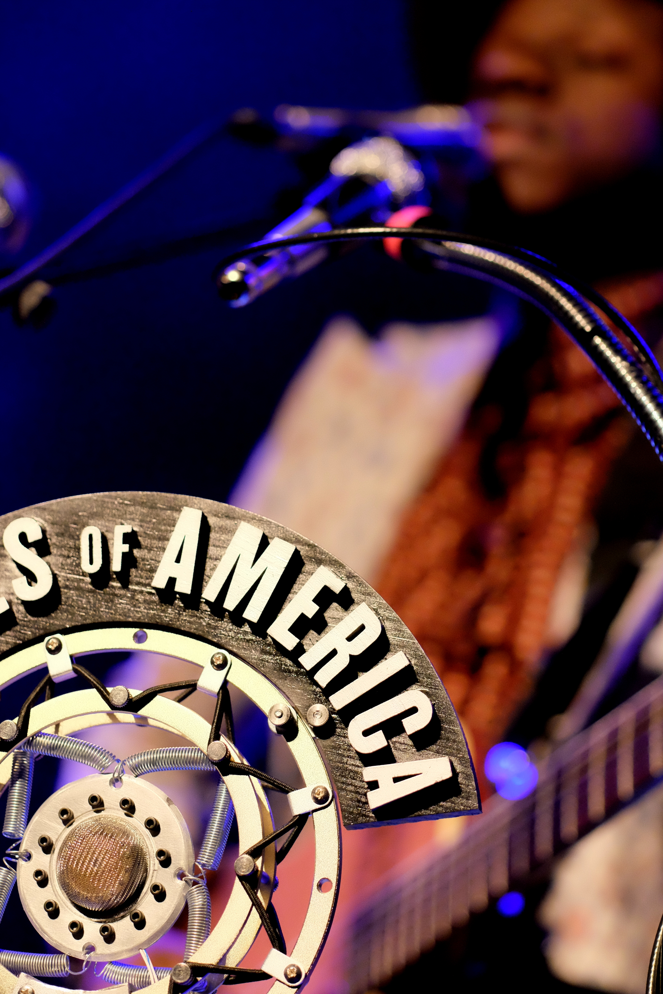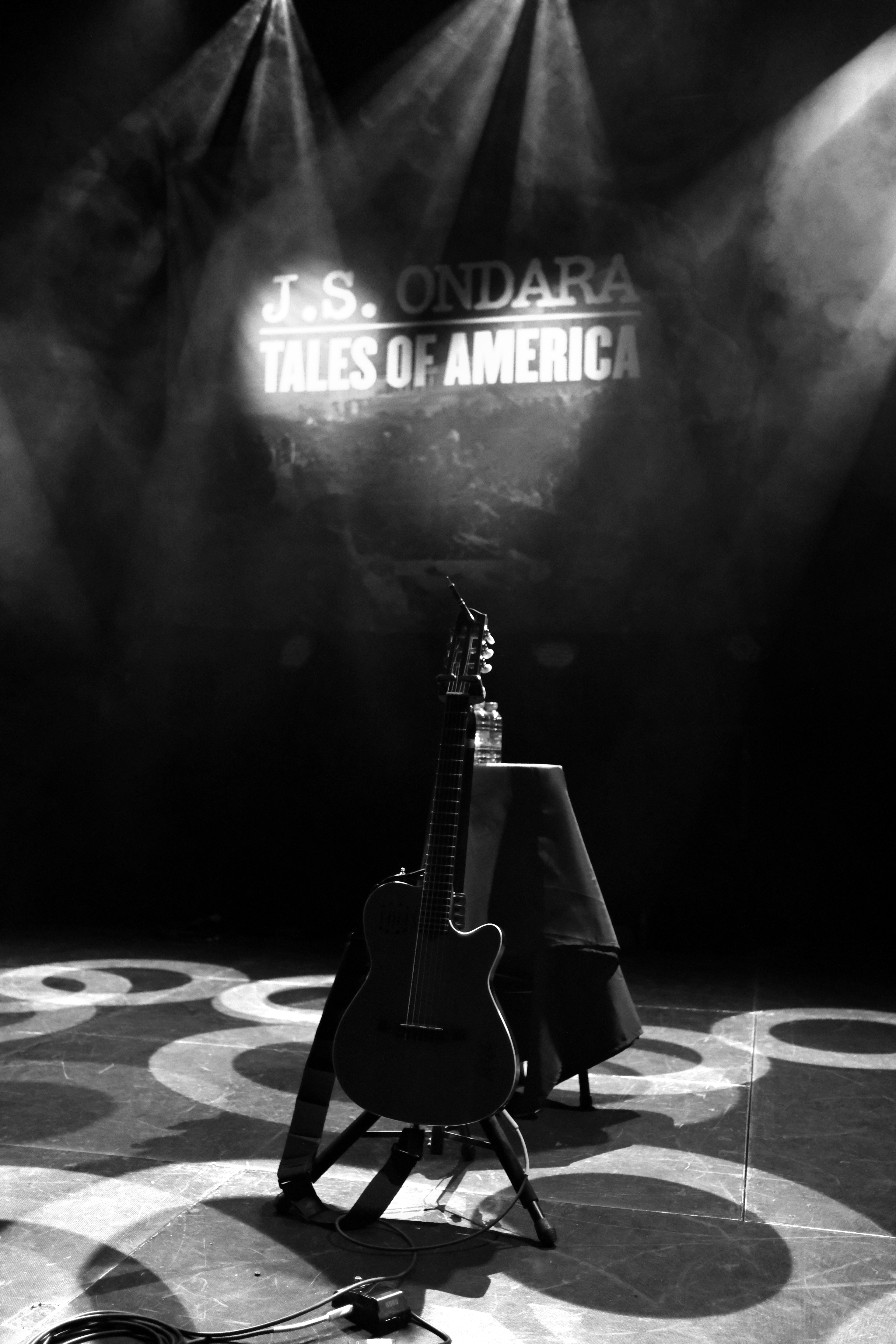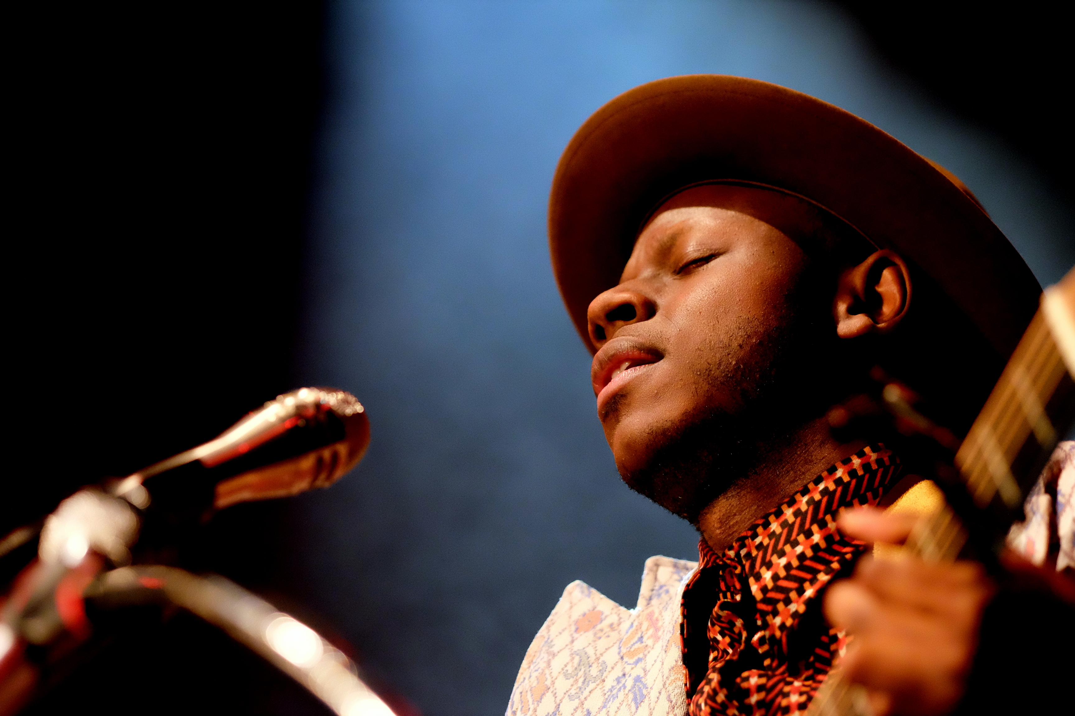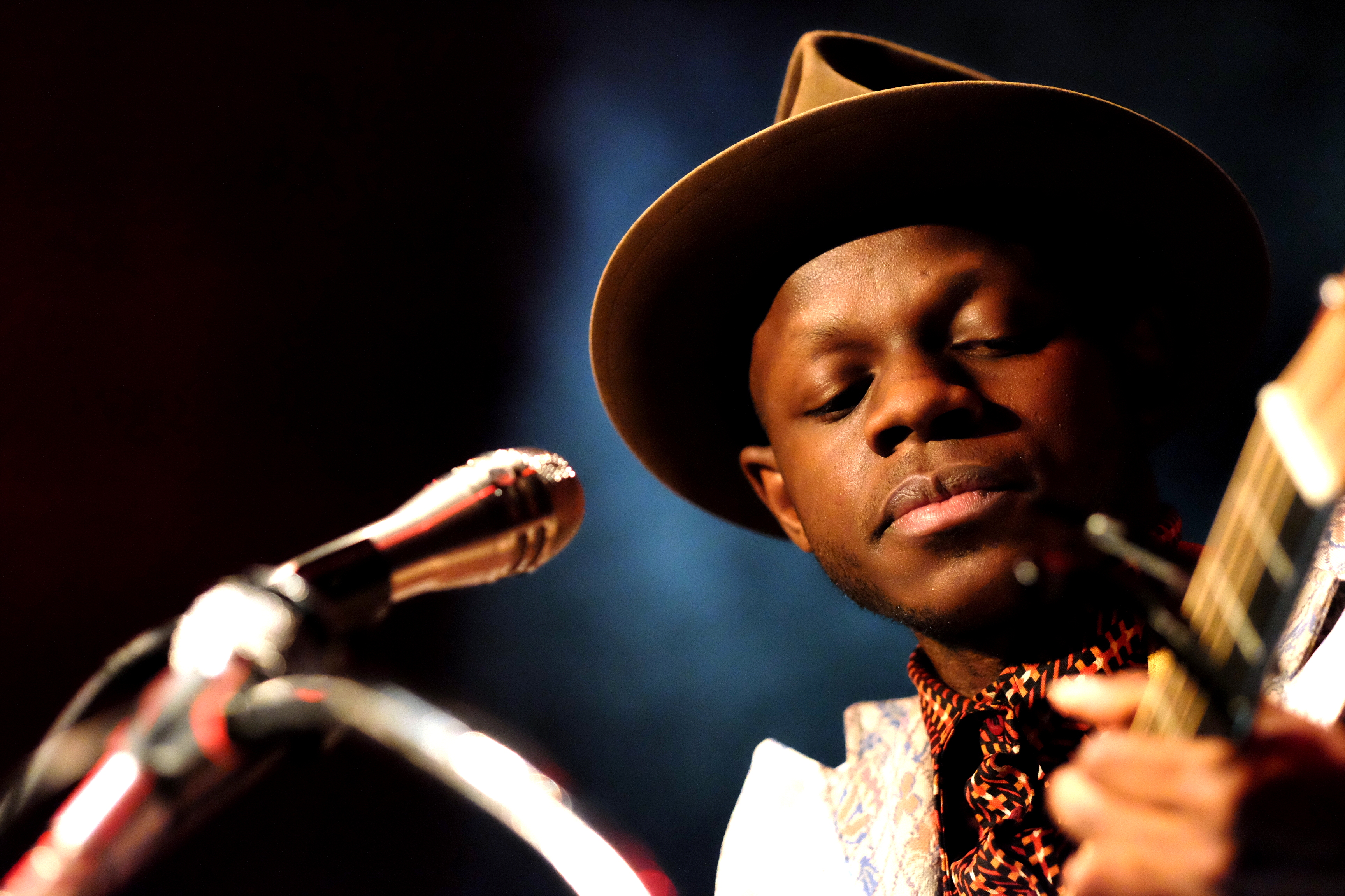 J.S. Ondara est de ces artistes qui ne laissent rien au hasard. RIEN. Ni le costume (très vintage, à petites fleurs), ni la chemise (parfaite, en wax), ni le chapeau (attirail parfait du folkeux). Pareil niveau scénographie. Une énorme tenture en fond, nom en grand sur tableau antique, son étui à guitare, avec encore son nom en blanc, une petite table voilée de rouge pour déposer ses bouteilles, 2 guitares magnifiques, 3 micros de front suppléés d’un micro vintage au nom de l’album. L’esprit de l’Amérique est bien là, tant dans l’imagerie que dans l’énergie et la méticulosité déployées pour un seul homme.