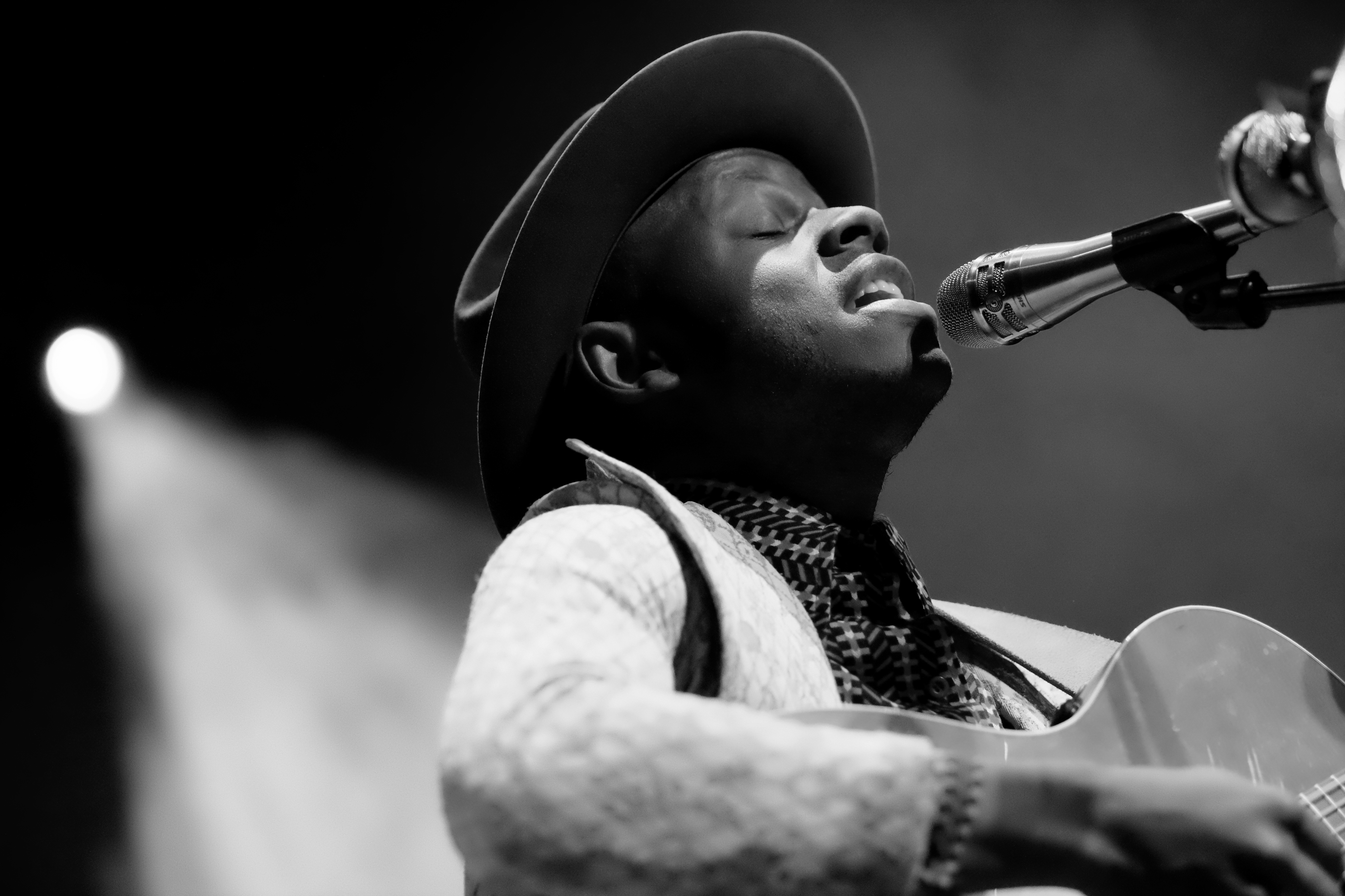 Le set, lui aussi, sera calculé. Tous les titres de l’album y passeront, entrecoupés de petits discours peut-être bien rôdés mais d’une douceur désarmante. On apprend comment le jeune kényan s’est exilé aux États-Unis, comment a eu lieu sa découverte de Bob Dylan, lui qui croyait que “Knockin’ On Heaven’s Door” était des Guns N’Roses, comment il a appris quelques rudiments de français et pourquoi il a fini par choisir le froid Minnesota. Bref, le portrait policé d’un self-made artist qui a semblerait-il eu beaucoup de chance et se retrouve aujourd’hui étonné de tourner partout en France. Mais il est clair qu’il n’est pas arrivé là par hasard et doit moins tout cela à la chance qu’à son propre travail.
