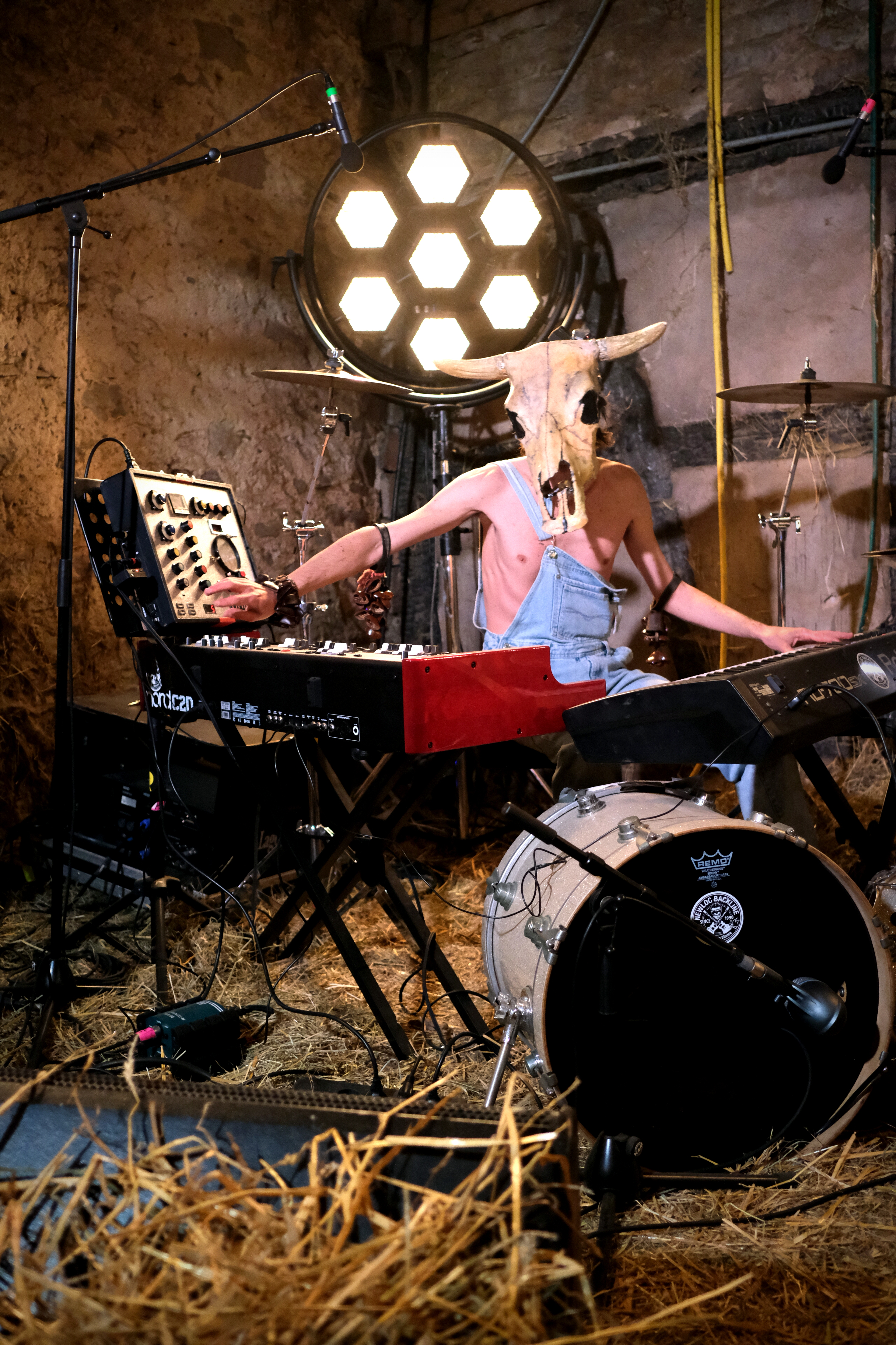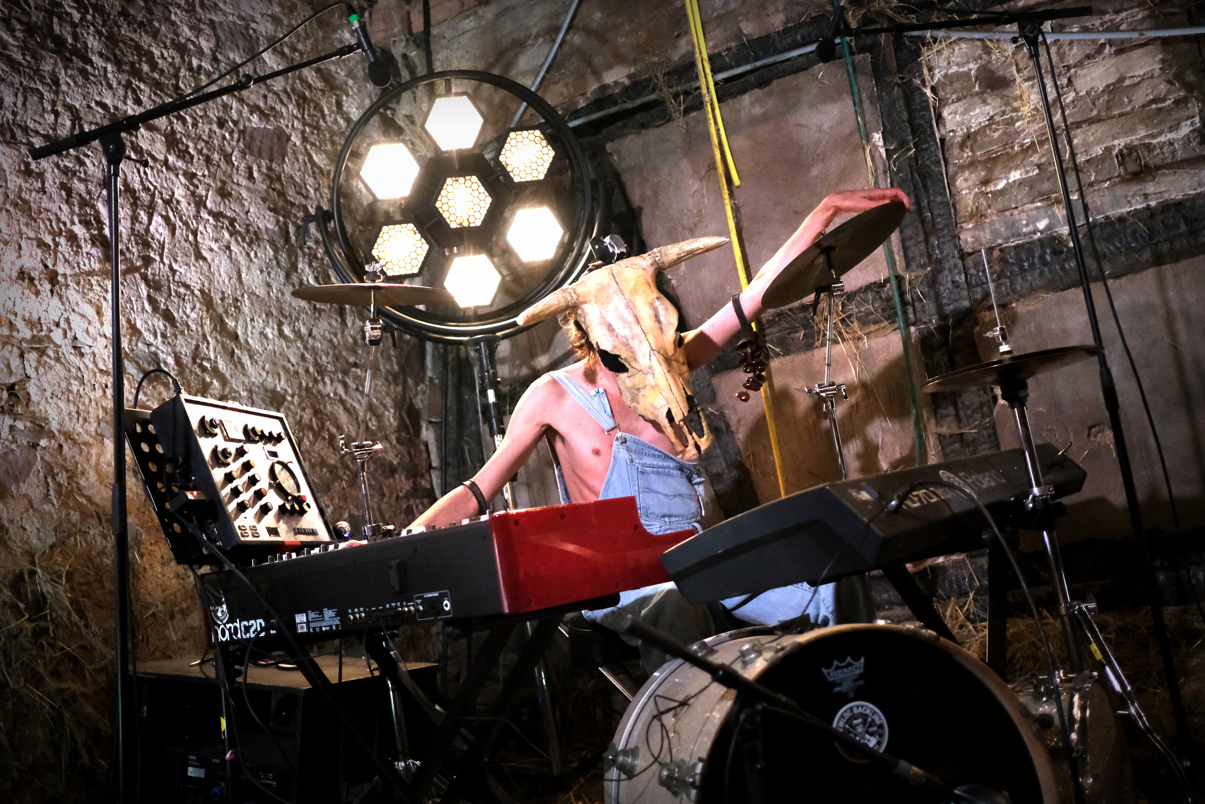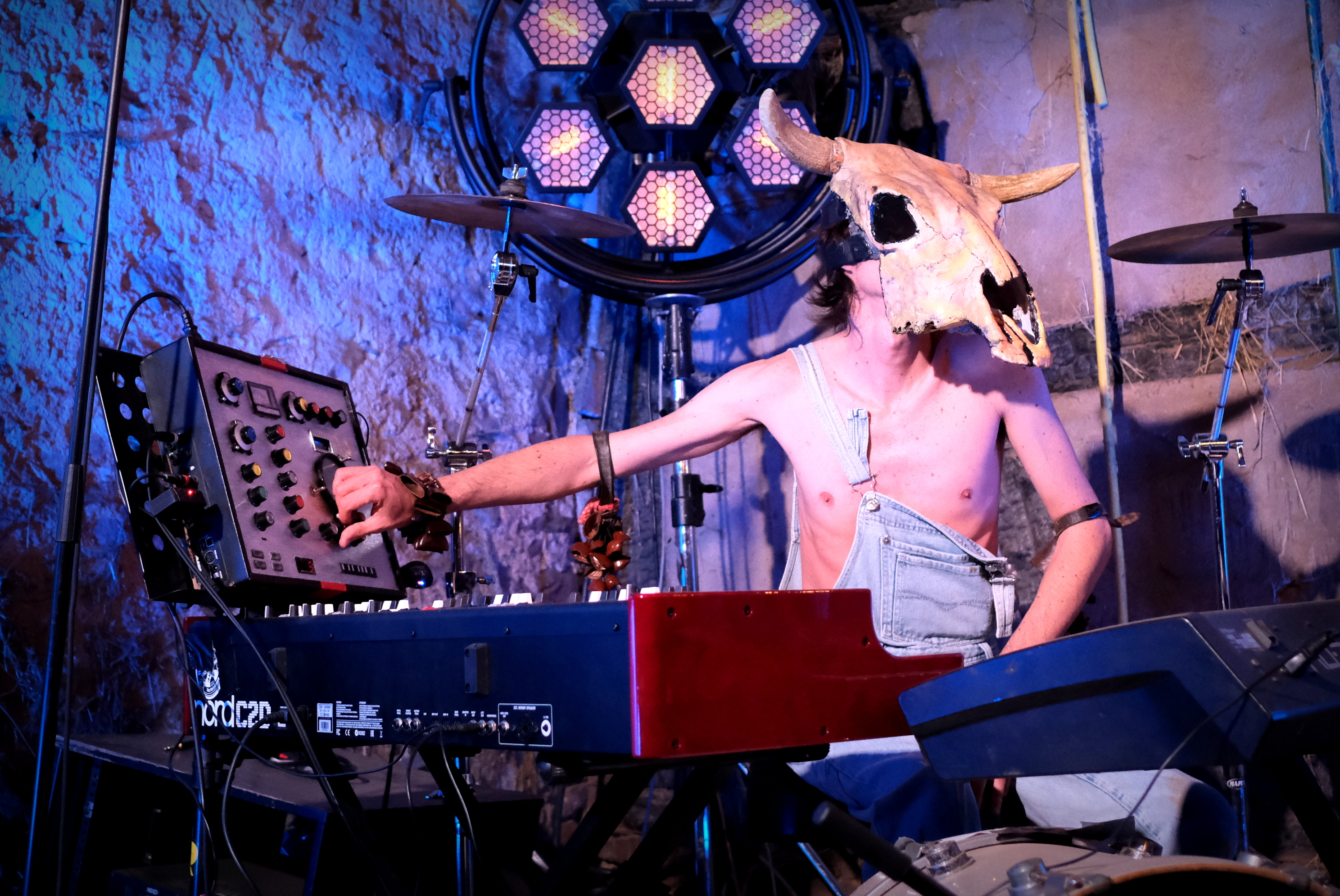 Reste à deviner l’artiste. Inutile de chercher. Inutile de tenter. Deux claviers, une batterie éclatée et aucun micro ne nous aideront pas suffisamment à comprendre ce qu’il va se passer. Un homme en salopette sur son torse nu, et à crâne de bovin enfoncé sur la tête arrive par l’arrière et fend la foule, en agitant ses bras et les bracelets shakers qui y pendent. Il s’installe derrière ses claviers et c’est parti pour 1h10 de boogie woogie endiablé. Voici le déjanté Vurro, venu tout droit d’Espagne.