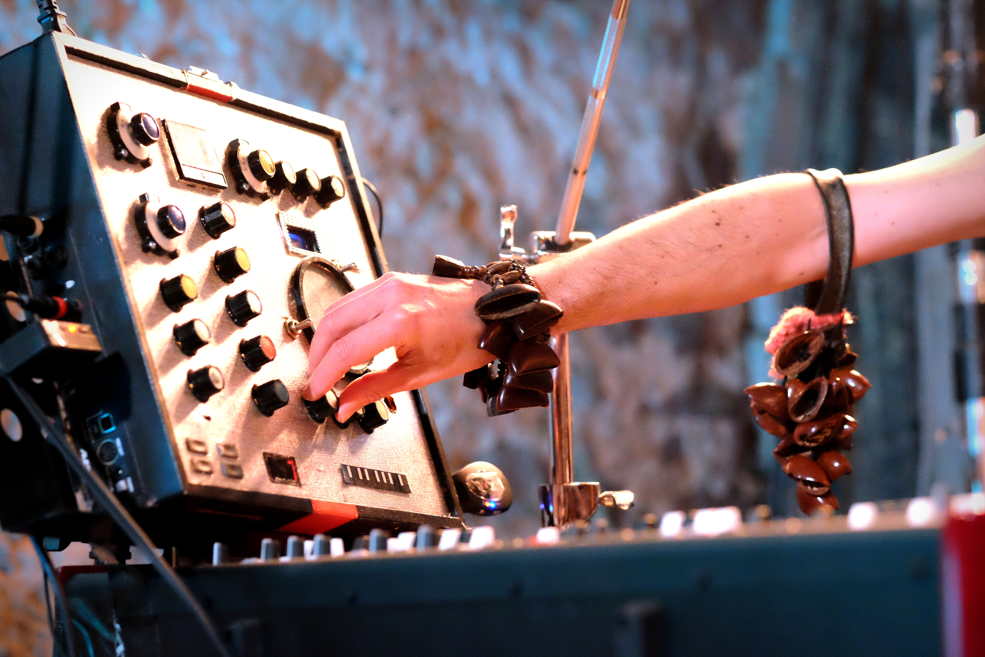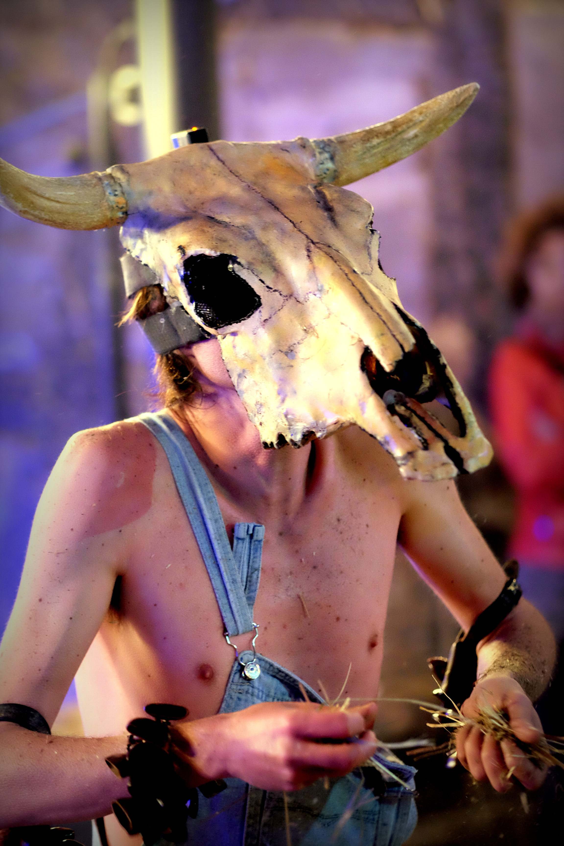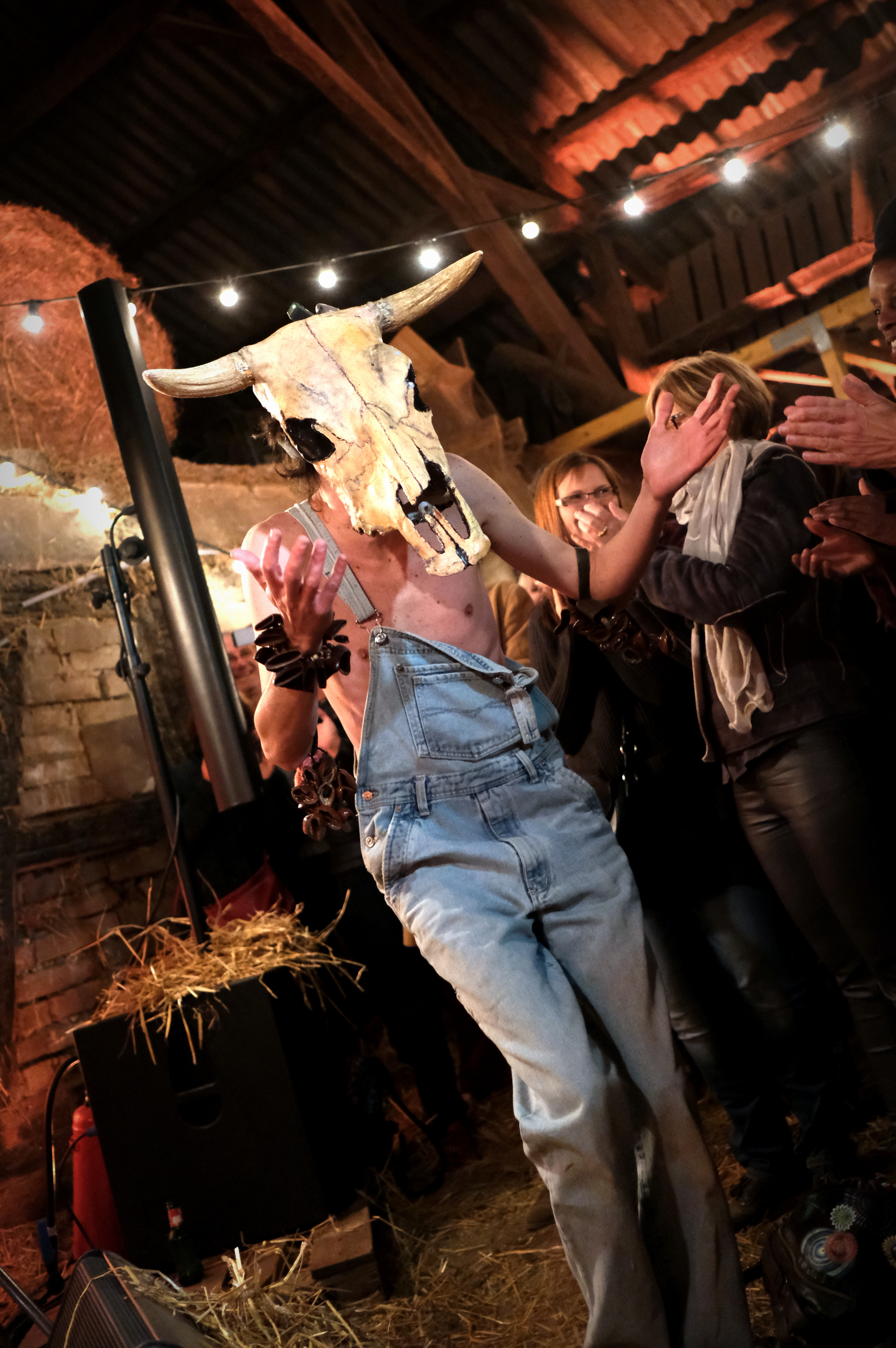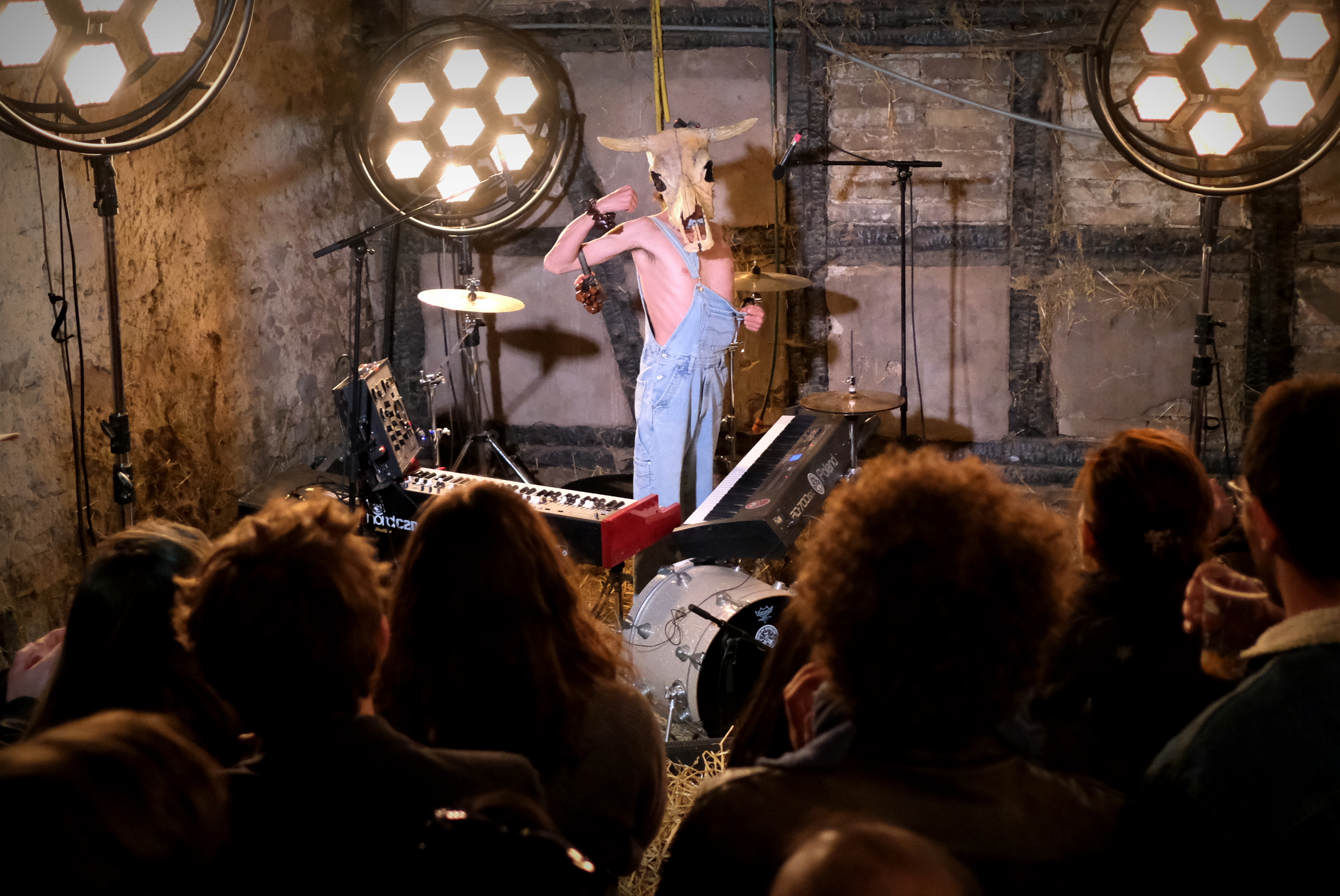 Reste à deviner l’artiste. Inutile de chercher. Inutile de tenter. Deux claviers, une batterie éclatée et aucun micro ne nous aideront pas suffisamment à comprendre ce qu’il va se passer. Un homme en salopette sur son torse nu, et à crâne de bovin enfoncé sur la tête arrive par l’arrière et fend la foule, en agitant ses bras et les bracelets shakers qui y pendent. Il s’installe derrière ses claviers et c’est parti pour 1h10 de boogie woogie endiablé. Voici le déjanté Vurro, venu tout droit d’Espagne.