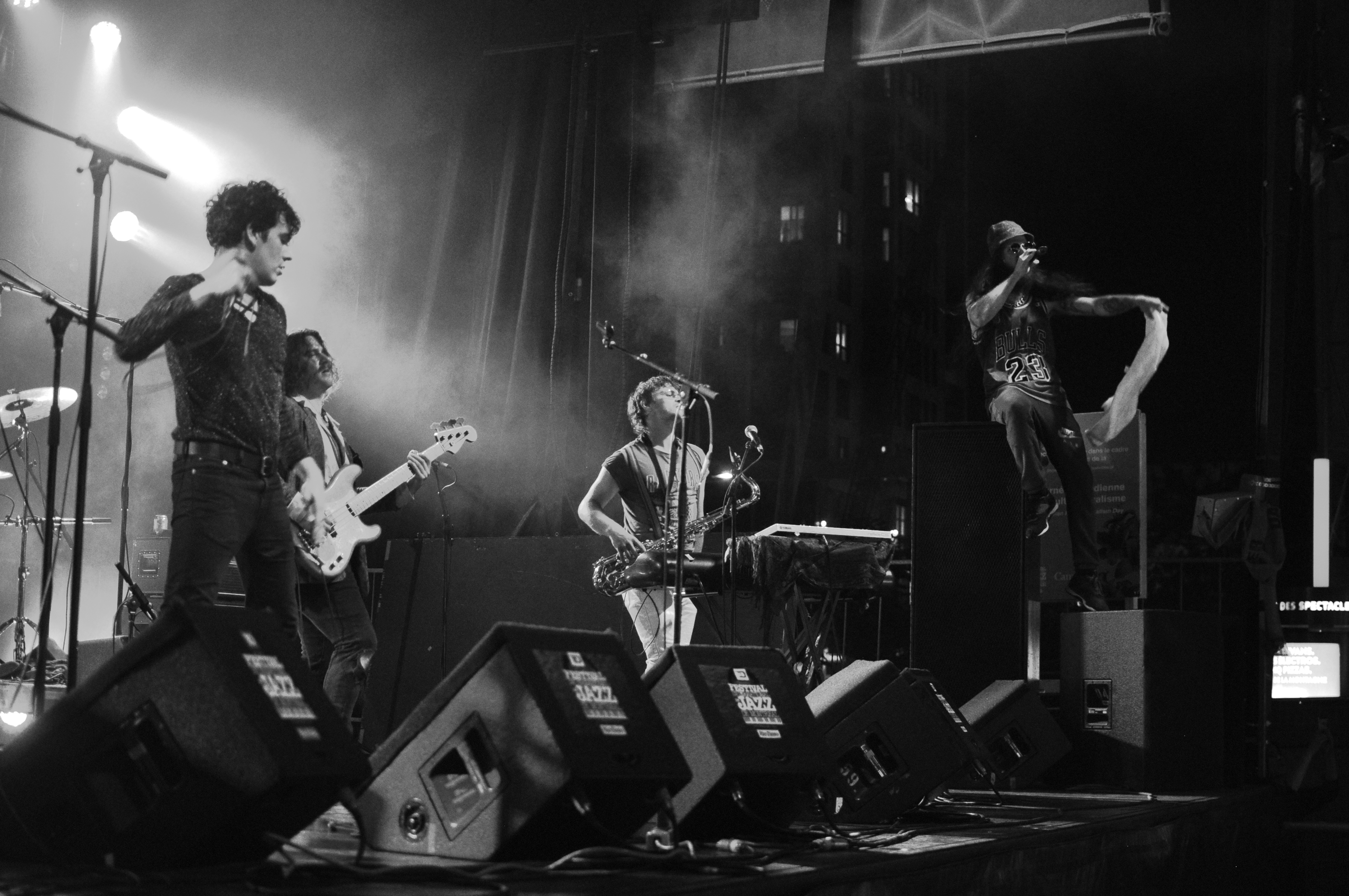 Si tu as connu The Seasons, tu connais, en plus de Julien (frère d’un certain Hubert Lenoir) un autre membre de Forest Boys en la personne de Rémi Bélanger, batteur dans ces deux groupes. Ajoute à ça Antoine Blanchet-Couture, un saxophoniste-claviériste, Yuri Yann Lépine un percussionniste-rappeur, Félix St-Pierre à la basse et tu as le quintet original. Parce que Festival de jazz, les garçons ont dans leurs rangs deux danseurs jazz-contemporain et un guitariste supplémentaire. L’histoire d’envoyer du pâté, et de rendre la fête (encore) plus folle.