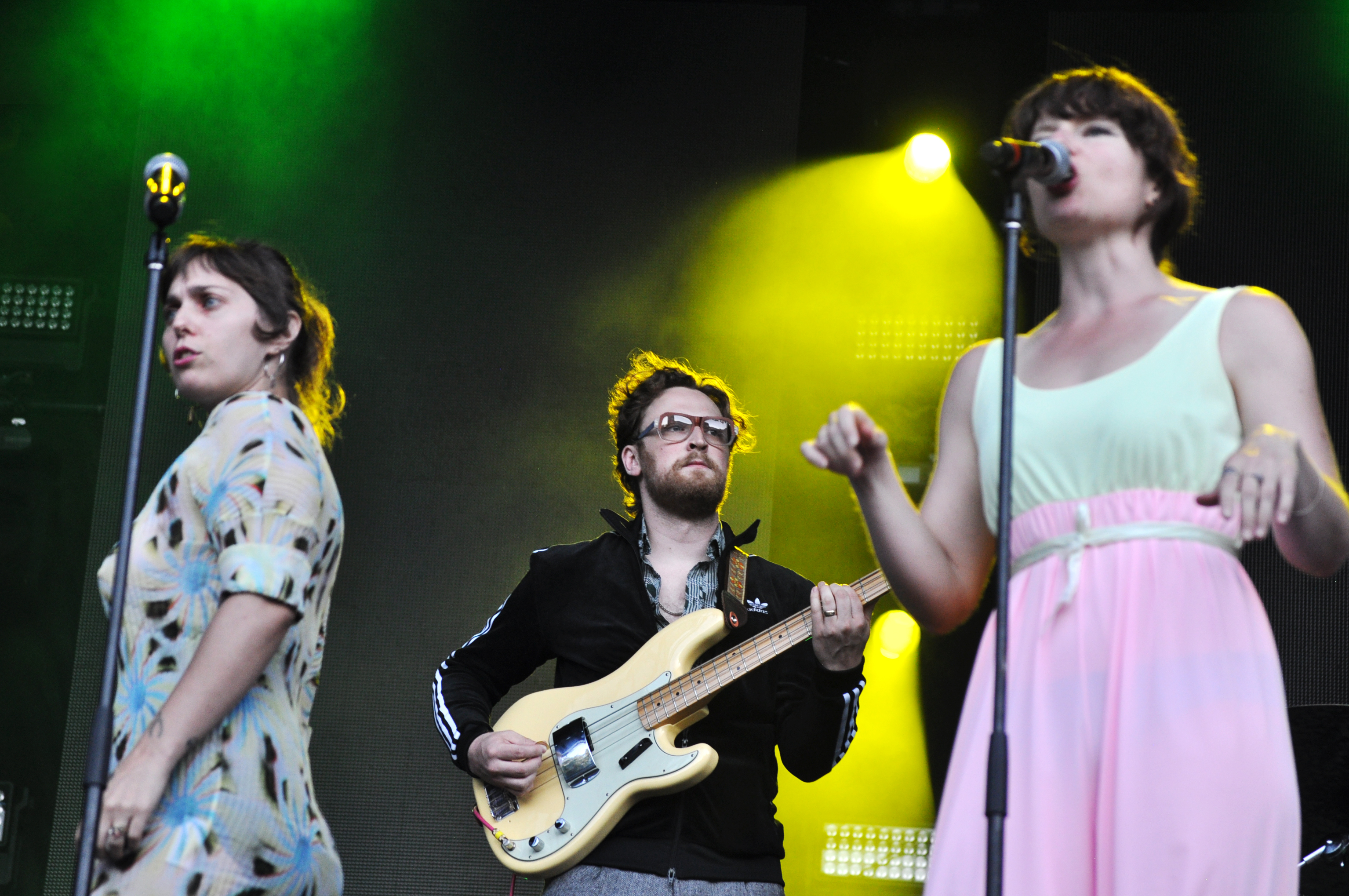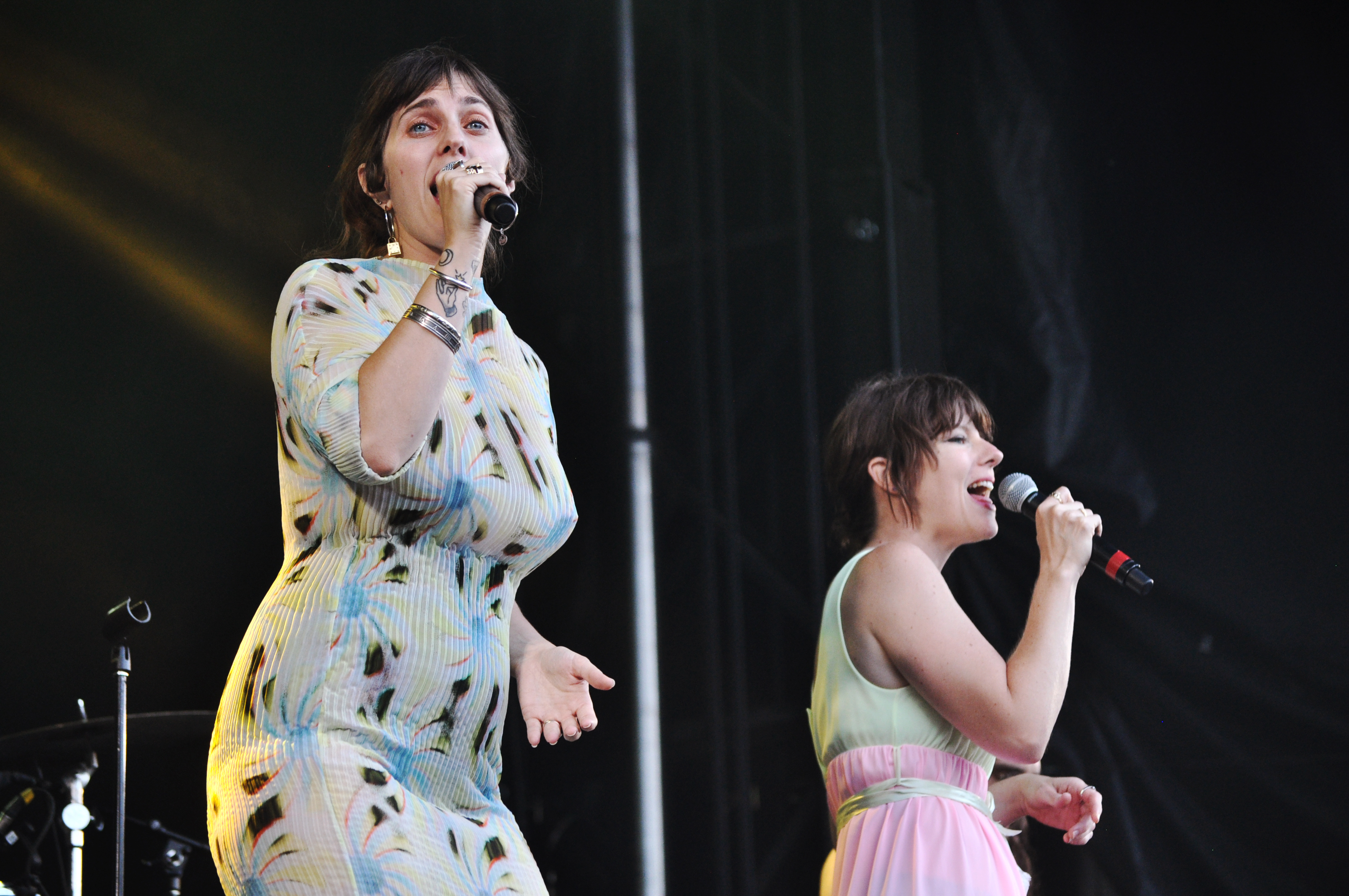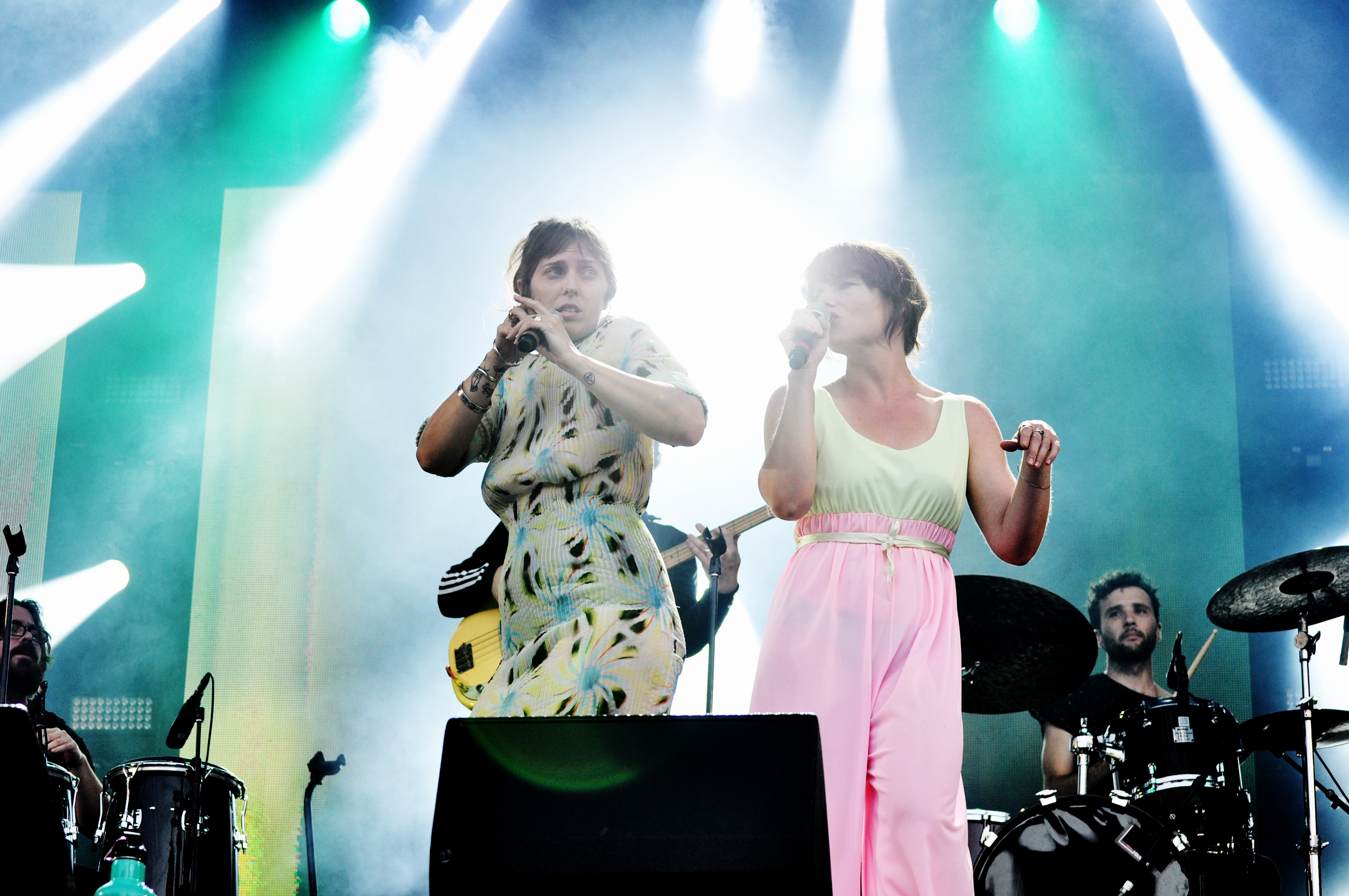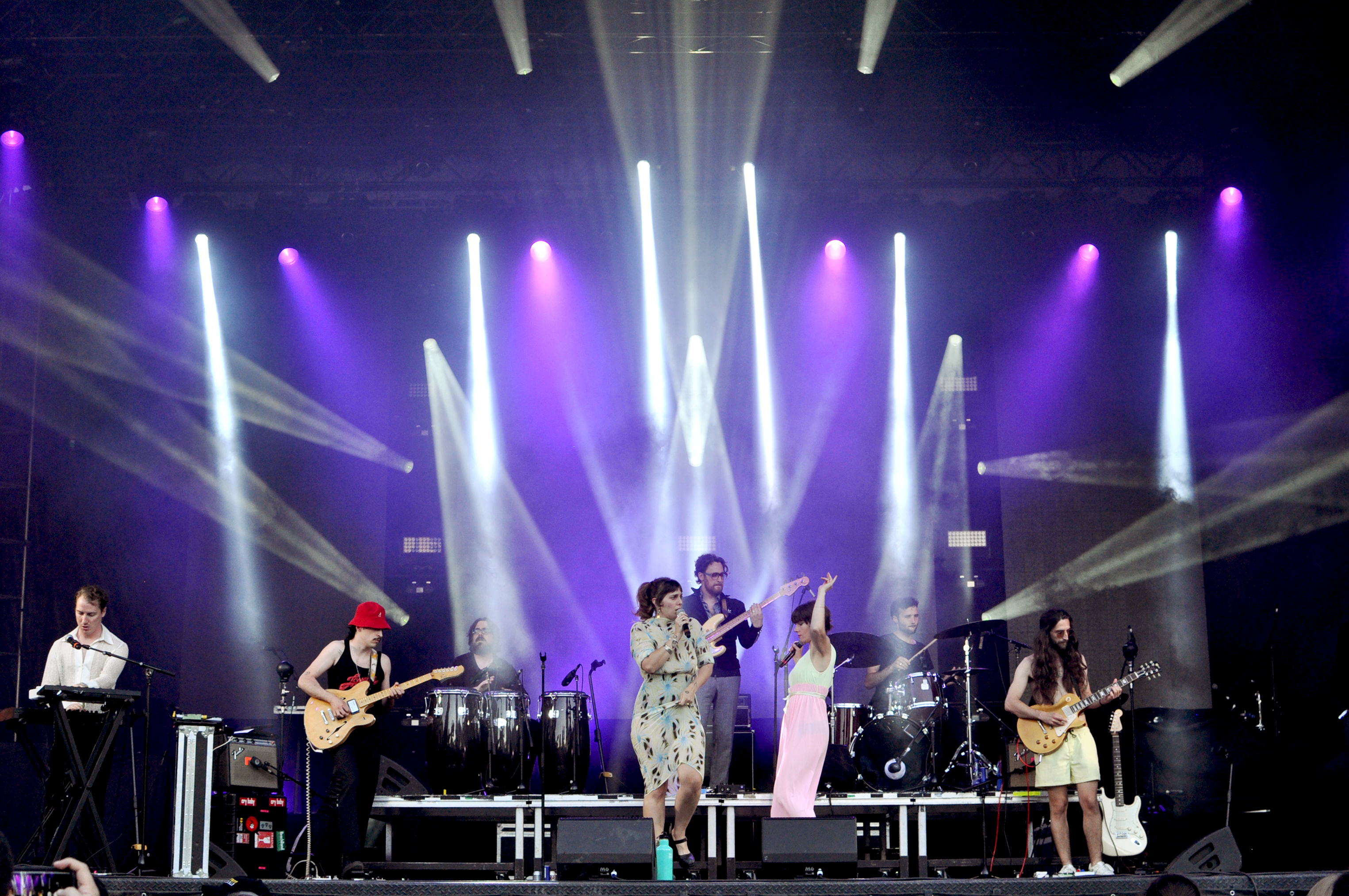 On ne savait pas à quoi s’attendre pour ce set glissé entre le concert d’Elliot Maginot et de Cœur de Pirate. Curieux choix des programmateurs. Le show de U.S. Girls commence dans l’enthousiasme des six musiciens accompagnant le théâtral duo féminin mené par l’extravagante Meg Remy. “Let’s fucking go!” glisse le percussionniste derrière ses congas à ses camarades de jeu. Deux guitares et un saxophone (en plus de la batterie, de la basse et des claviers) viennent apporter une certaine pesanteur aux arrangements pop-rock qui pâtissent un peu du manque de clarté.