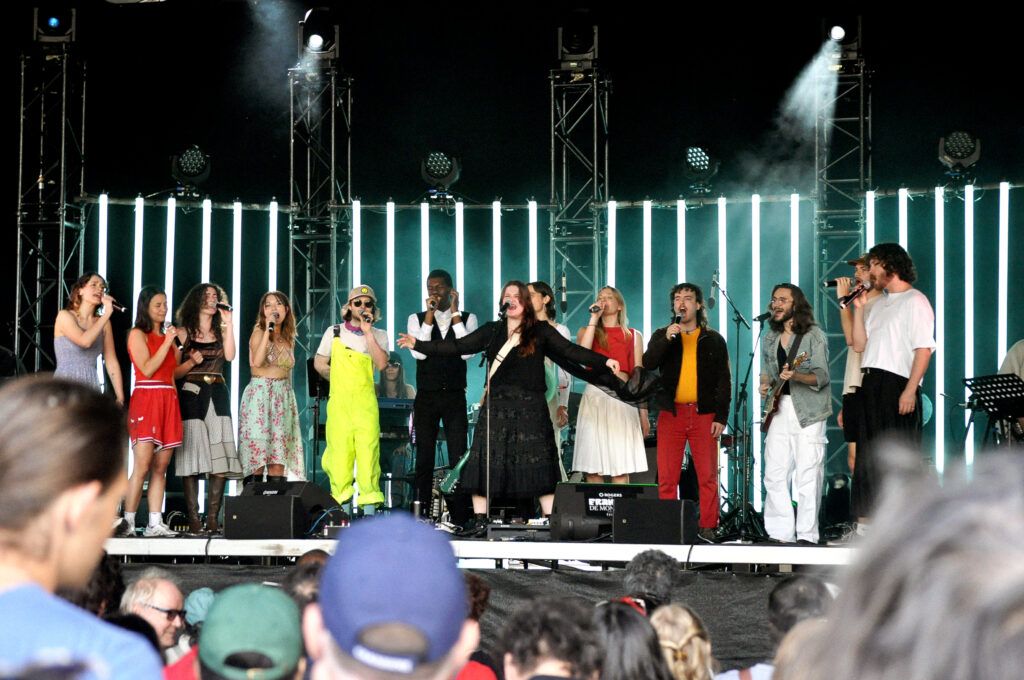 Vêtue d’un ensemble à paillettes roses, des bottes argentées et des rubans bleus tressés dans les cheveux, Lou-Adriane Cassidy apparaît sur la grande scène Rogers, et va l’arpenter comme un poisson dans l’eau. Elle est entourée de ses musiciens historiques (à sa gauche Thierry Larose, et Alexandre Martel à sa droite, tout deux vêtus de costumes pour l’occasion) et deux choristes supplémentaires pour soutenir Odile Marmet-Rochefort, en la personne de Mariève Harel-Michel (Bayta) et de Jeanne Laforest.