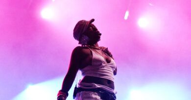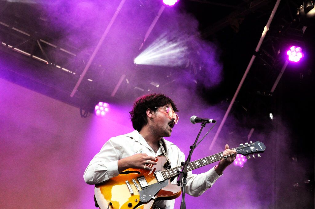 Les sept musiciennes et musiciens de Velours Velours prennent place sur la scène Spotify, c’est leur tour ! Les canons de fumée sont en place pour l’entrée de Raphaël Pépin-Tanguay. Avec sa chemise blanche ornée et ses grosses lunettes roses, le Québécois prend place au milieu de sa ligne d’amis pour entamer le spectacle en bonne et due forme par “L”intro” de son premier album, Quand je pleure je suis content.
