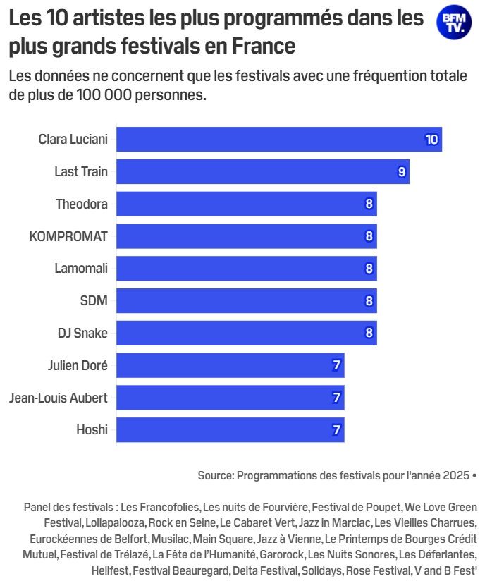 On n’aime pas citer BFM mais enfin voilà, ils ont toute de même sorti une petite infographie bien utile pour cet été : celles des groupes les plus programmés sur l’ensemble des festivaliers à plus de 100 000 festivals.