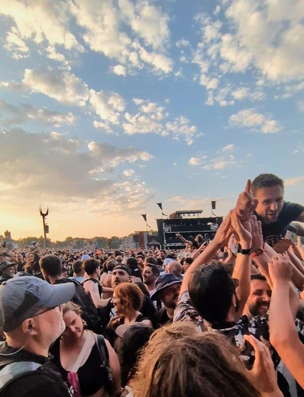 Les concerts vont ensuite s’enchaîner jusqu’à 2h10 en alternance sur les 2 scènes principales. On commence par The Hu qui tient toutes ses promesses. Cette troupe de musiciens venus de Mongolie nous embarque dans leur univers, mêlant instruments traditionnels et langue mongole avec les marqueurs de la musique métal. J’adore ce son qui prend aux tripes, on danse, on saute et on vibre tous ensemble. Et quel plaisir de voir que les membres du groupe sont vraiment heureux de partager leur musique avec le public. J’assiste même à une improvisation de rameur géant dans la foule qui s’assied et rame en rythme. Ce sera pour moi un des concerts coup de cœur de cette édition 2025.