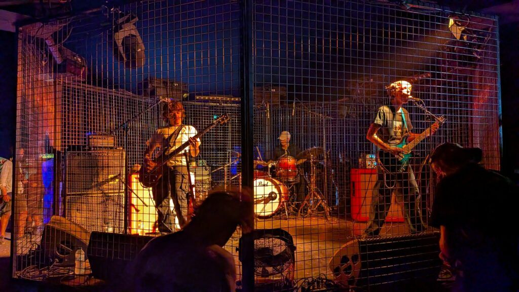 Dans un autre style (rien à voir mais c’est ça aussi le plaisir du Hellfest), j’ai assisté à un concert en cage sous la Purple House! C’était aussi des parisiens mais un jeune groupe : Gehen. Pour le coup, les spectateurs n’étaient vraiment pas nombreux mais les quelques dizaines de curieux ont tout donné autour de cette cage à 360⁰.