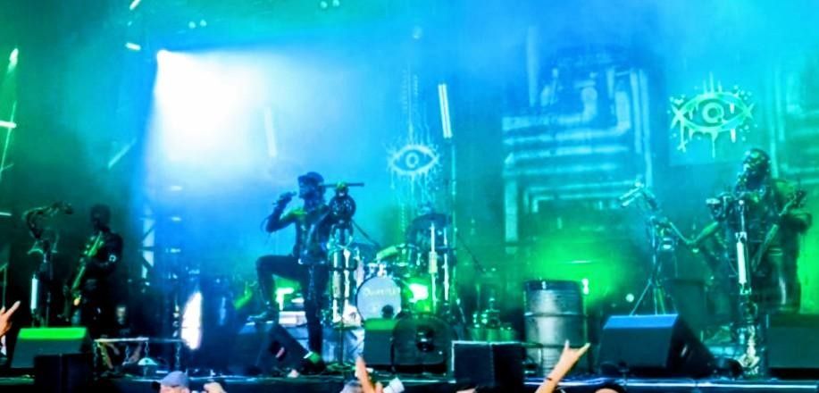 Sous la Temple, on assiste au concert des parisiens déjantés de Shaârghot. Entièrement peints en noir, avec des costumes mélangeant cyberpunk et horreur, c’est un véritable spectacle qu’ils proposent. Shaârghot n’est pas seulement un groupe, ils ont tout un monde inventé depuis 2010, qui ne cesse de s’enrichir des idées créatives proposées par Etienne Bianchi. En plus d’incarner le personnage du Shaârghot sur scène et de chanter, c’est lui la tête pensante de tout cet univers postapocalyptique qui est magnifiquement mis en scène à grand renfort de costumes et d’accessoires. Un plaisir à regarder et je ne suis pas la seule à l’avoir pensé car nous étions très nombreux malgré la chaleur pesante sous la Temple.