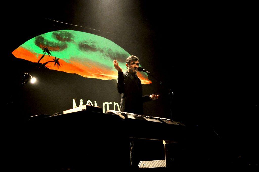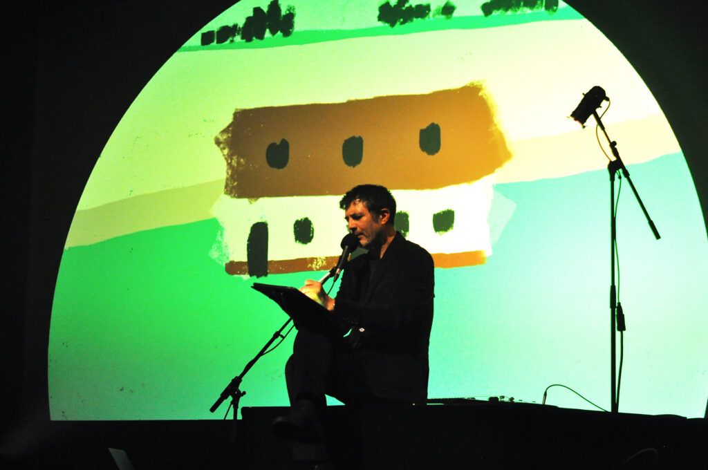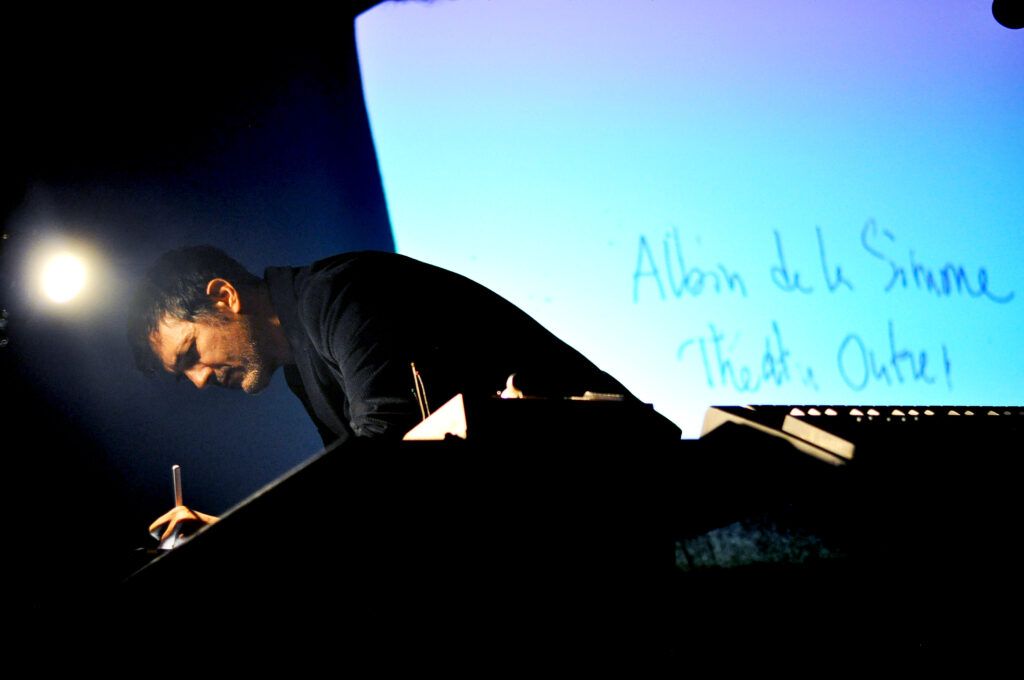 Le Français présente son dernier album Toi là-bas (encore) version solo. Albin, son synthétiseur relevé, son springophone, sa guitare électrique et sa tablette. Car pour ce spectacle-ci, il dessine en live. Son écran est retransmis derrière lui. Ses illustrations ont un petit côté naïf. Des grands aplats de couleurs, et puis des détails qui paraissent enfantins. Il efface, ajoute des détails, change les ambiances. Il dessine même parfois “avec son esprit”. Comprendre qu’il a pré-enregistré certains dessins pour lui permettre de jouer et chanter tout en ayant l’illustration qui prend vie derrière lui.