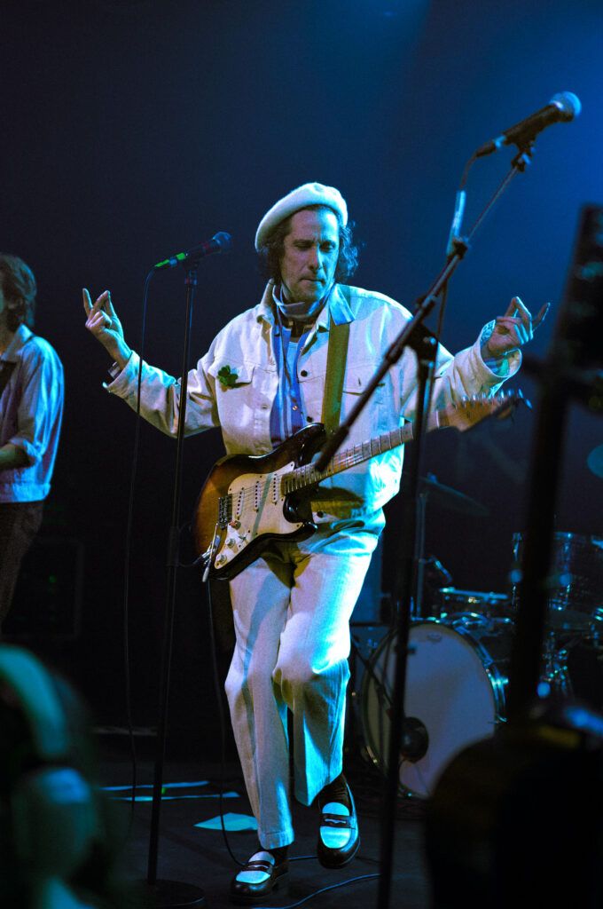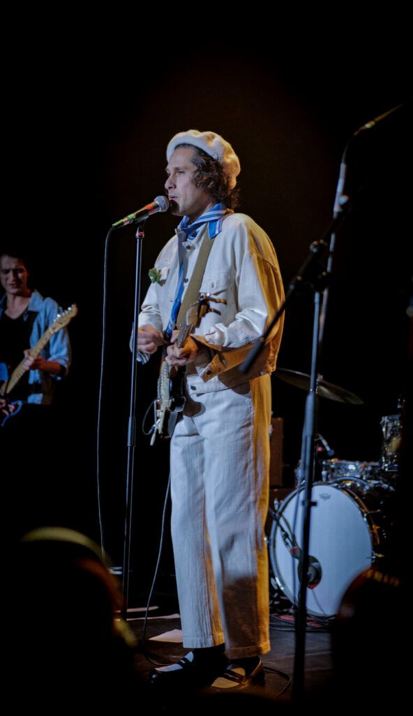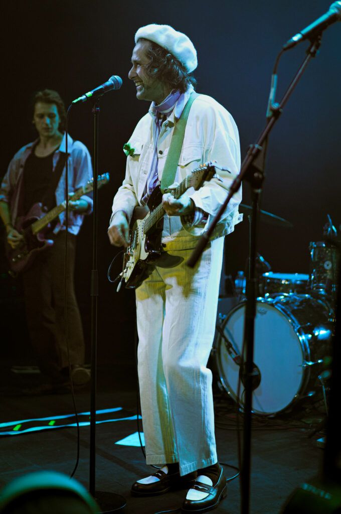 Quand Polycarpe arrive sur scène, l’atmosphère change. Débarque ce drôle de bonhomme affublé d’un béret et chaussé de ses plus beaux mocassins, tout en blanc, qui semble sorti tout droit de l’imagination de Tim Burton. Tout de suite, les premiers morceaux s’enchaînent et on voit sur scène avant tout un passionné, concentré sur sa guitare. Mélanges de styles, les morceaux sont mélodieux et l’énergie scénique est très belle. On sent une vraie présence et une volonté de partager ce moment avec le public. Des chansons en anglais et en français, aux accents parfois plutôt pop, parfois plutôt rock. Accompagné de deux musiciens, un batteur et un guitariste, Polycarpe enchaîne les morceaux, avec en introduction parfois une petite touche d’humour pince-sans-rire. C’est innovant, et, l’espace d’un instant toute la salle est transportée dans son univers teintés de pop, de rock et de 70’s.