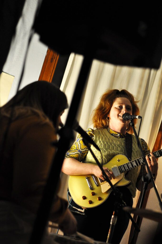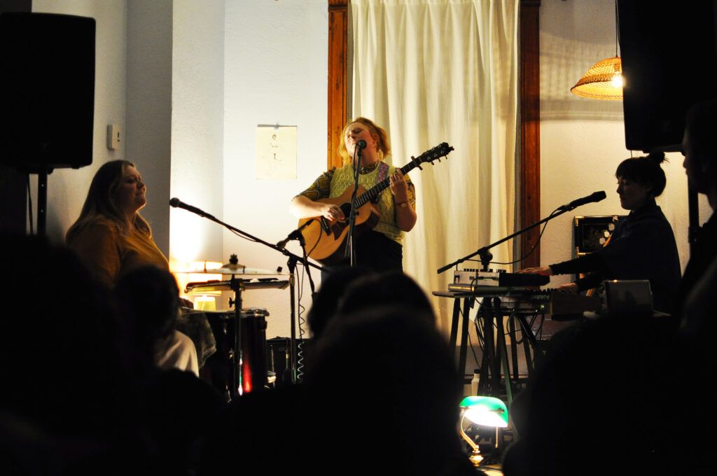 Pas d’affiche, pas d’événement Facebook. Puisque Claire Morrison invite les spectateurs chez elle, le nombre de places est limité. Il est donc fortement recommandé de prévenir de sa venue. On se sent presque comme du temps de la Prohibition et surtout très privilégié d’assister à cet événement. Au final, quand on débarque vers 19h dans l’entrée de l’appartement, un rang d’oignons de chaussures nous attend. Les manteaux peinent à tenir sur les accroches. Plusieurs dizaines de personnes discutent et boivent un verre dans la cuisine au fond. La majorité est déjà assise dans le salon, transformé en salle de concert cosy et chaleureuse pour l’occasion.