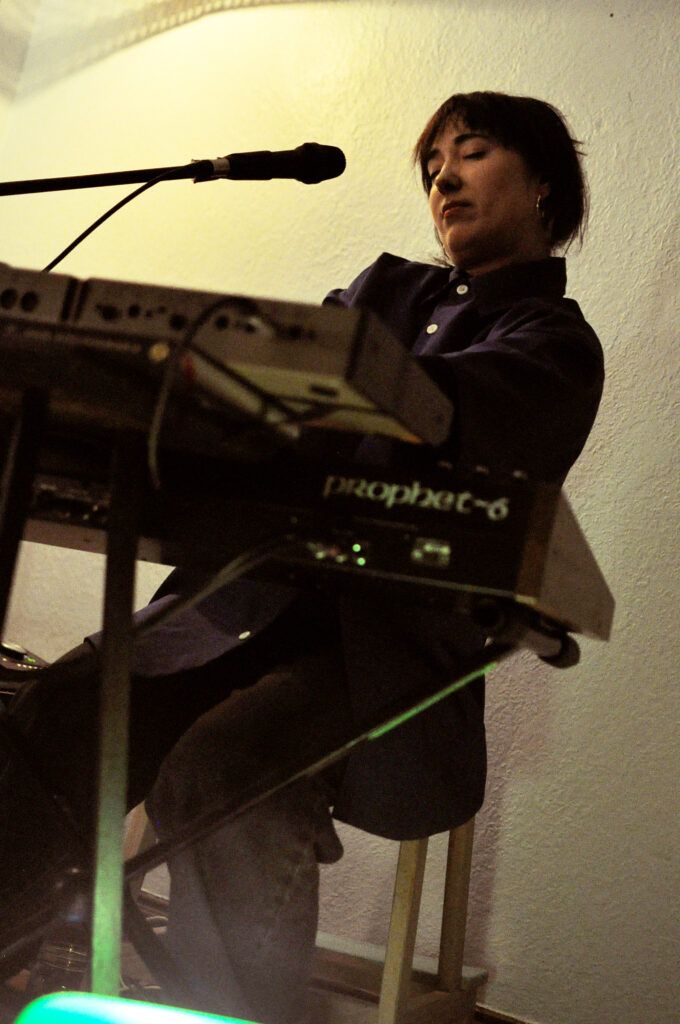 Si au début Claire semble nerveuse, ça ne prend pas de temps avant que les mélodies et les harmonies vocales l’ancrent (“I Fly”, “Around Here”). Sur sa gauche, Judith sa meilleure amie québécoise et complice se scène chante et joue des percussions. Sur sa droite, Rayannah chante également et planche sur son clavier Prophet et ses machines. Claire au milieu, la seule debout assure le chant, la guitare et l’animation. Le son est parfait pour un spectacle de salon, on ne s’attendait pas à une telle qualité.
