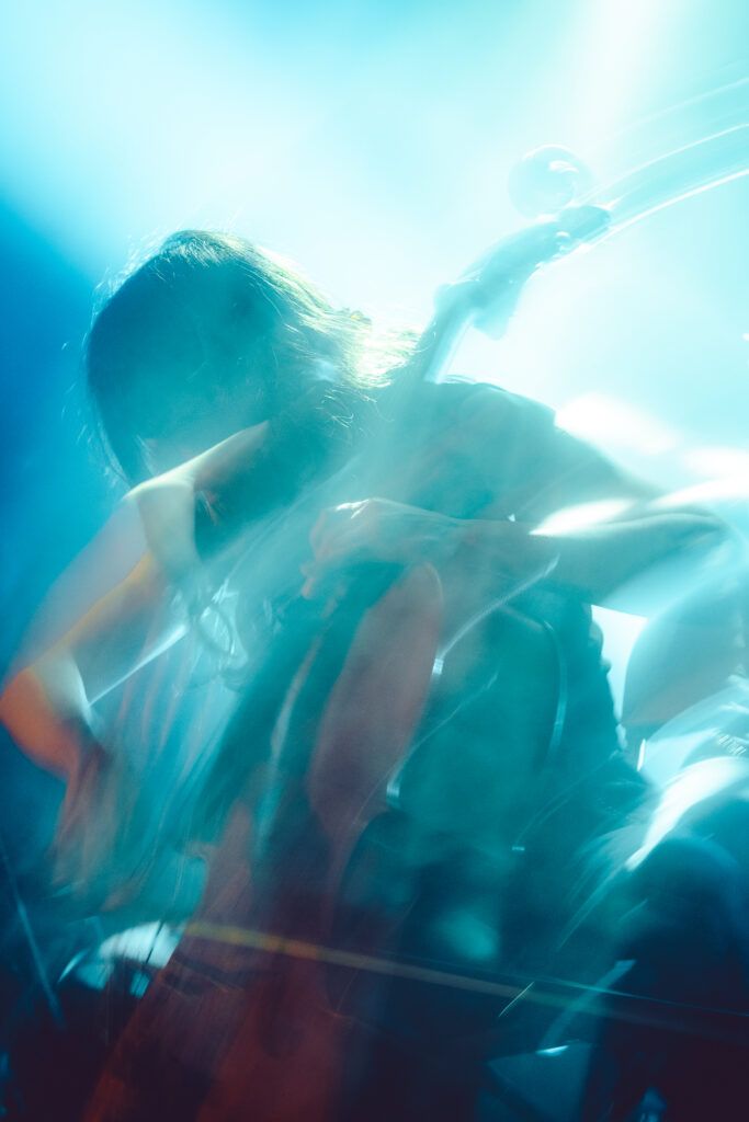 Mais d’abord, Cécile Lamarche. Elle est violoncelliste, connaît bien Hugo Barriol, avec qui elle a notamment partagé une tournée en Australie, et assure sa première partie ce soir. Trois morceaux seront joués. Seule avec son cello, et quelques pédales, elle déploie des titres qui semblent se construire au gré des vagues qui l’animent à l’intérieur. Elle expliquera, pour son dernier titre “Fugue”, qu’il s’agit d’un morceau composé après la dissolution inattendue de l’Assemblée Nationale par Emmanuel Macron il y a deux ans. Le public comprend, et écoute religieusement tout en regardant le ballet des mains et de l’archet sur les cordes. Une parfaite entrée en matière pour la suite.