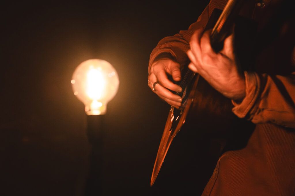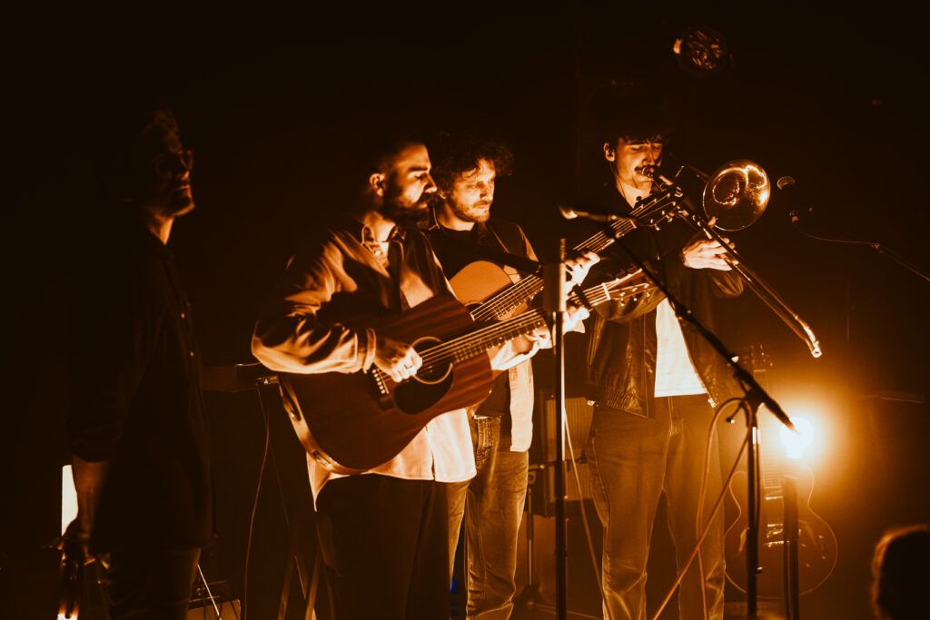 Les trois musiciens d’Hugo Barriol s’installent dans la pénombre, avant que lui-même ne se présente avec sa guitare, à la seule lumière des ampoules disposées sur scène. L’ambiance est posée. Je distingue dans le fond un trombone qui attend sagement, et ai hâte que les lumières se fassent un peu plus vives, un peu plus directes, pour profiter pleinement du groupe. C’est que je n’ai vu Hugo Barriol qu’en solo dans le passé. Et avec le concert de Leif Vollebeck deux jours plus tôt, les envies de belles lumières me reprennent. Je les attendrai tout le concert malheureusement. Enfin, les lumières ont été belles. Mais toujours tamisées, éclairant par l’arrière, et entourées de cette petite fumée homogène si habituelle dans les salles françaises. Tant pis pour le fond de scène…