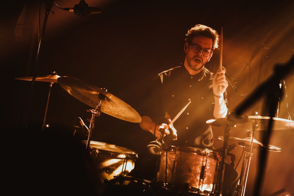 L’avantage néanmoins avec ces lumières, c’est que l’ambiance intimiste est vite créée. Cette ambiance au coin du feu, qui contraste avec la pluie ininterrompue de la journée. Et qui colle parfaitement à la setlist, toute en douceur. “The Wall”, “Hey Love”, “Cassis”… Dès le départ, on comprend que les titres seront donc un subtil mélange d’ancien et de nouveau. Ce qui, forcément, séduit le public. On continue encore plus dans l’ambiance feutrée quand le groupe entier se réunit autour de l’ampoule centrale pour deux titres en acoustique, “Forgiveness” et “Always”. Un vrai moment suspendu dans une Maroquinerie aux anges. Le public ne se fera pas prier ensuite pour chanter en chœur les “allez, allez” de “Je pars avec toi”, seule chanson en français du set. Arrive ensuite Cécile, pour ajouter son violoncelle et une touche de grandeur aérienne.