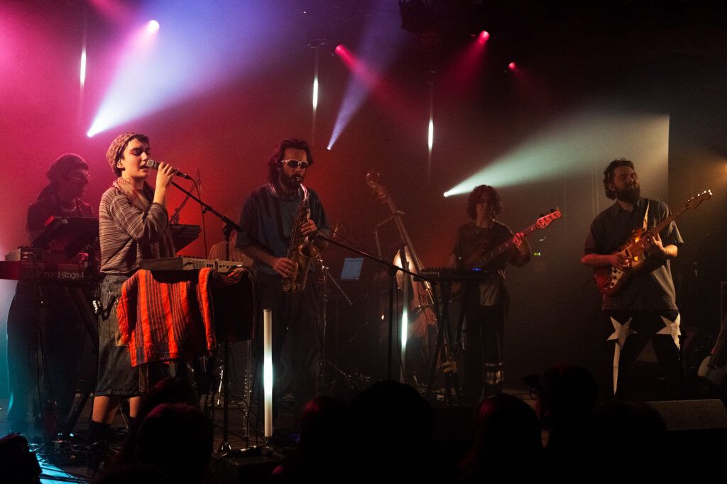 Nomile Leclair, à la (belle) voix, d’abord campée derrière son petit synth en coin de scène finit par l’investir et combler le vide du milieu de scène. C’est mieux. En plus des cinq membres du groupe, Noah Tremblay-Mimouni (Muhoza et sa troupe) agrémente les arrangements de lignes de saxo suaves et de quelques percées de flûte traversière. Le groove est solide et le public en profite avec enthousiasme et léger fanatisme. Chaude Chaleur est venu jouer et ne souhaite pas trop parler pour dispose de leurs 30 minutes allouées. “Ni homme, ni femme, enfant du chaos” chante le groupe qui rappelle aussi que leur single “Chambre noire” sorti aujourd’hui, est désormais disponible partout. Sauf sur Spotify. Fort bien. Pour la deuxième fois de la soirée, le Lion d’Or est debout, et on entend des “Chaude Chaleur ! Chaude Chaleur !” suivis de “J’ai chaud ! J’ai chaud !” qui nous amusent bien.