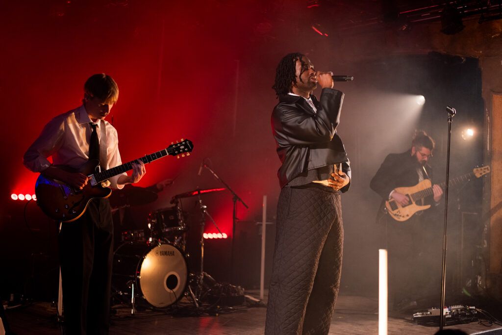 Dernier à passer, Komēdza semble bien seul sur scène (et pourtant si imposant en taille et présence). Ses trois musiciens (Ismael Chagnon aux drums, Antoine St-Onge de Malaimé Soleil à la basse, et Julien Thibodeau à la guitare) coincés en fond de scène, accompagnent le Québécois d’origine togolaise. Ils ont tous revêtus leur plus belle chemise et costume des grandes occasions. Par-dessus, des séquences (cordes, chœurs…) pourtant bien calées, font parfois tâche avec les musiciens. On ne comprend pas bien le mariage et le dosage. Avec son timbre de basse et ses lignes vocales à la Lomepal et ses influences afro-rap très françaises (il cite Luidji, on pense aussi à Gaël Faye, à Gims aussi), Komēdza mêle des sonorités d’Afrique de l’Ouest au rap mainstream.
